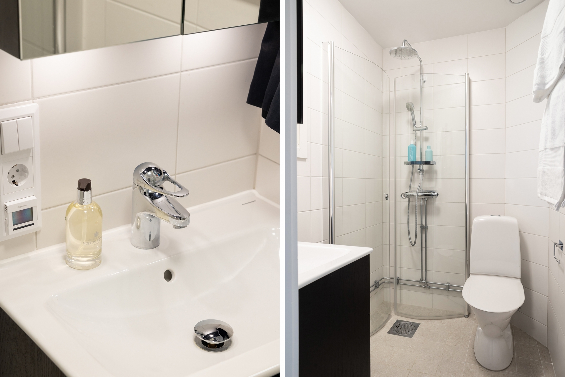 - Duschutrymmen, på våningsplan 1-4 finns gemensamma duschutrymmen. Enbart boende utan egna duschar har tillgång till husets allmänna duschutrymmen.