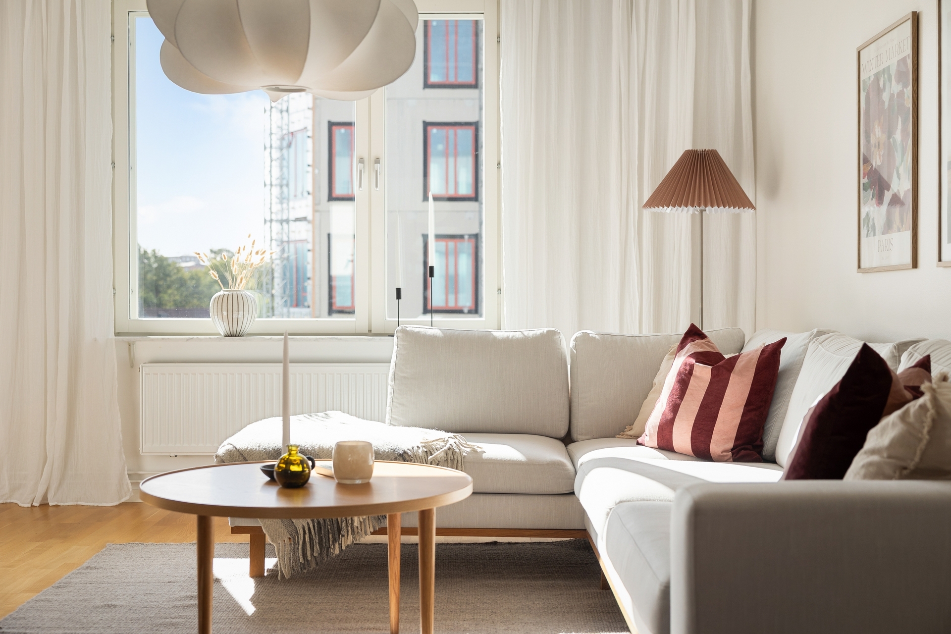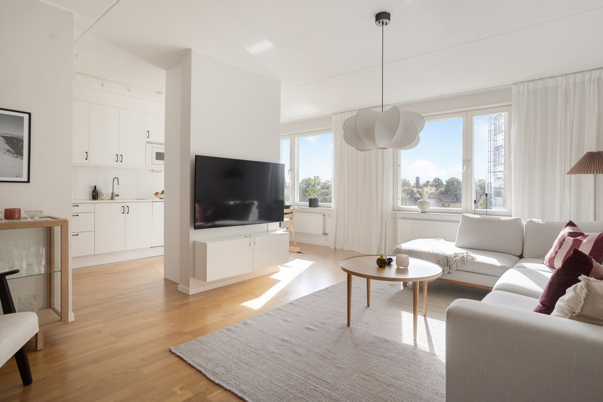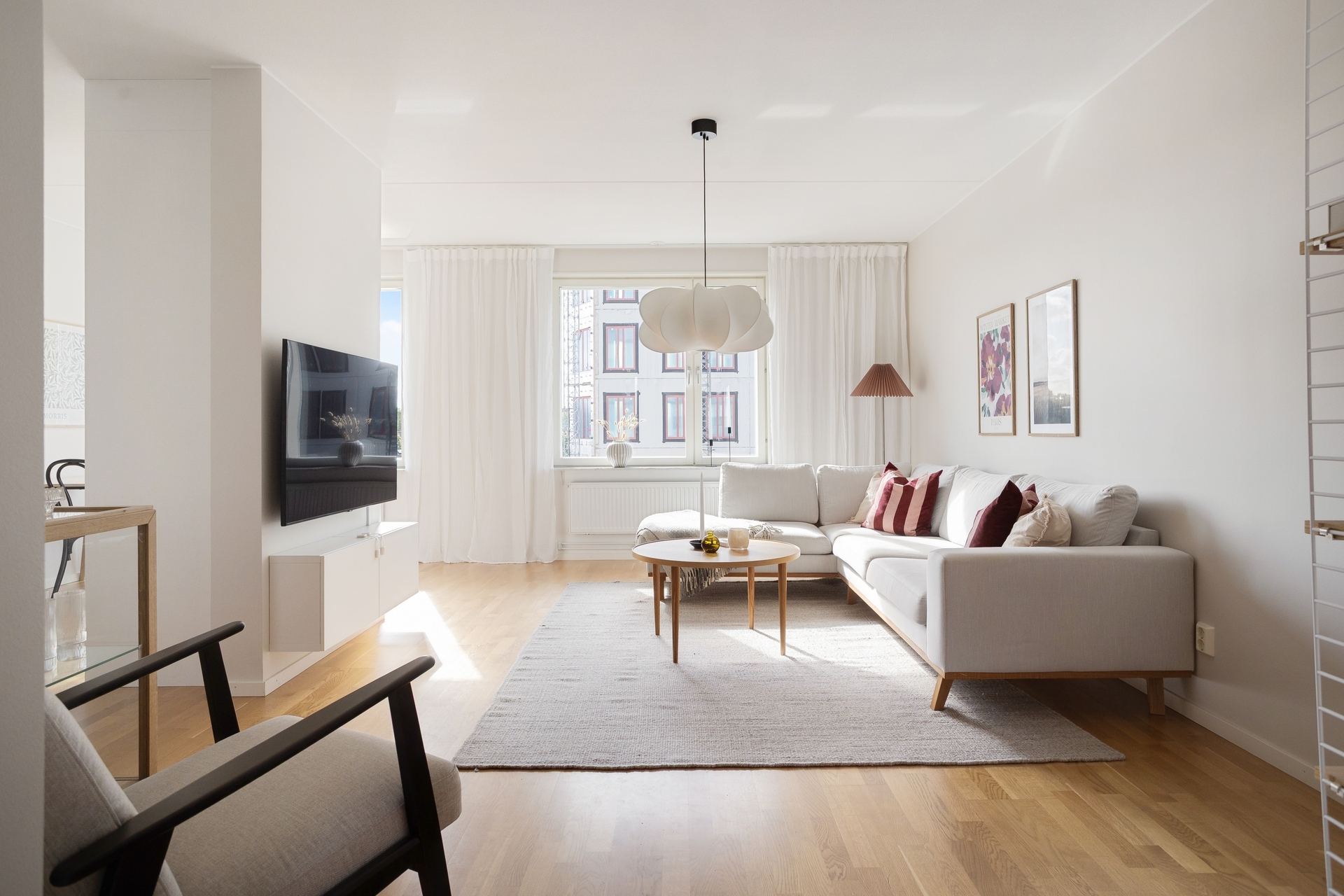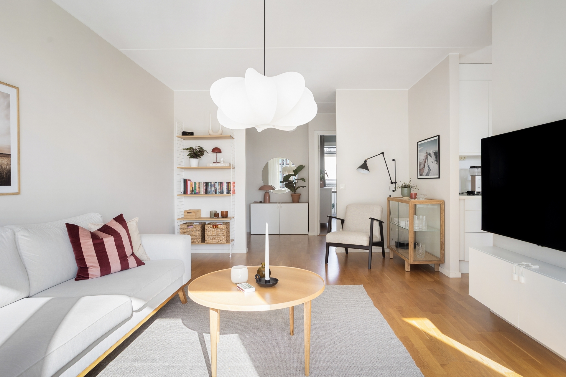 Öppet och ljust vardagsrum som rymmer soffa, fåtölj, soffbord samt TV-möbel. Bostaden bjuder på ett underbart ljusinsläpp genom sina generösa fönsterpartier. I vardagsrummet ryms även bokhylla eller arbetsplats för den som arbetar hemma.