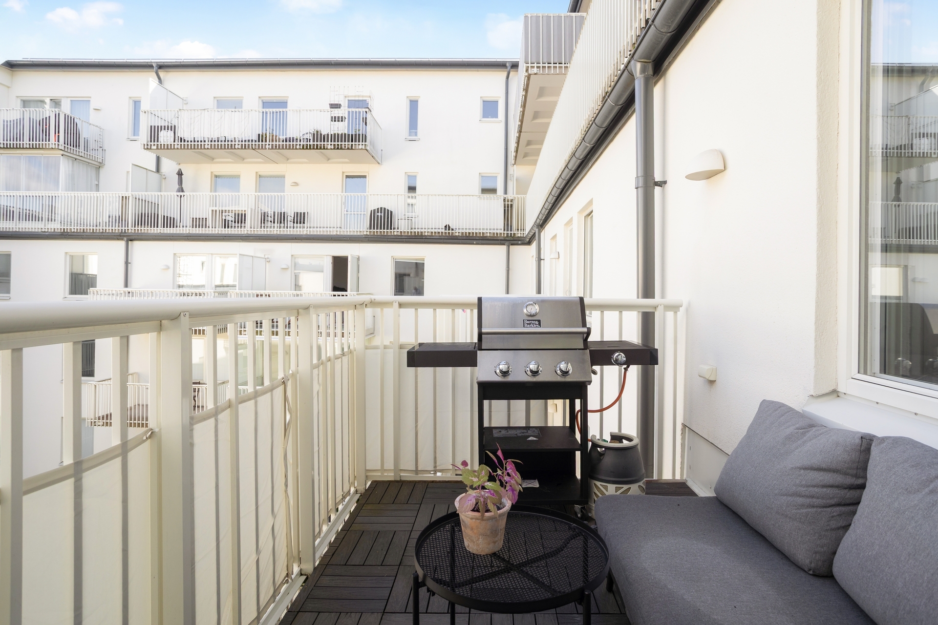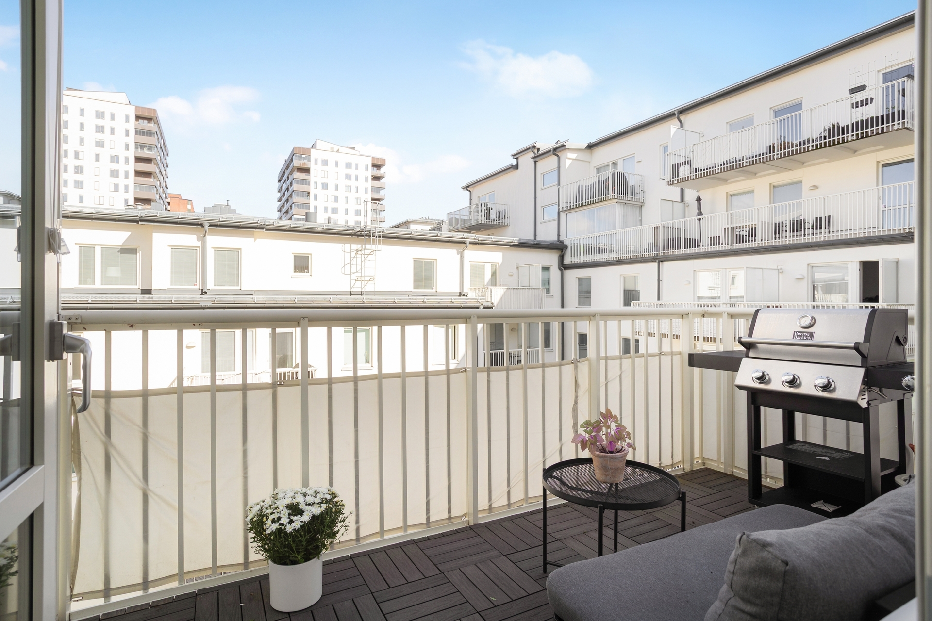 Balkongen vetter mot innergården. Möblera med loungemöbel och bord och stolar om ni önskar. Golvet är belagt med högkvalitativ komposittrall. Njut av förmiddagssol på denna underbara balkong och det är tillåtet att grilla med gasol eller el-grill.