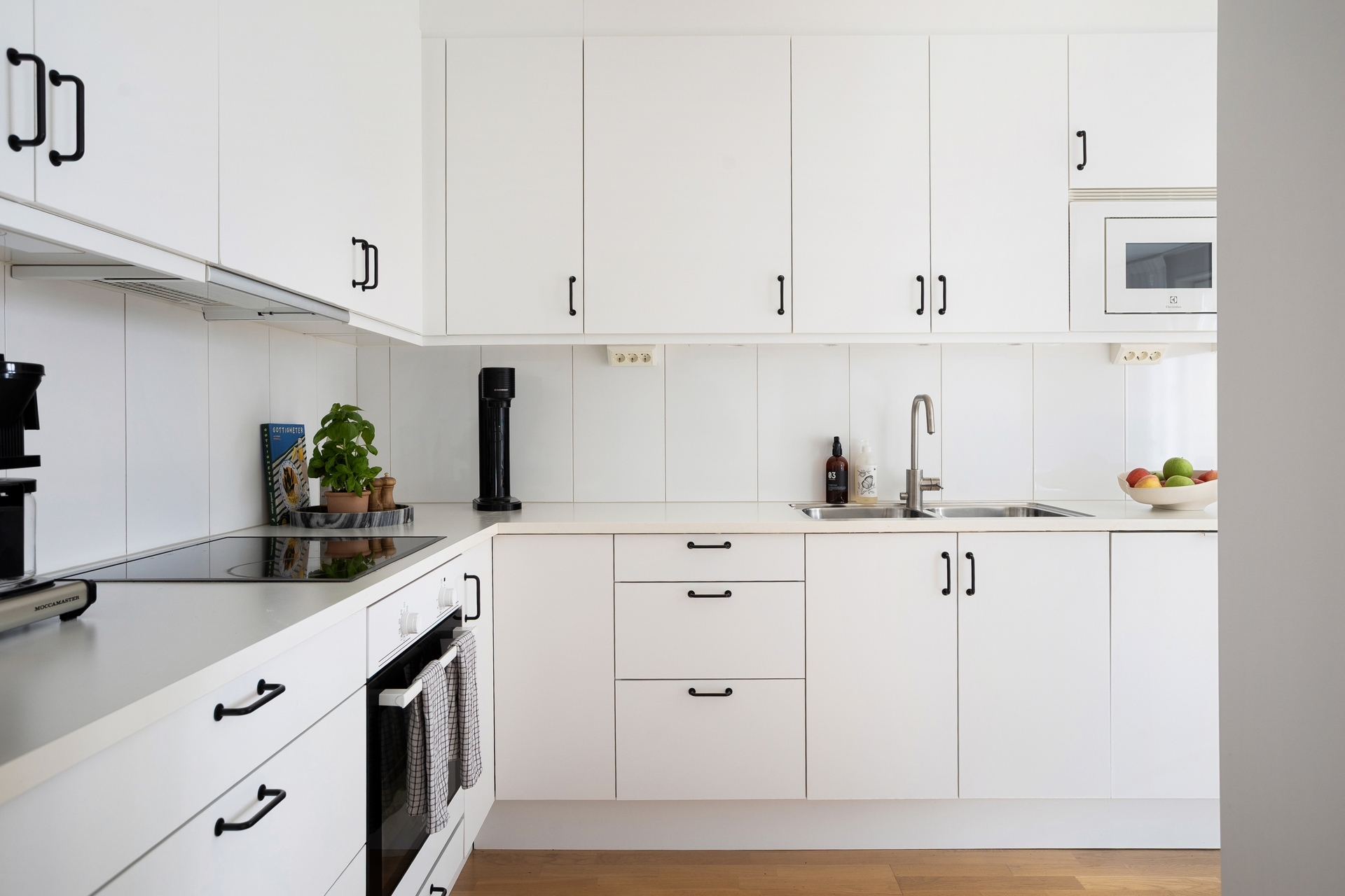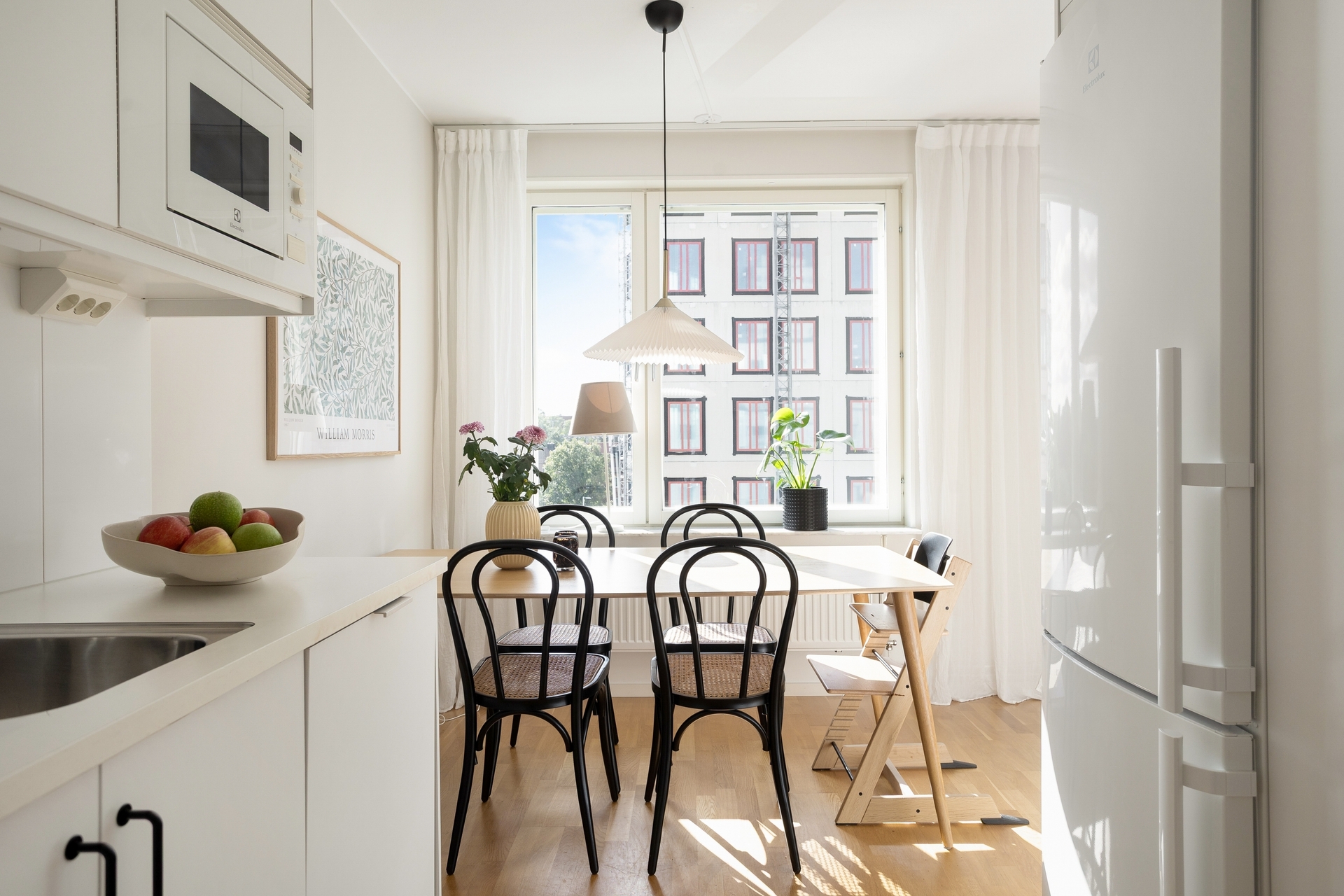 Ljuvligt kök med gott om förvaring i flertalet skåp. Fullt utrustat med kylskåp, frys, ugn, mikrovågsugn, glaskeramikhäll samt integrerad diskmaskin. Ovan den vita bänkskivan finner ni ett diskret vitt kakel som möter upp de matta vita köksluckorna. Mellan vardagsrum och kök finns en given plats för matbord som rymmer 4-6 personer.