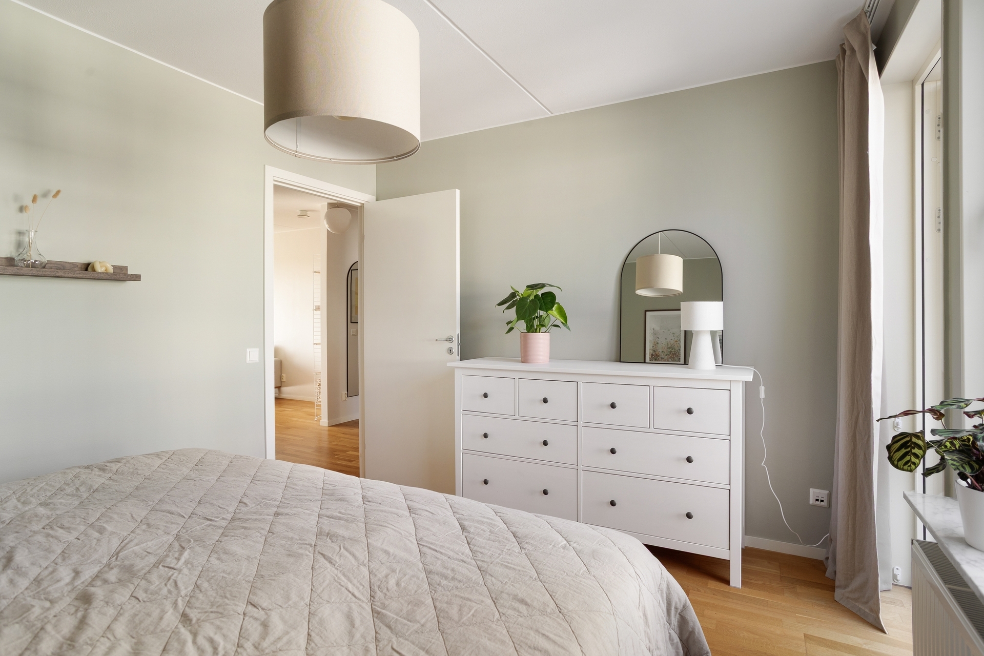 Rogivande sovrum som vetter mot den lugna innergården. Här finns gott om utrymme för en dubbelsäng samt sängbord. Från detta rum når ni bostadens balkong. För den som arbetar hemma få kan man utan problem rymma ett skrivbord i sovrummet.