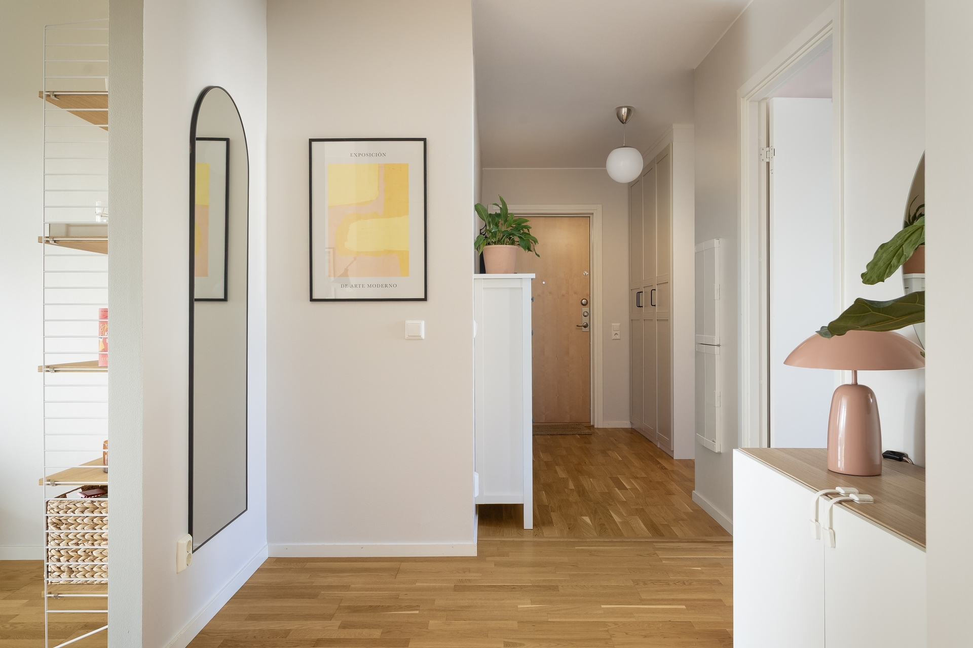 Välkomnande hall med gott om utrymme för ytterkläder och skor samt garderob för extra förvaring. Samtliga rum är målade och golvet vacker ekparkett 3-stav. Här finner ni även bostadens lyxiga klädkammare.