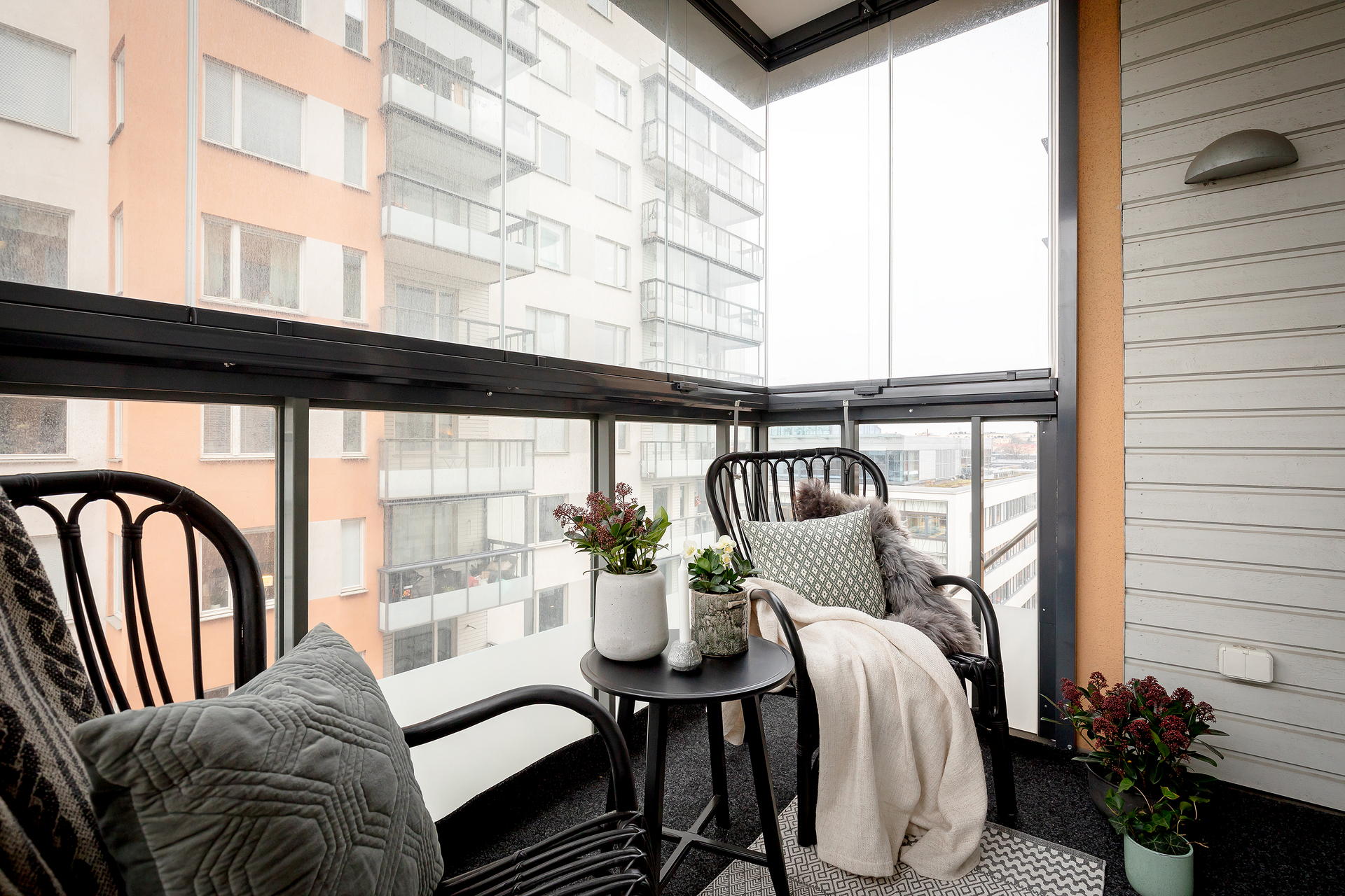 Välplanerad gavel-3:a med stor inglasad balkong och eftermiddagssol på vån 12.