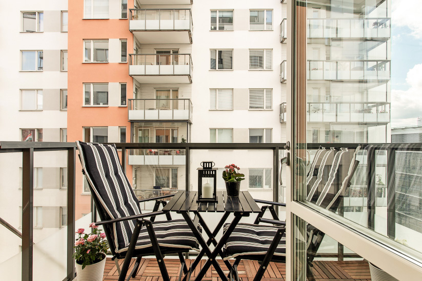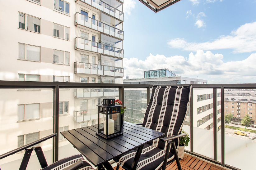 Rymlig balkong med utgång från sällskapsytorna – en uppskattad förlängning av bostaden under årets varmare månader. Här finns plats för både sittgrupp och planteringar, vilket ger möjlighet att skapa en personlig och ombonad utemiljö.