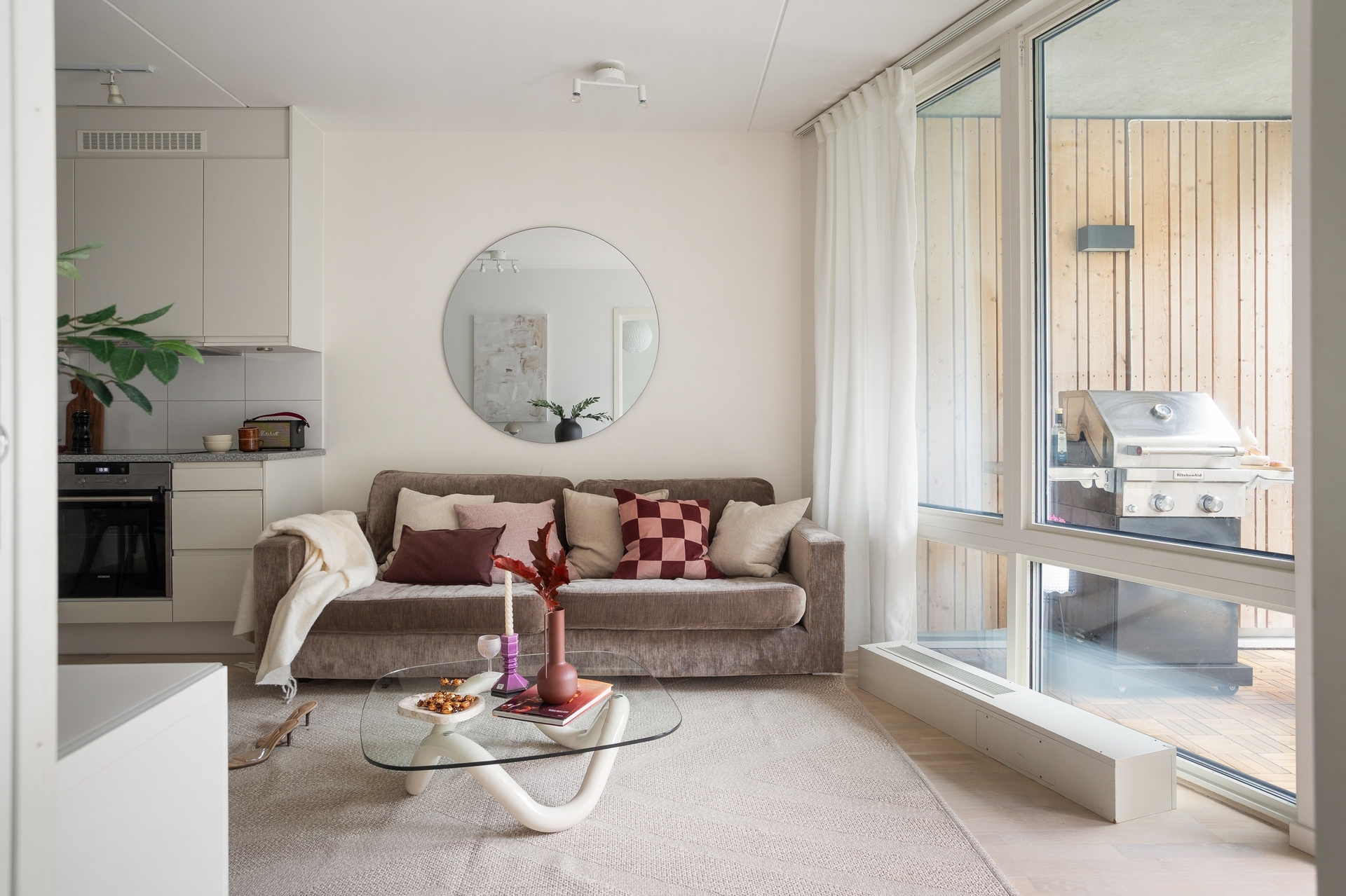 Ljust och luftigt med panoramafönster och utgång till balkongen via dubbeldörrar i glas. Här finns plats för soffa, tv och vardagsrumsbord.