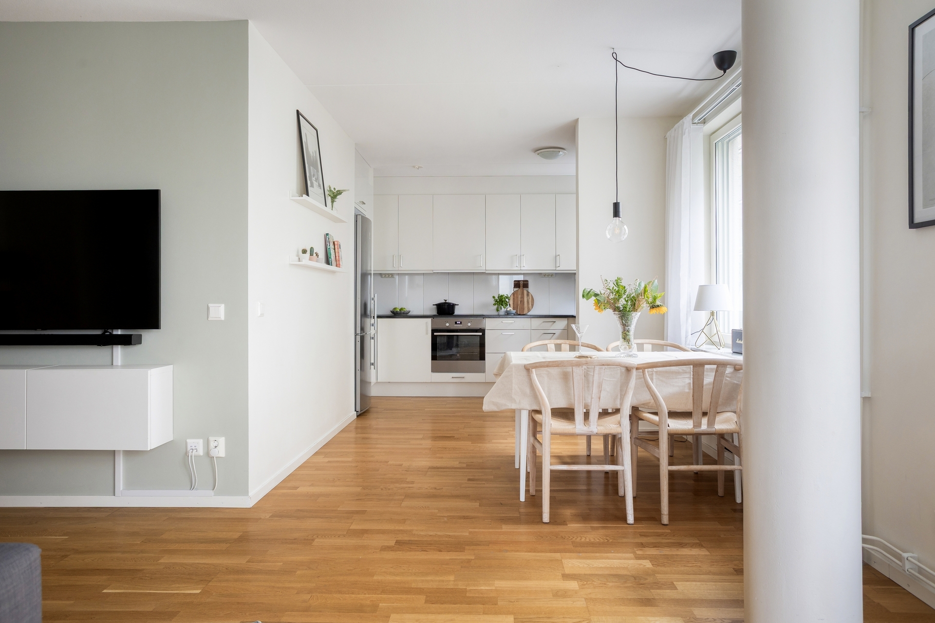 I detta välplanerade vardagsrum kan ni njuta av öppna sällskapsytor med gott om plats för umgänge. Den öppna planlösningen mellan kök och vardagsrum gör bostaden luftig och de generösa fönsterpartierna gör rummen ljusa. Här finner ni gott om plats för en ordentliga soffa, soffbord samt Tv-möbel.
