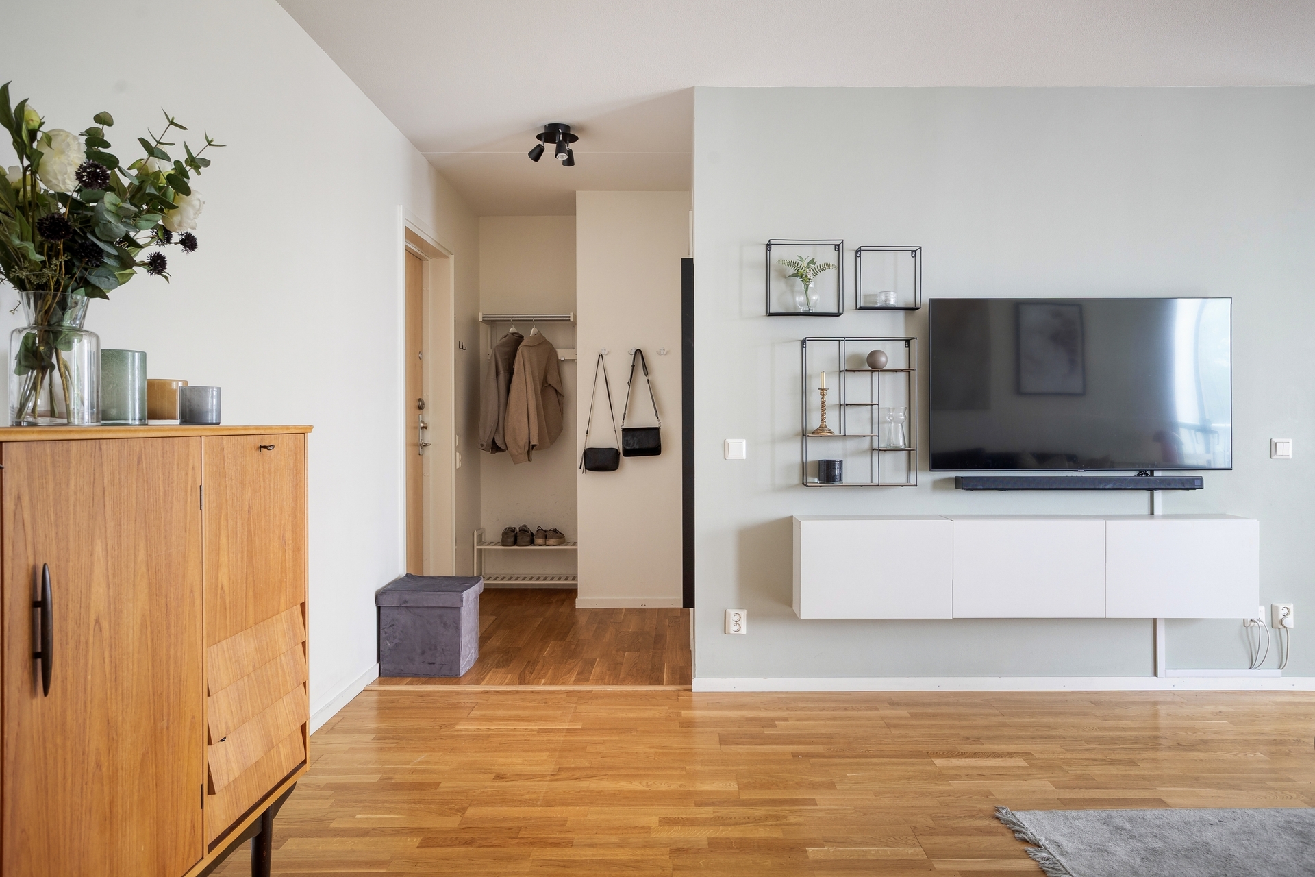 Välkomnande hall med gott om plats för ytterkläder och skor. Genomgående i bostaden finner ni en vacker ekparkett samt vitmålade väggar.