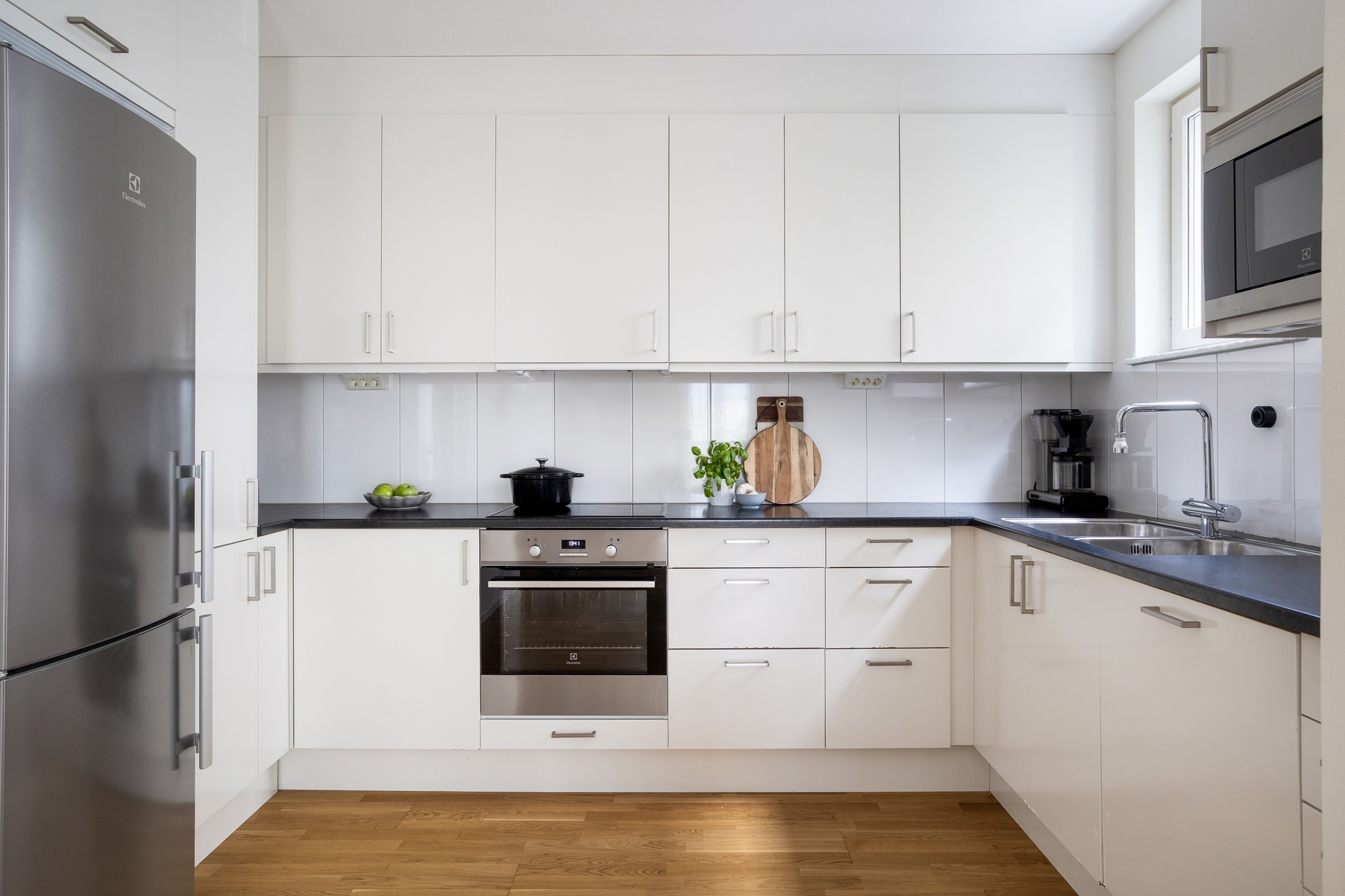 Mycket väldisponerat kök från Marbodal. Bakom vita luckor finner ni gott om förvaring i flertalet skåp och ovan den mörkgrå bänkskivan ett vitt kakel. Köket är utrustat med integrerad diskmaskin, fläkt, keramikhäll, mikrovågsugn, ugn samt kylskåp och frys. Här ryms ett ordentligt matbord för 4-8 personer.