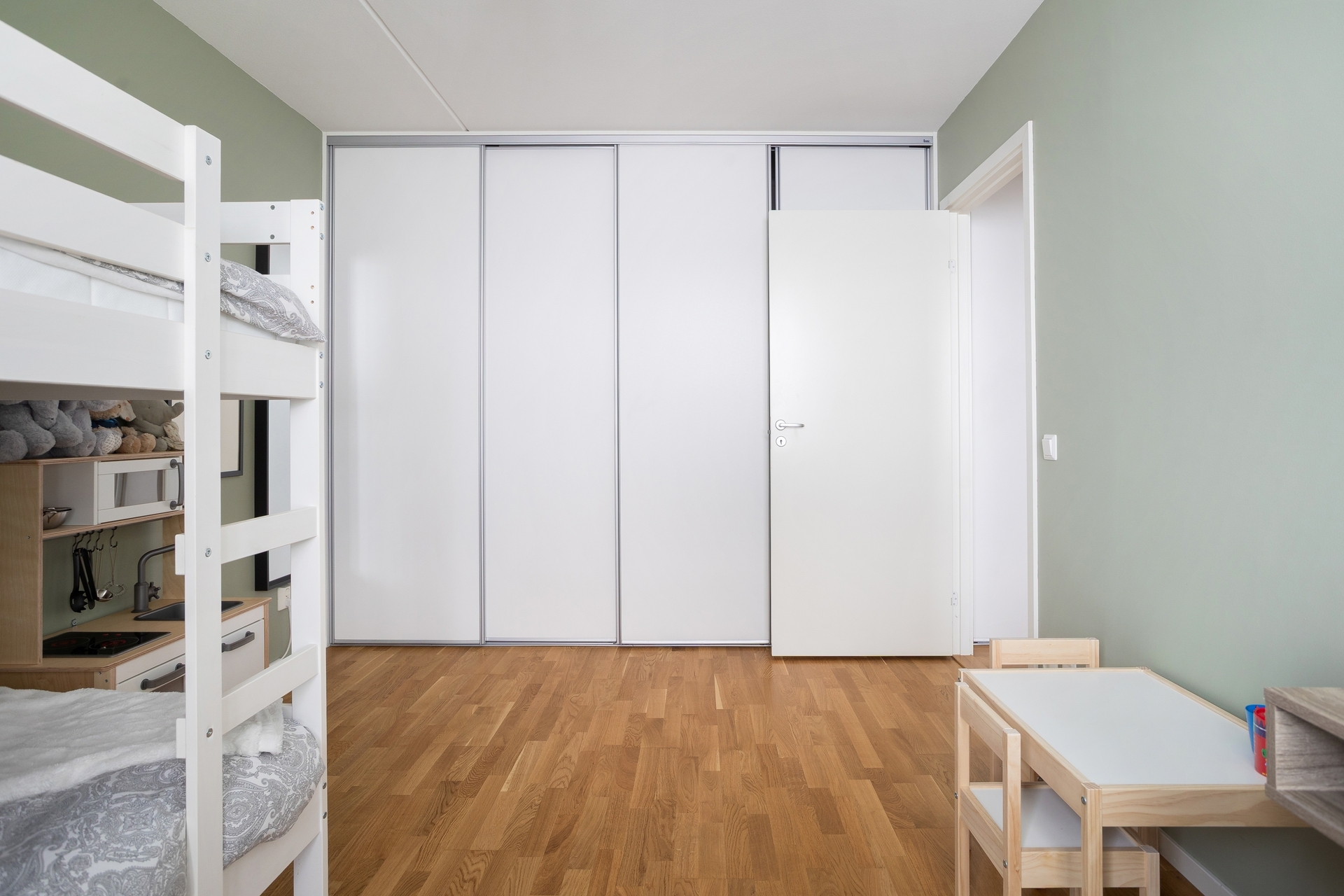 Detta rum används idag som barnrum och är möblerat med våningsäng och dubbla skrivbord. Rymmer med fördel en generös dubbelsäng samt och nattduksbord. Gott om förvaring i hel garderobsvägg.