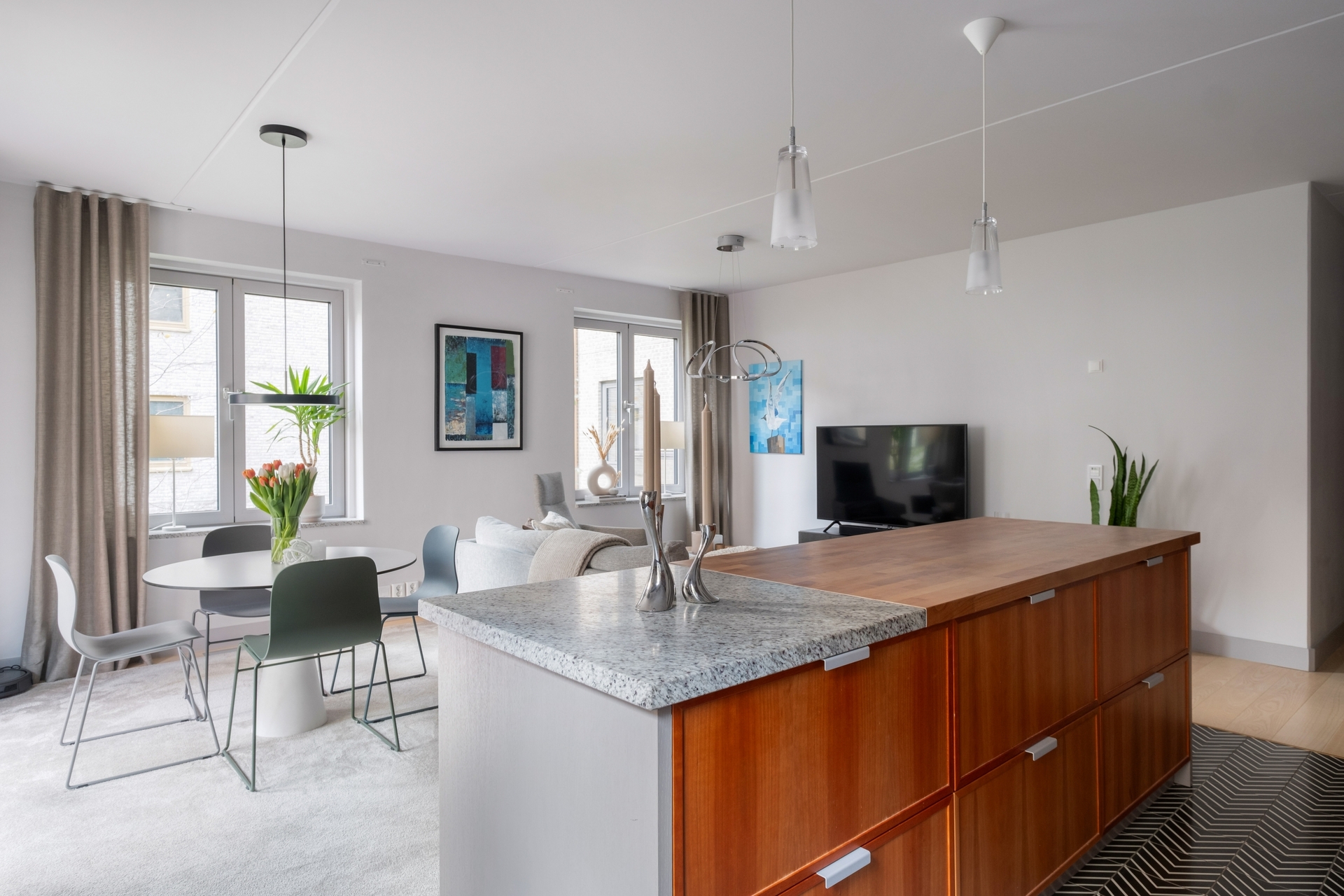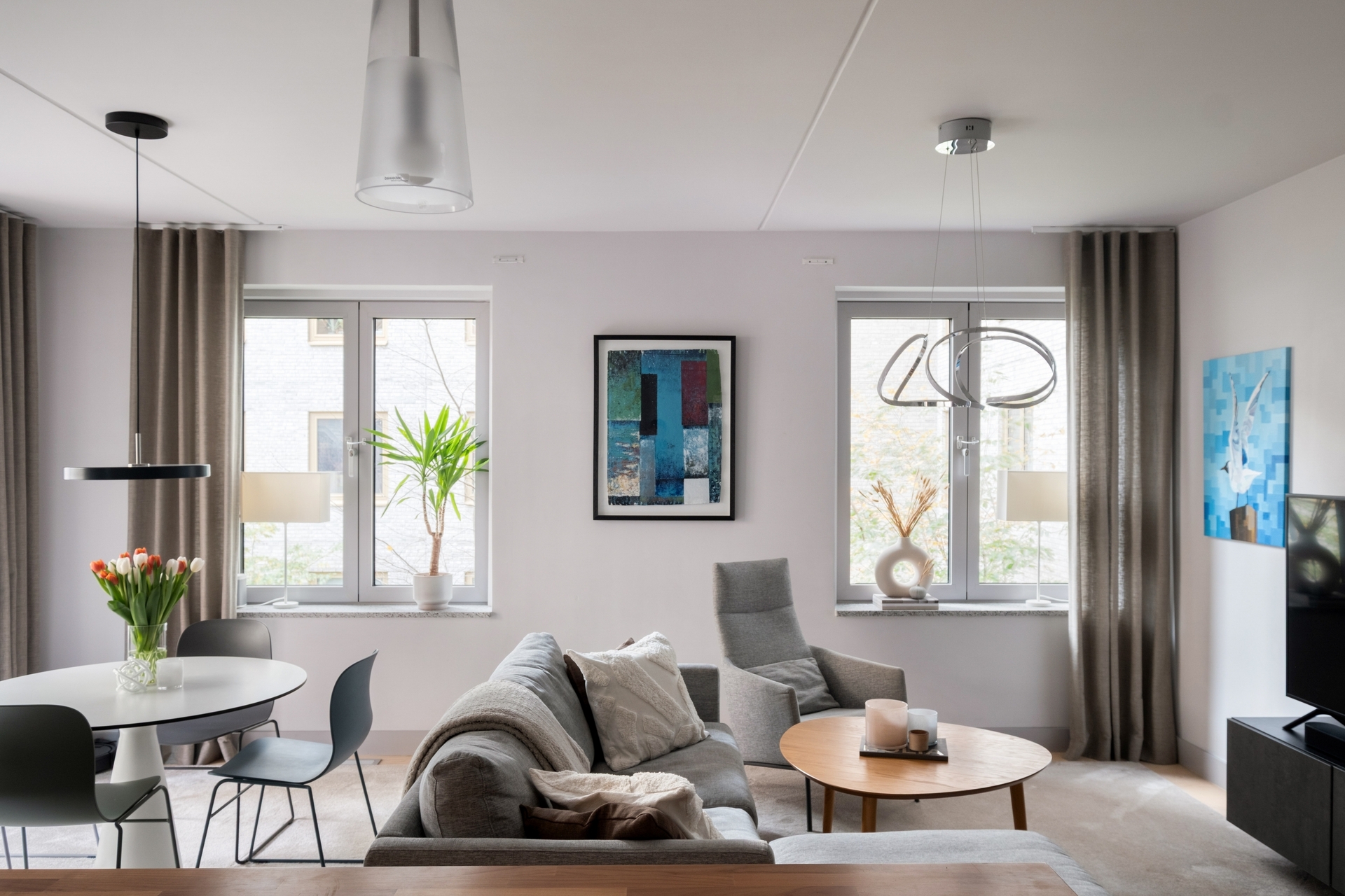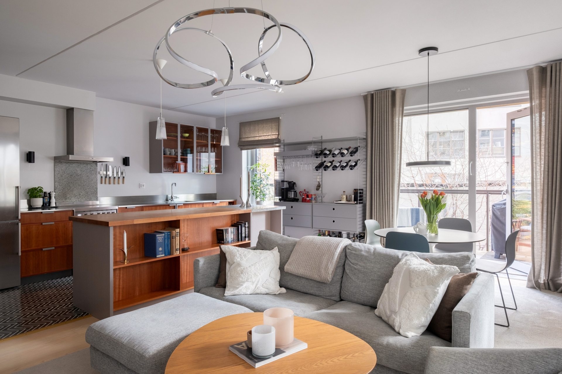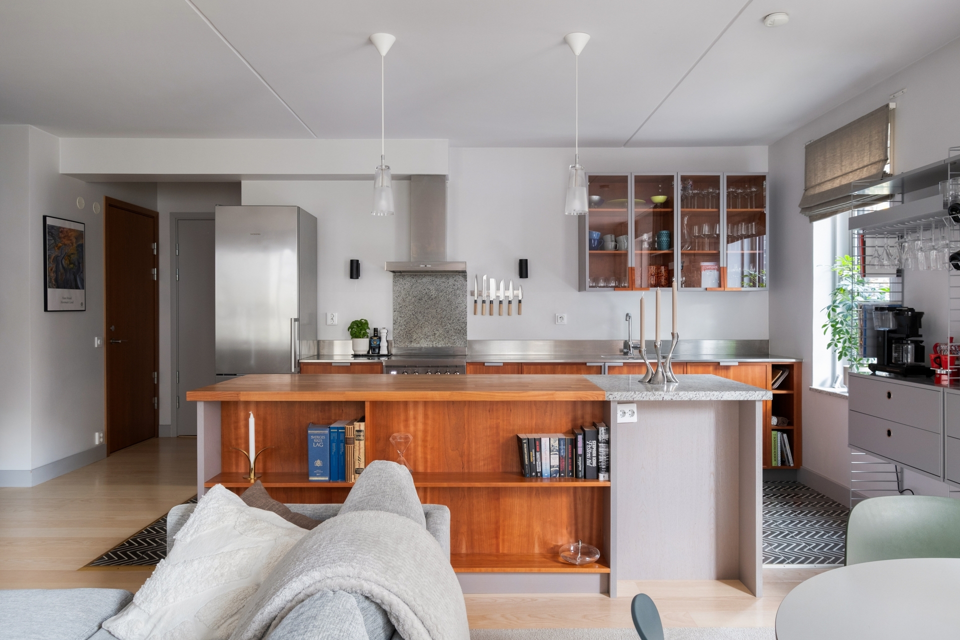 Lägenheten präglas av en påtaglig känsla för kvalitet och noggrant valda material. De massiva innerdörrarna i mattlackad, knivskuren körsbärsfaner bidrar med en elegant värme, medan de ljusgrå fönsterbänkarna i granit tillför en sober exklusivitet. Väggar och tak går i en mjuk gråvit ton som samspelar fint med snickerier i varmgrå nyans. Den generösa takhöjden förstärker intrycket av rymd och ger bostaden en luftig och sofistikerad karaktär.