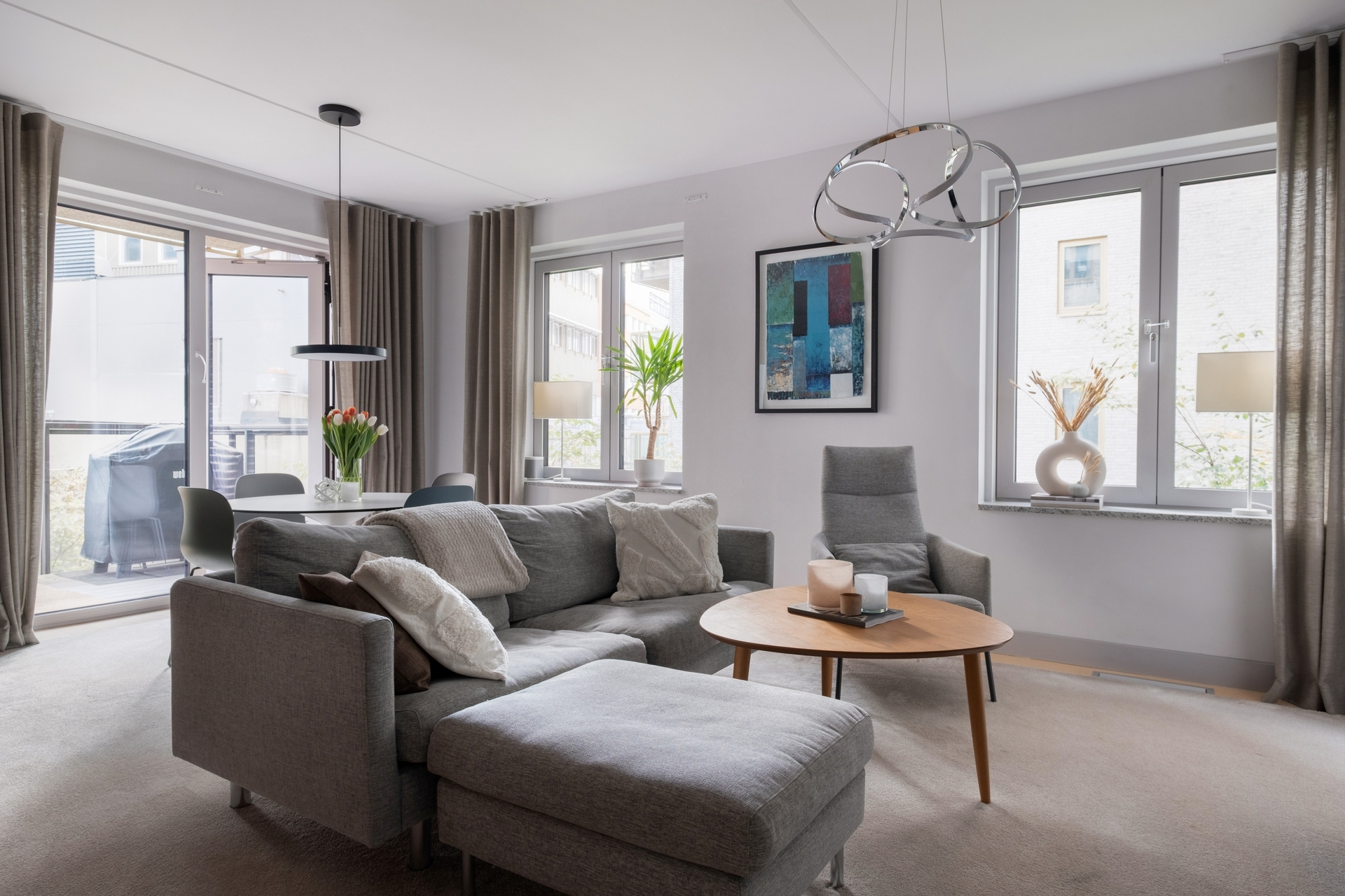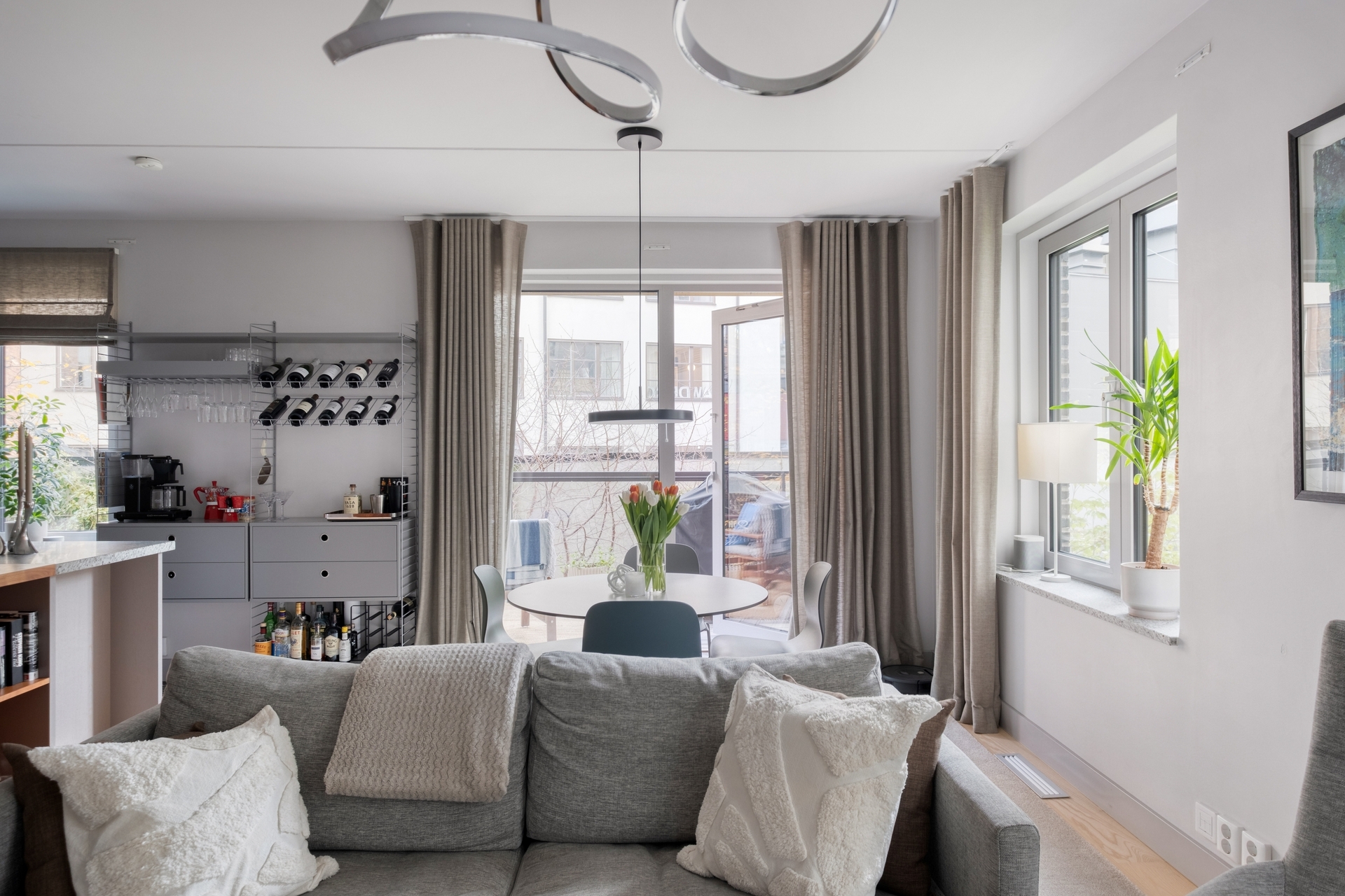 Vardagsrummet är bostadens naturliga samlingspunkt – ett ljust och luftigt rum med stora fönster som släpper in rikligt med dagsljus. Den generösa ytan ger plats för flexibel möblering och skapar utrymme för både umgänge och avkoppling. Från vardagsrummet nås den soliga balkongen, en förlängning av sällskapsytorna där du kan njuta av både morgonkaffet och sena kvällar.
