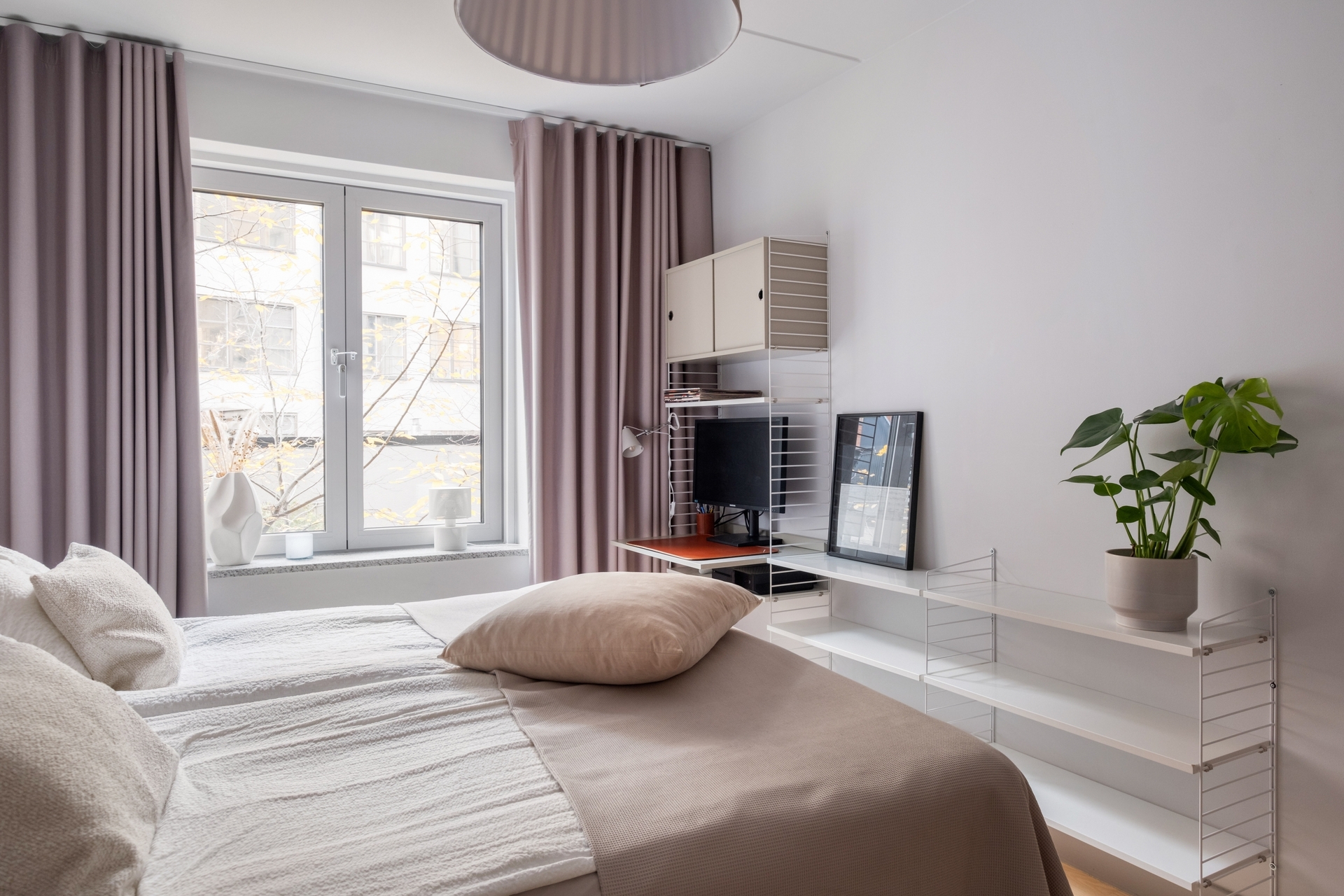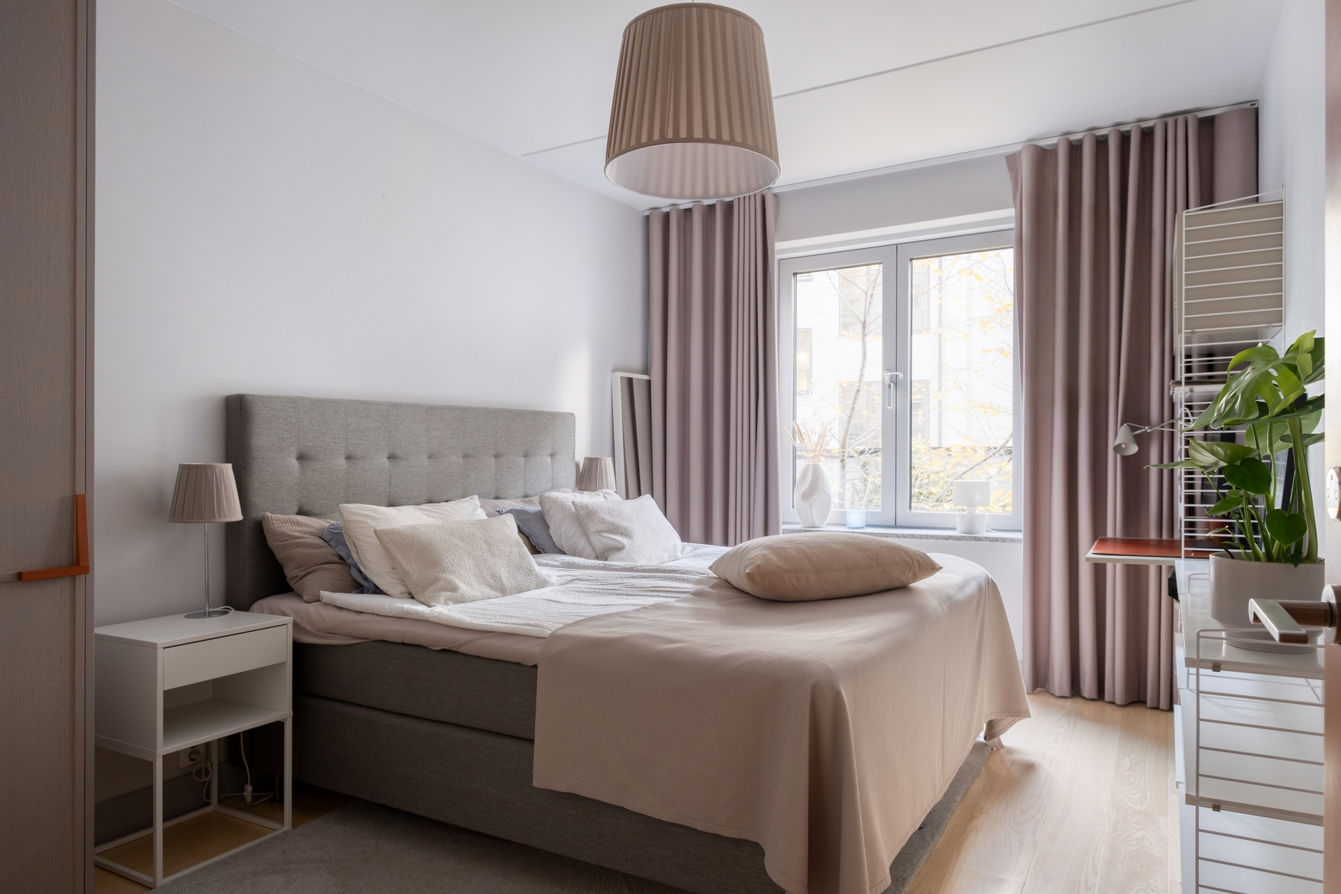 Rogivande sovrum med generösa ytor och ett behagligt ljusinsläpp. Här ryms dubbelsäng med nattduksbord och förvaringen är väl tilltagen med garderob. Den lugna färgpaletten och de genomtänkta detaljerna skapar en harmonisk atmosfär – en perfekt plats för återhämtning.