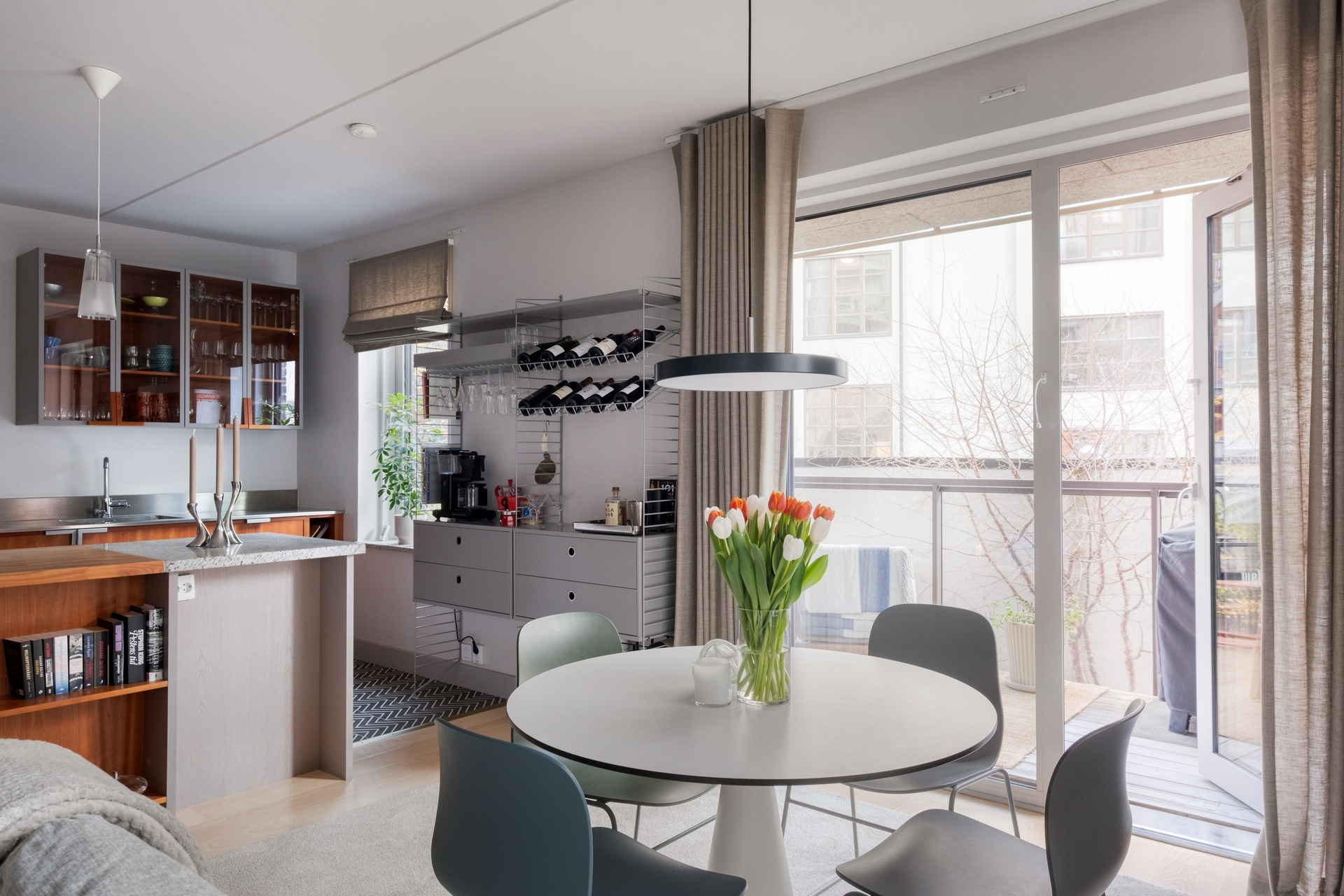 Balkongen är en härlig förlängning av vardagsrummet och erbjuder en lugn plats för avkoppling. Här finns gott om utrymme för loungemöbler eller ett mindre matbord, perfekt för att njuta av en kopp kaffe i solen eller en stilla kväll utomhus. Den insynsskyddade placeringen skapar en trivsam och ombonad känsla – en naturlig förlängning av hemmets sociala ytor.