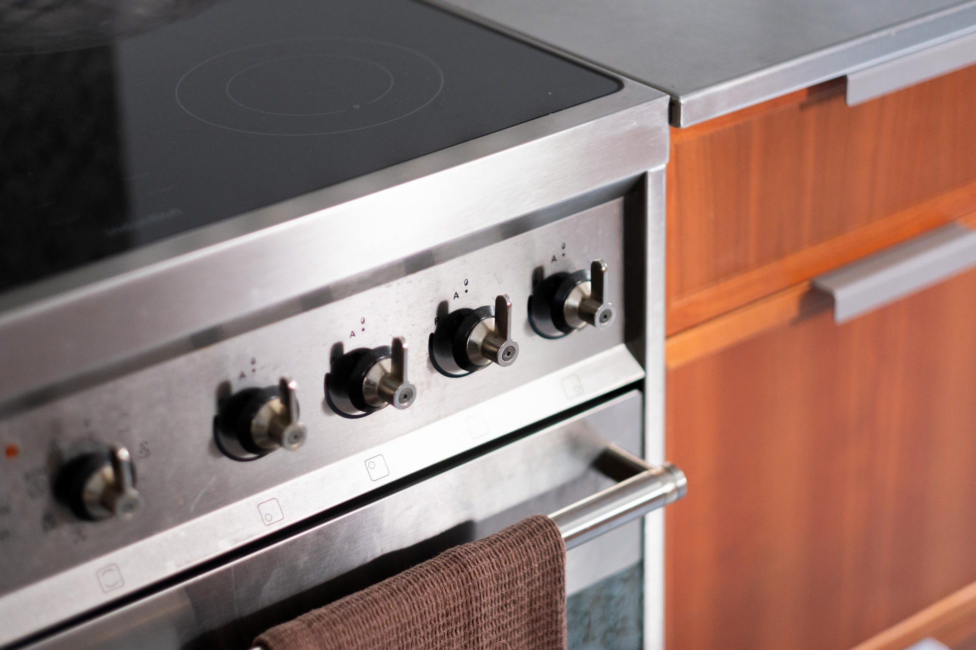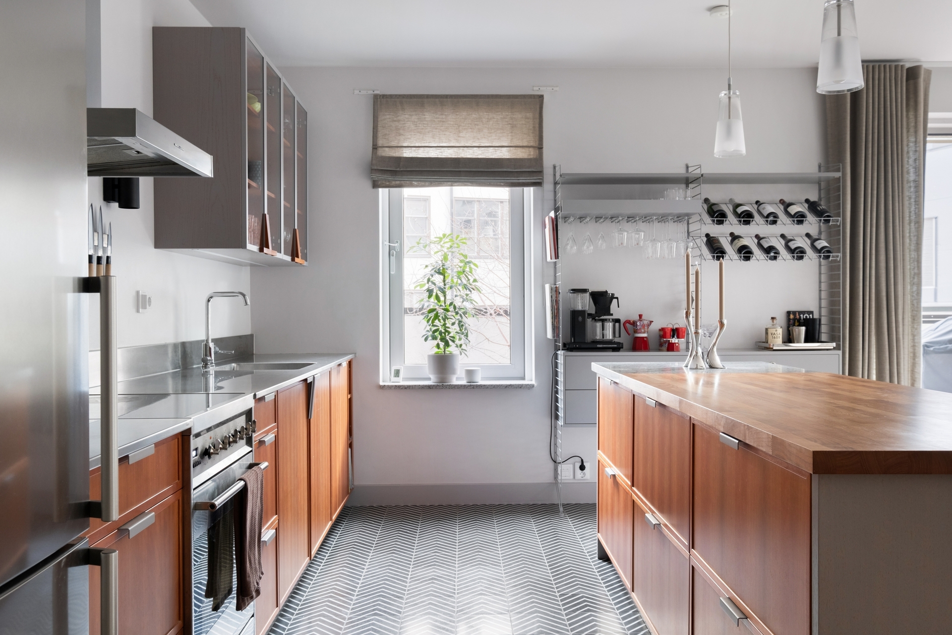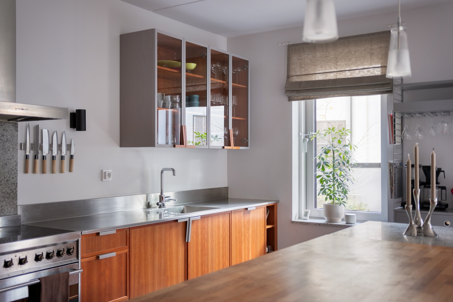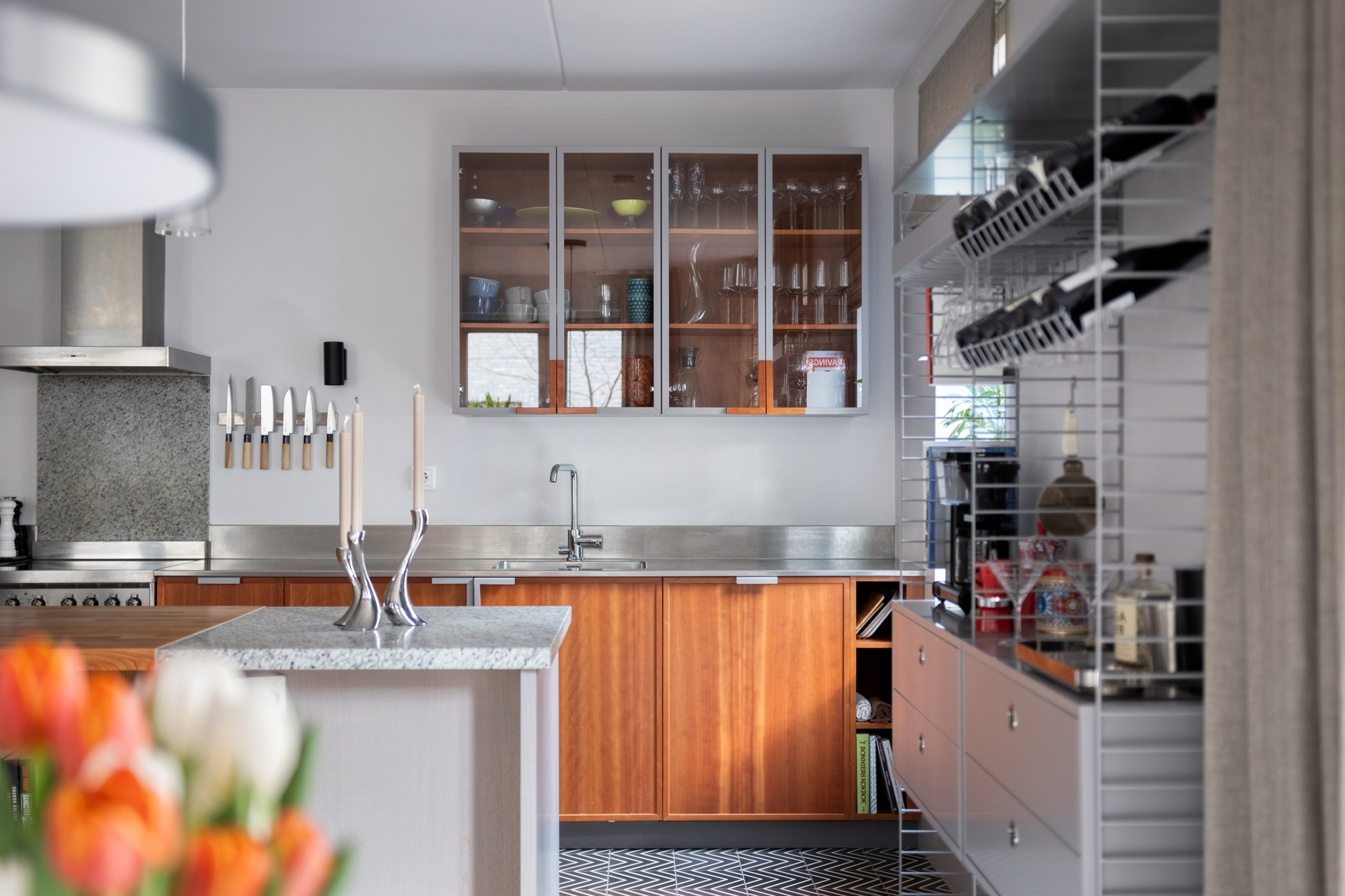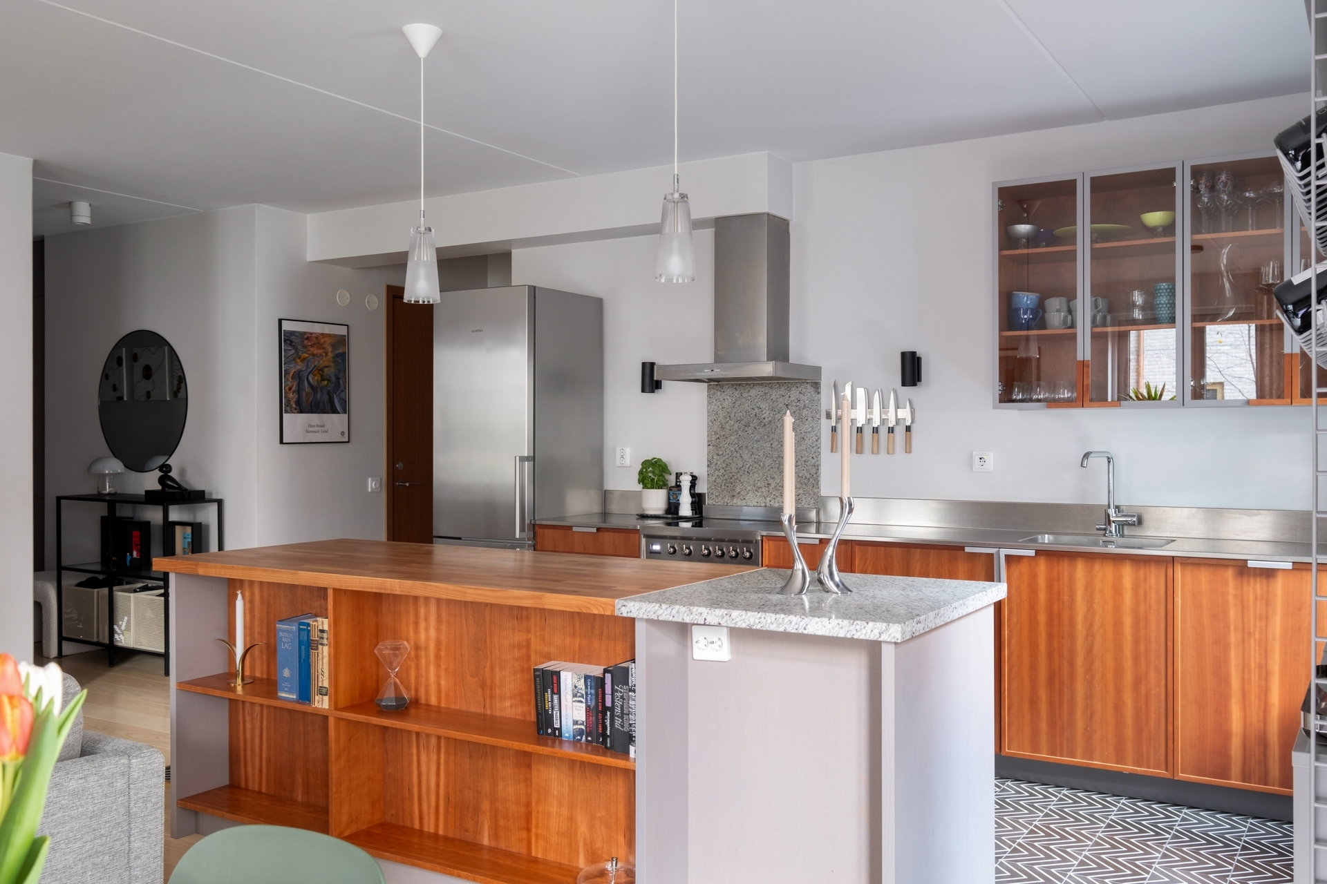Det skräddarsydda köket kombinerar form och funktion på bästa sätt. Skåpsfronter i körsbärsträ och en bänkskiva i rostfritt stål skapar ett modernt och stilfullt uttryck. Köket är fullt utrustat med kvalitetsvitvaror: induktionshäll från Smeg, kyl/frys från Siemens och diskmaskin från Gaggenau. Ett stänkskydd ovan spisen i ljus granit adderar elegans, och den centralt placerade köksön med körsbärsträ och slipad granitskiva fungerar både som arbetsyta och social mittpunkt.
