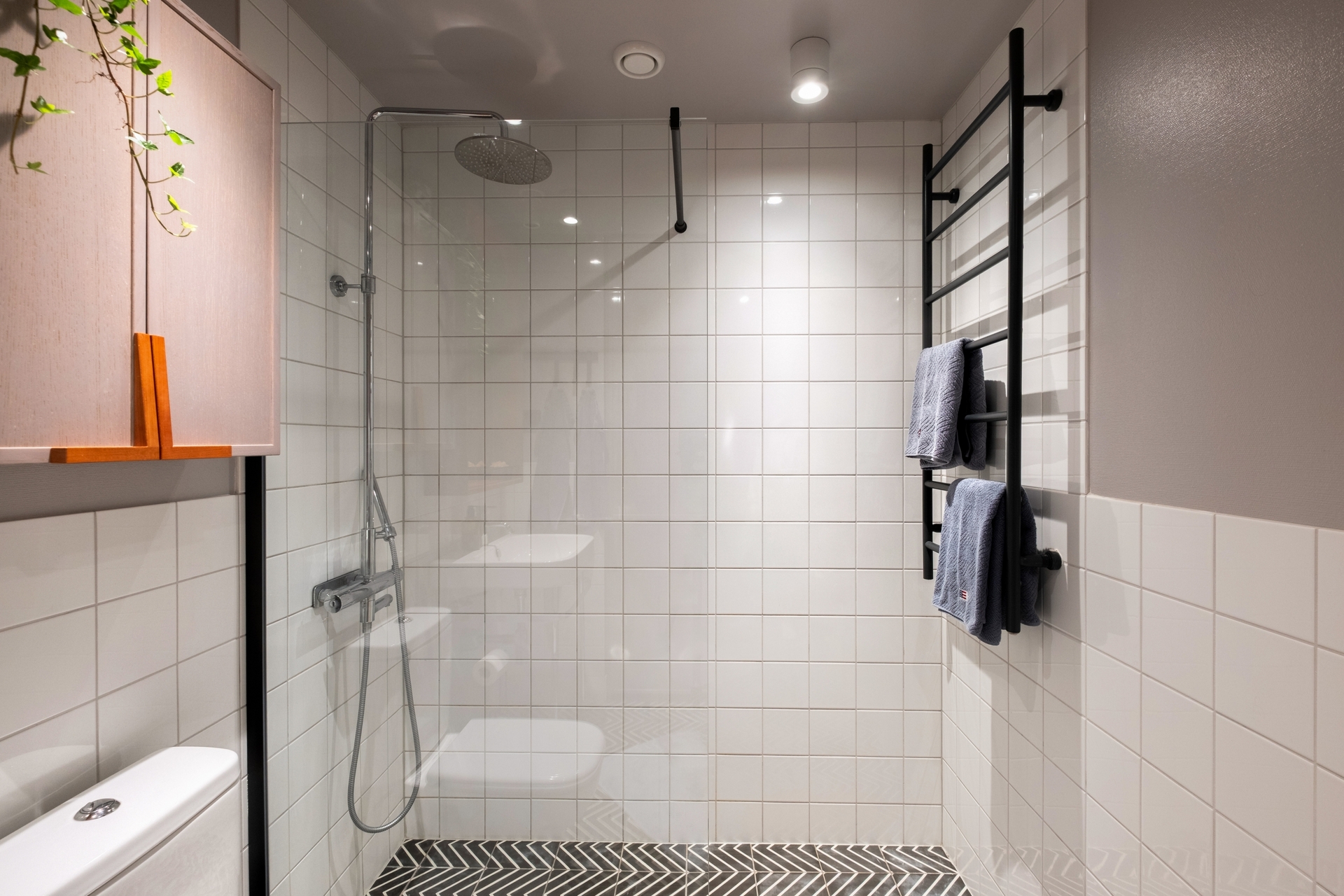 Badrummet erbjuder en lyxig och harmonisk miljö med genomarbetade materialval. Golvet är lagt med mönstrat klinker som ger karaktär, medan väggarna kombinerar kakel och målade ytor för en mjuk och modern känsla. Här finns dusch med klarglasvägg, toalett, handfat och ett stilrent badrumsskåp. En infälld spegelnisch ger smart förvaring, och tvättmaskin samt torktumlare är diskret dolda bakom trädörrar – en elegant och praktisk lösning.
