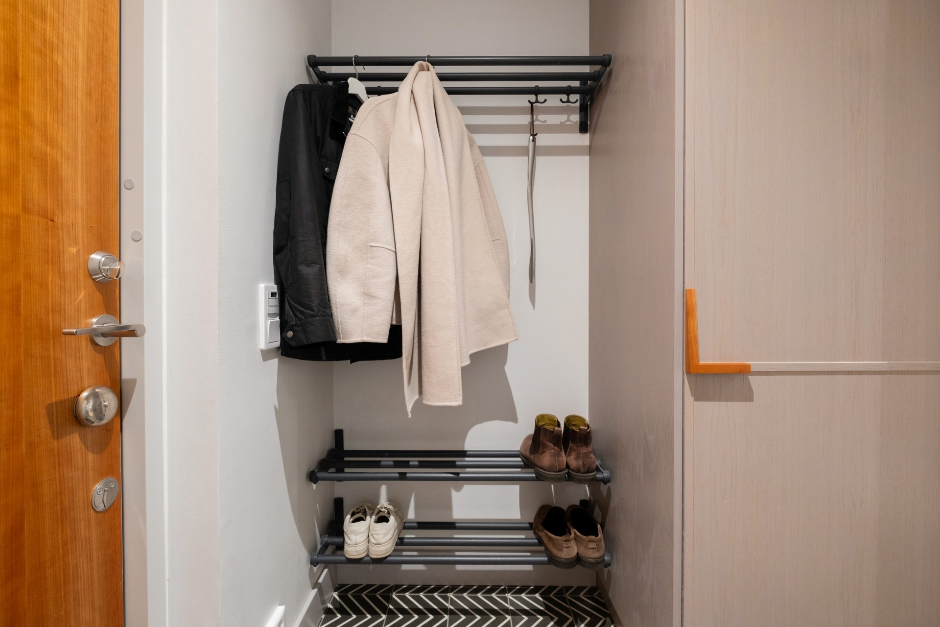 I anslutning till sovrummet finns en praktisk klädkammare som gör det enkelt att hålla ordning på kläder och tillhörigheter.