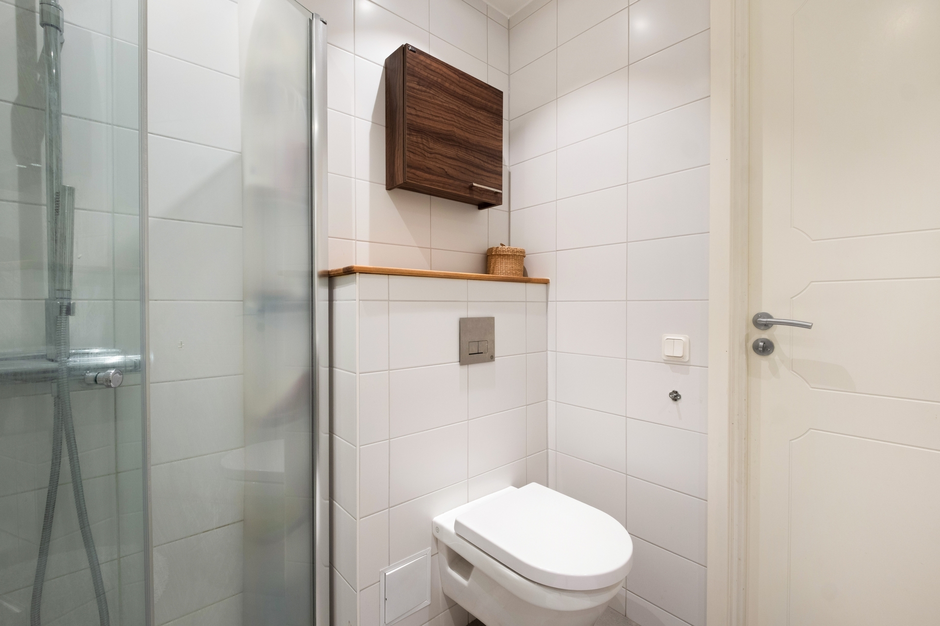 Stilrent och helkaklat badrum med vita väggar och grått klinkergolv. Här finns dusch med glasväggar, handfat med kommod, vägghängd wc samt tvättmaskin som gör vardagen smidig. En fräsch och funktionell miljö som kombinerar komfort och design.