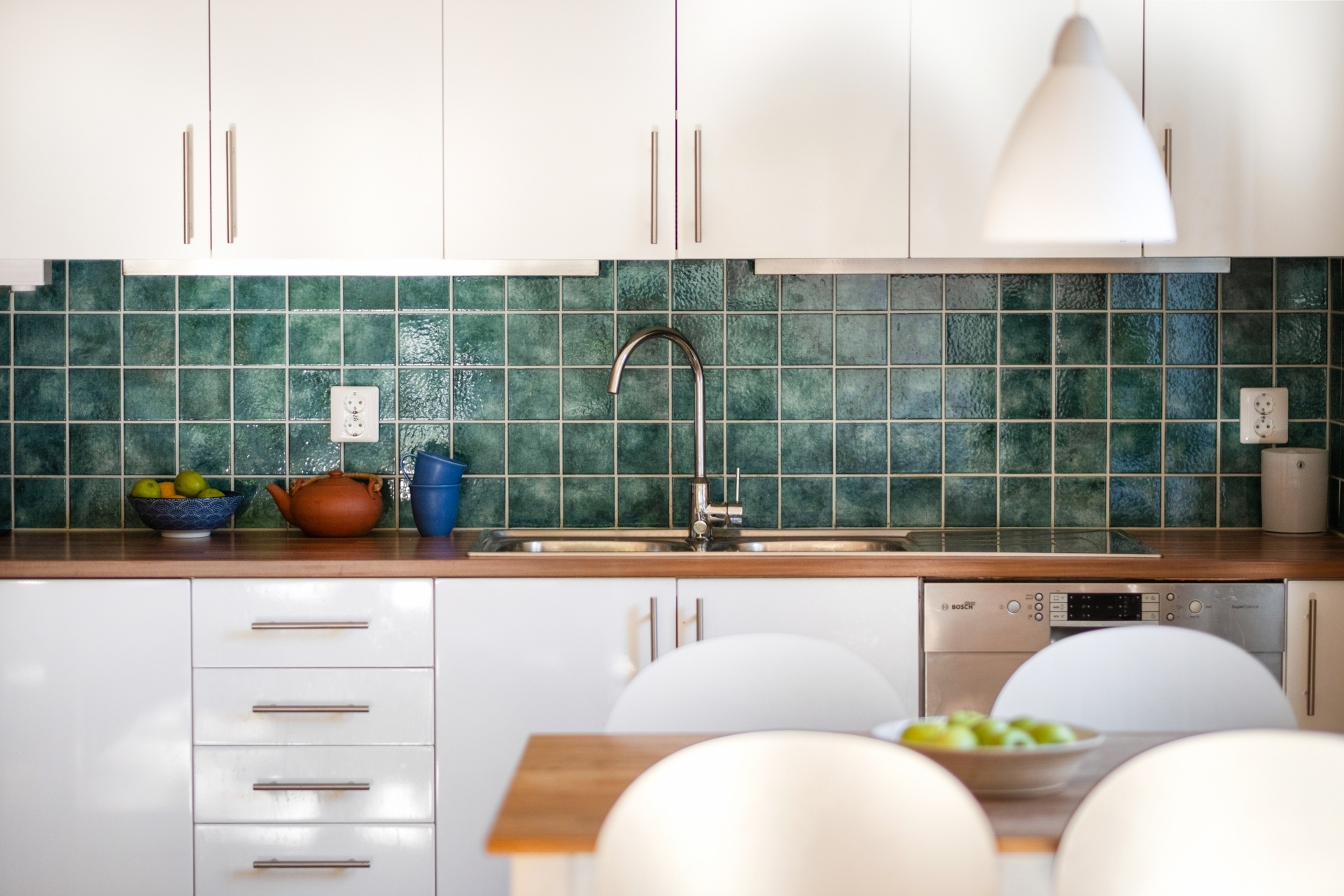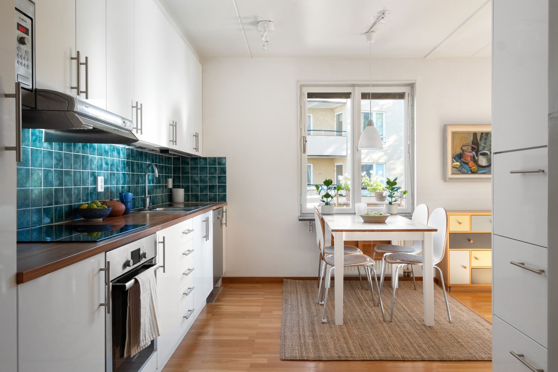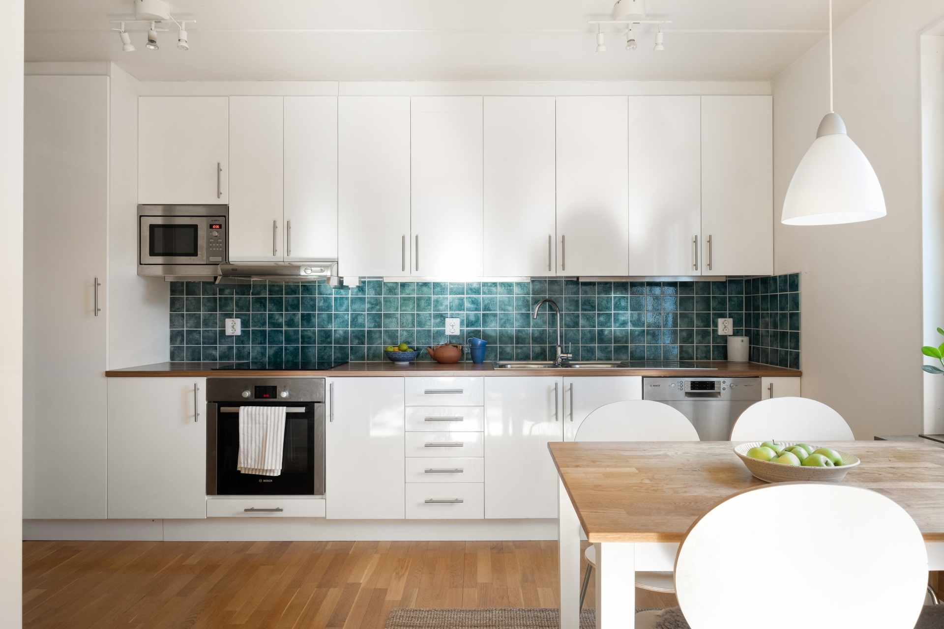 Ett smakfullt och väldisponerat kök som kombinerar funktion och design. Bakom de vita skåpsluckorna döljer sig goda förvaringsmöjligheter, och på den tåliga laminatskivan finns gott om arbetsyta för matlagning. Ovanför arbetsbänken sitter ett snyggt kakel, upplyst av lampor i köksskåpen. Köket är utrustat med diskmaskin, kyl/frys, spishäll, ugn och mikrovågsugn – allt du behöver för en bekväm vardag. Här finns dessutom plats för ett större matbord för trevliga middagar i gott sällskap.