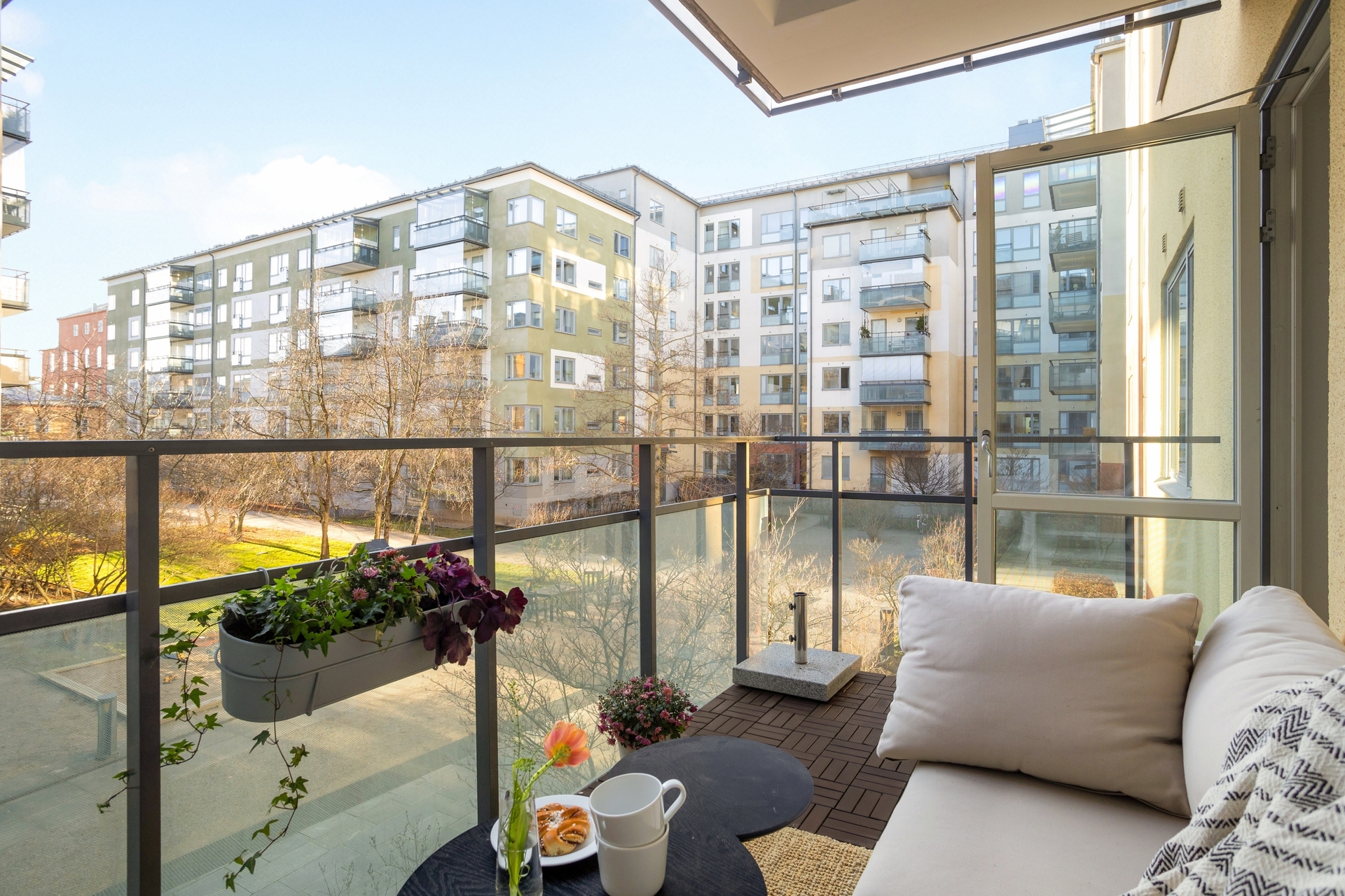 Hörnlägenhet med stor balkong.