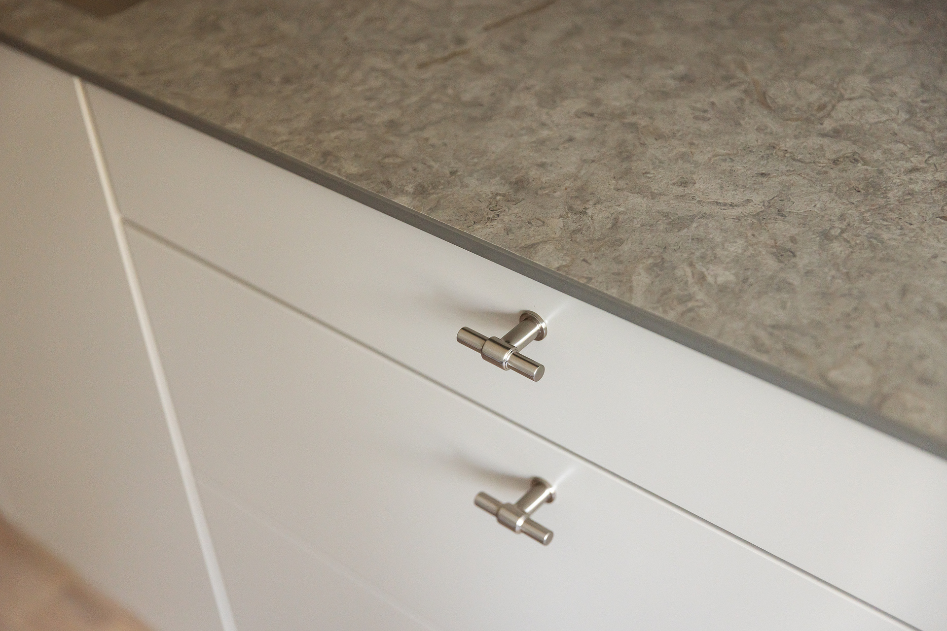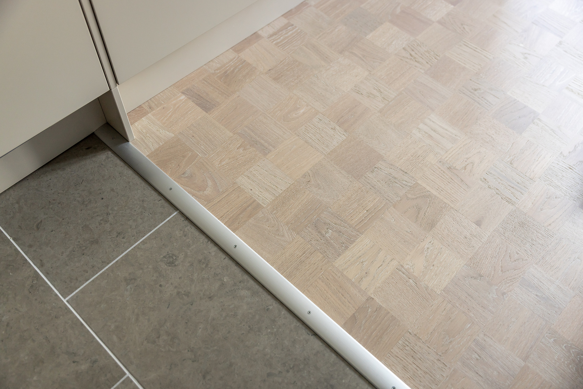 Hallen är rymlig och funktionellt utformad med goda avhängnings- och förvaringsmöjligheter i platsbyggda garderober. Golvet är belagt med slitstark sten som övergår i vitlaserad ekparkett i övriga rum, vilket skapar ett tydligt och hållbart entréparti. Väggarna är målade i neutrala toner och den generösa takhöjden om 2,6 meter bidrar till en luftig känsla.