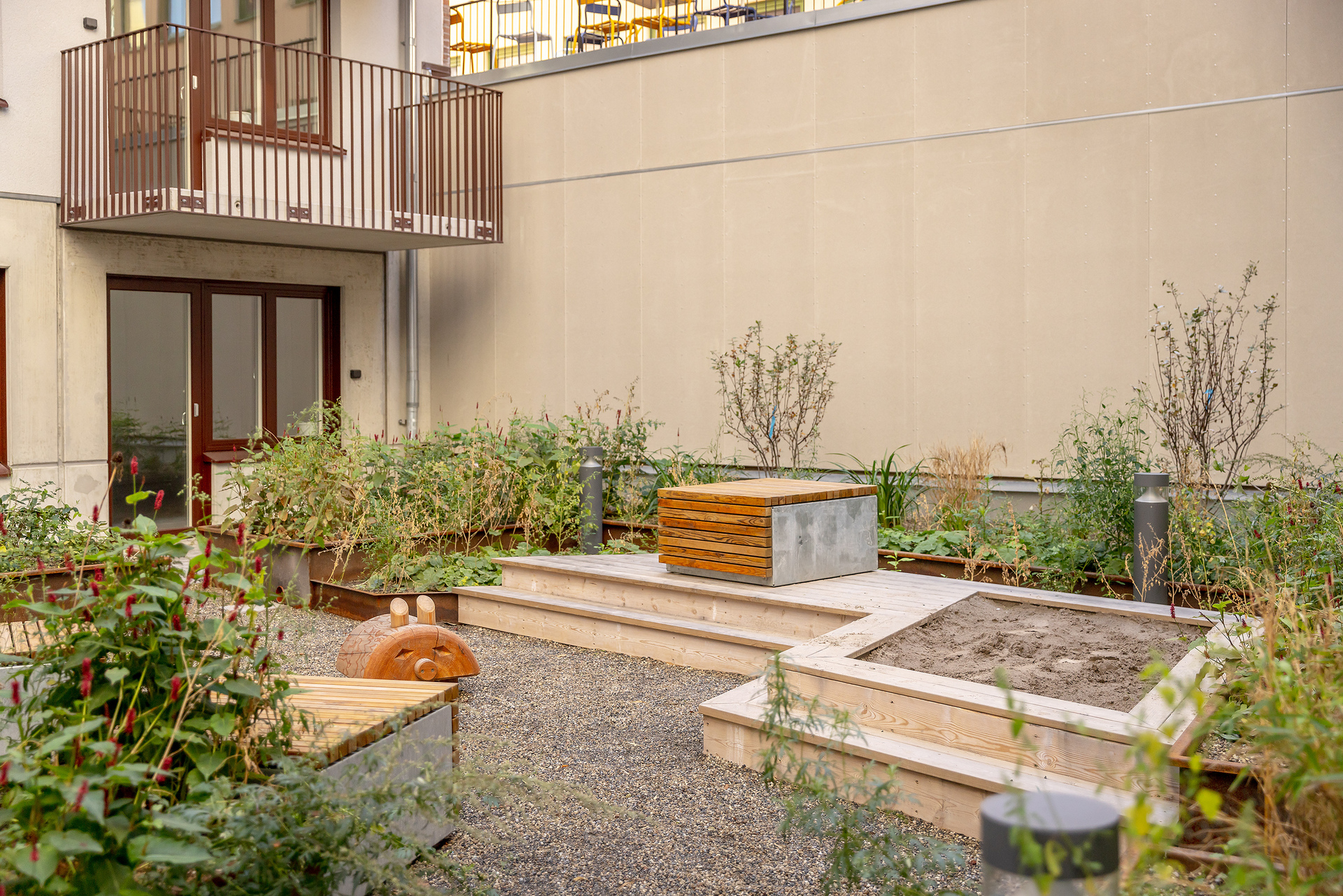 Ljus gaveltrea med insynsskyddat läge och balkong mot gården.