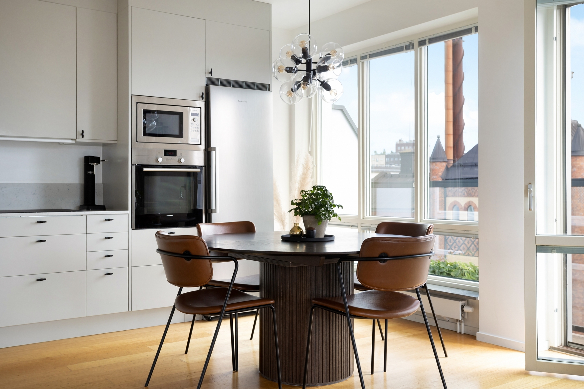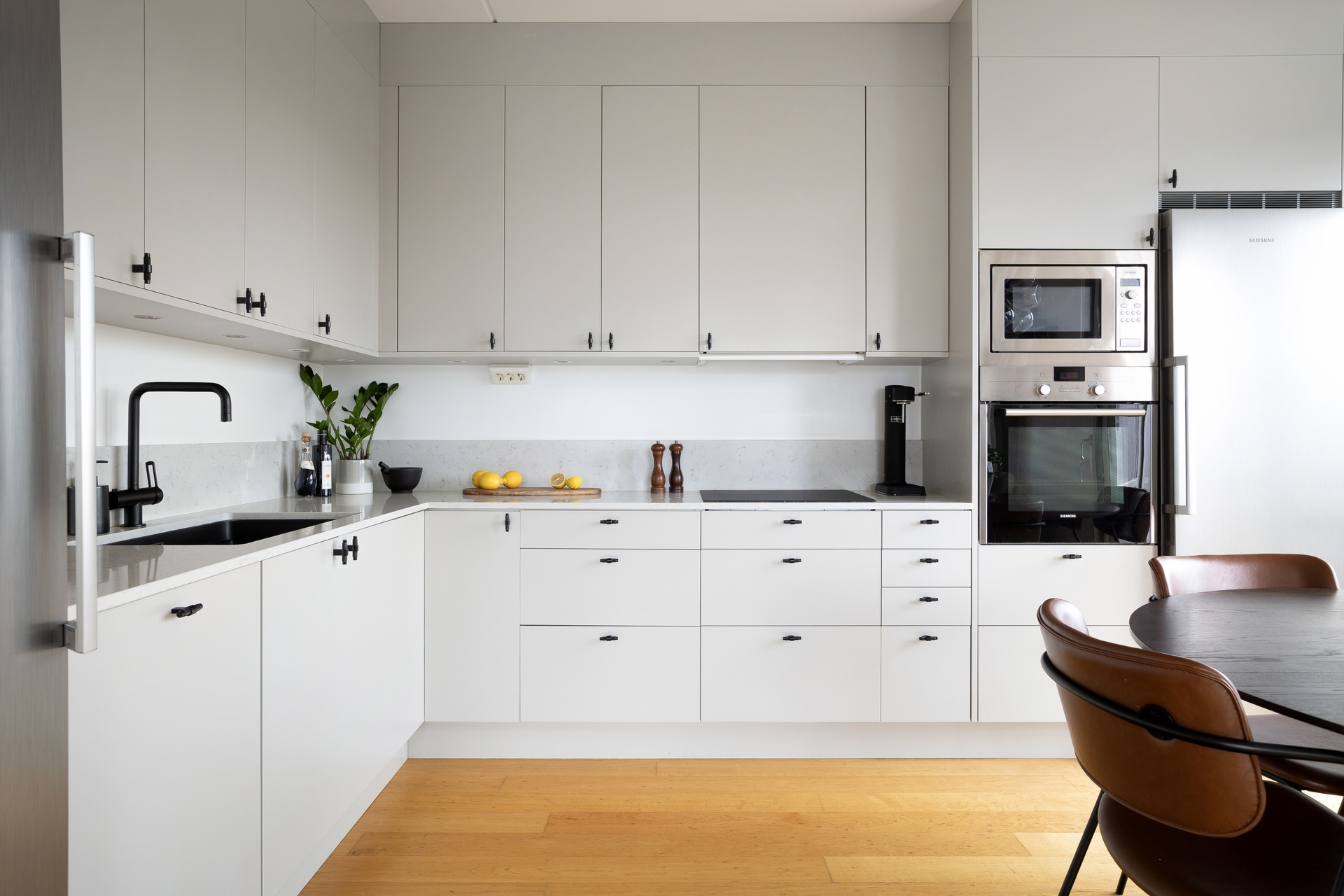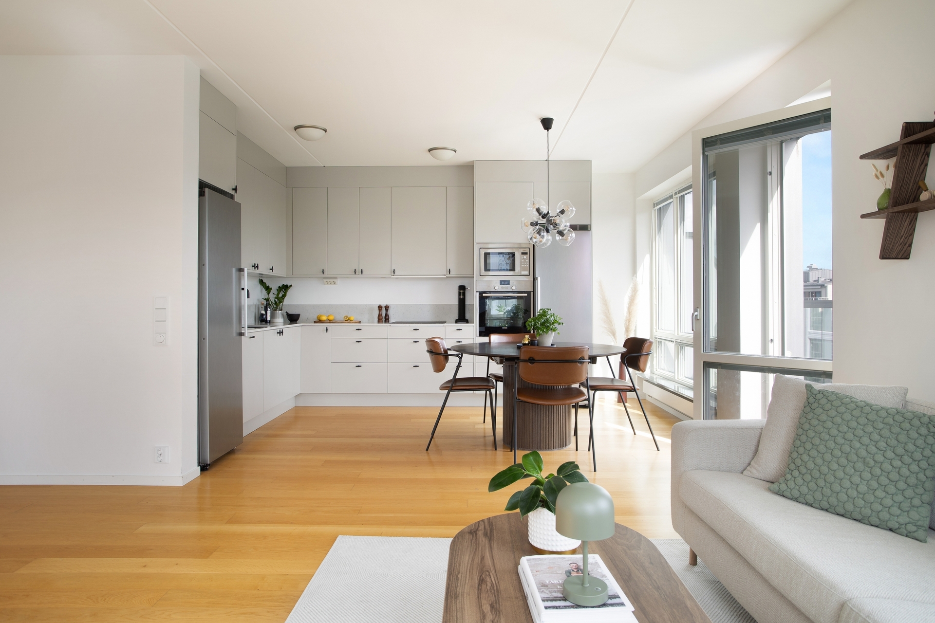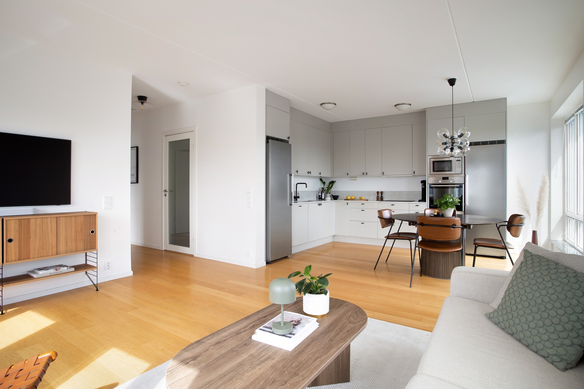 Väldisponerat kök med plats för ett ordentligt matbord för 6-8 personer. Fullt utrustat med mikrovågsugn, induktionshäll, ugn, fullstort kylskåp och frys. Luckorna är i en vacker varmgrå ton och den sandfärgade bänkskivan i kvartskomposit möter vackert upp en bit på väggen.