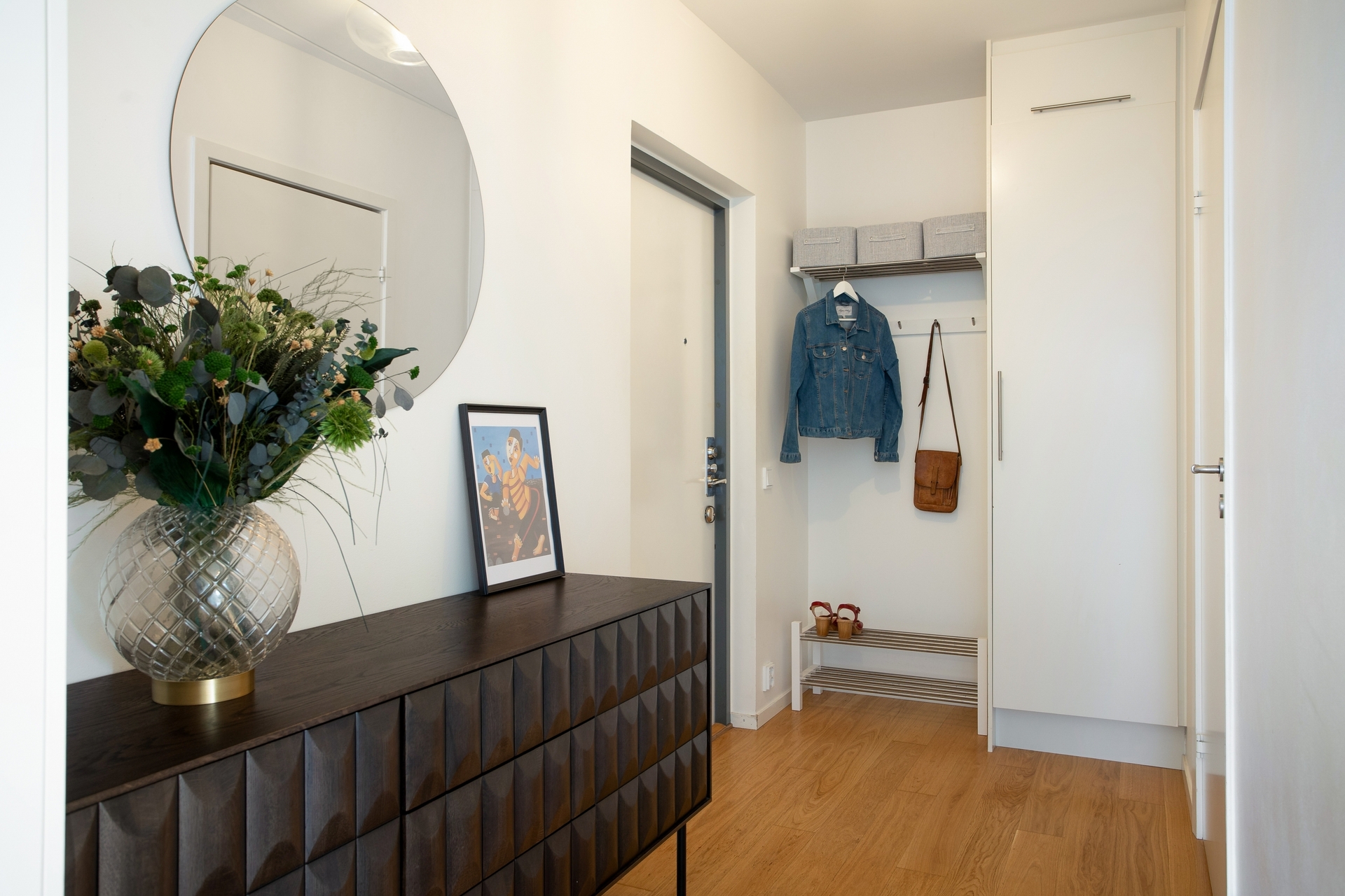 Välkomnande hall med plats för ytterkläder och skor. Golvet är genomgående ekparkett och väggarna är målade.