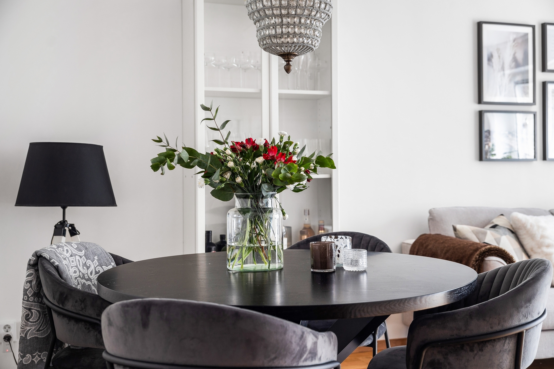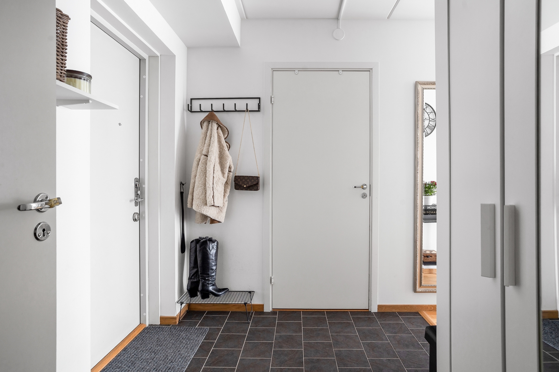 Välkommen in i en rymlig och ombonad hall som direkt sätter tonen för hemmet. Här finns gott om utrymme att inreda med garderober eller annan förvaring efter behov, och dessutom en praktisk klädkammare som erbjuder goda förvaringsmöjligheter. Golvet pryds av ett stilrent, mörkt klinkergolv som är både slitstarkt och lättskött. Det övergår i en vacker ekparkett som löper vidare genom lägenhetens övriga rum och skapar en trivsam och sammanhängande känsla.