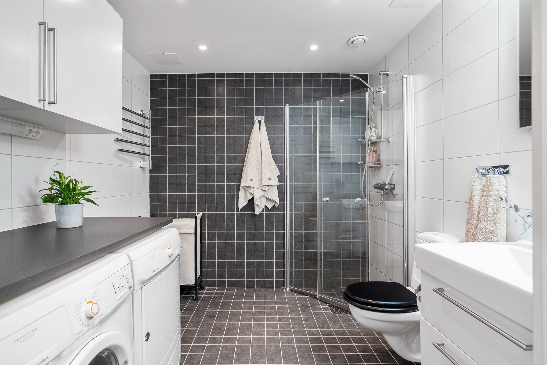Det generösa badrummet är stilfullt utformat med vitkaklade väggar och mörkt klinkergolv med behaglig golvvärme. Här finns en rymlig dusch med glasväggar och dekorativ fondvägg, handfat med kommod och spegelskåp, vägghängd WC och handdukstork. För att underlätta vardagen finns även tvättmaskin och torktumlare, smart placerade under en avlastningsbänk med förvaringsskåp ovan.