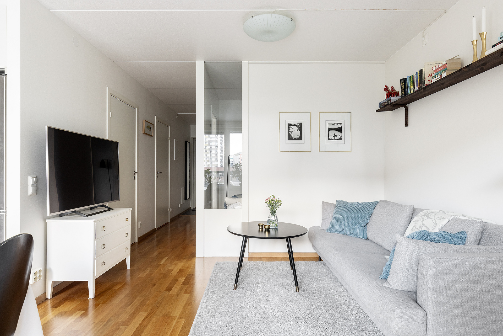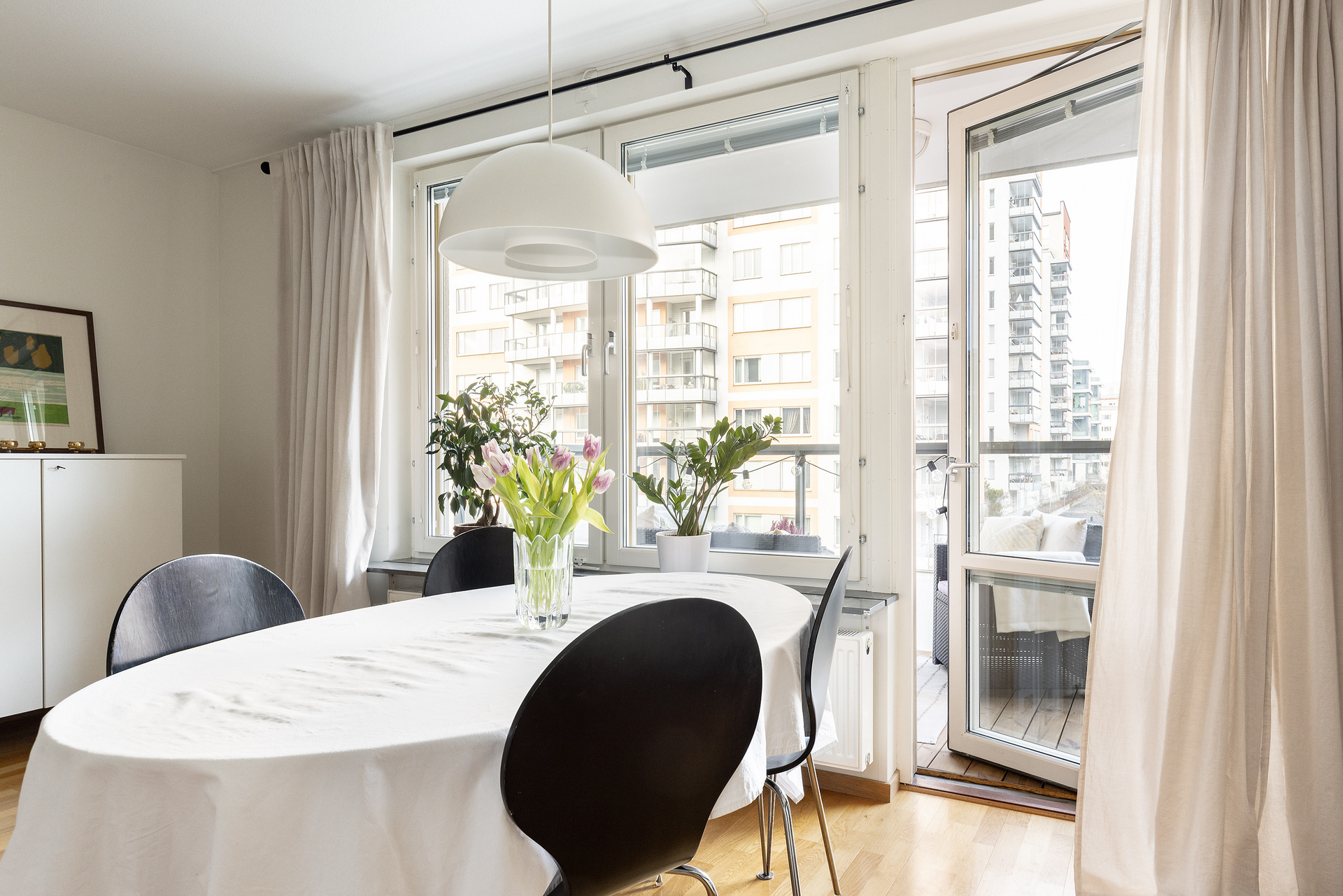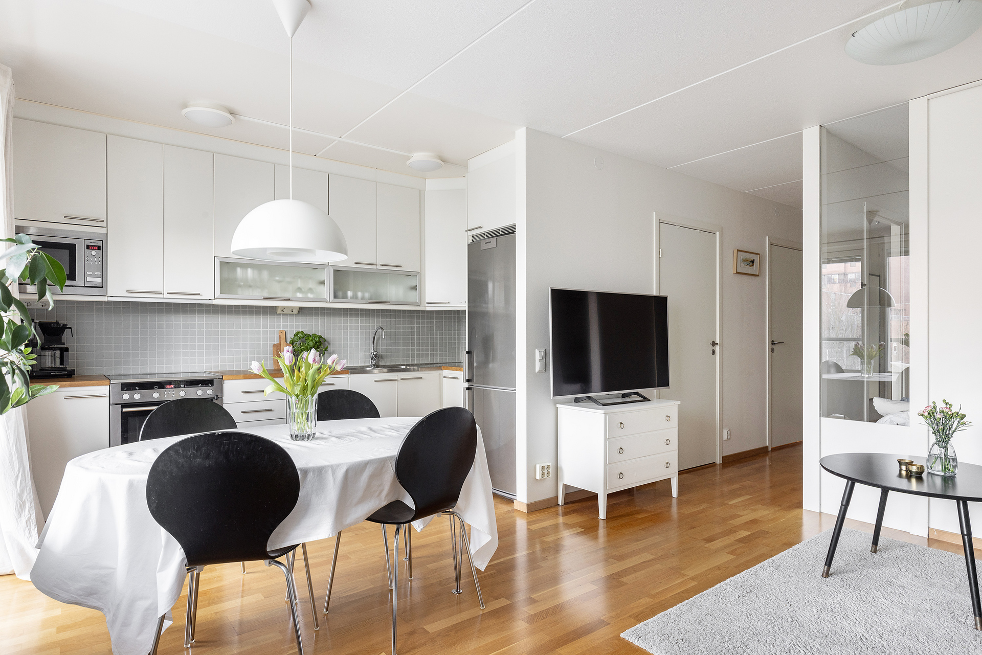 Ett ljust och luftigt vardagsrum som flyter samman med köket i en öppen och social planlösning. De generösa fönsterpartierna skapar ett härligt ljusinsläpp och förstärker känslan av rymd. Här finns gott om plats för en rymlig soffgrupp, soffbord och övrigt möblemang efter behov. Från vardagsrummet leder en helglasad dörr ut till den mysiga balkongen, vilket gör det enkelt att njuta av både inne- och utemiljön.