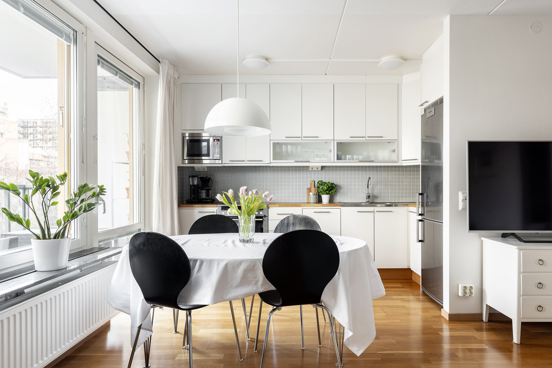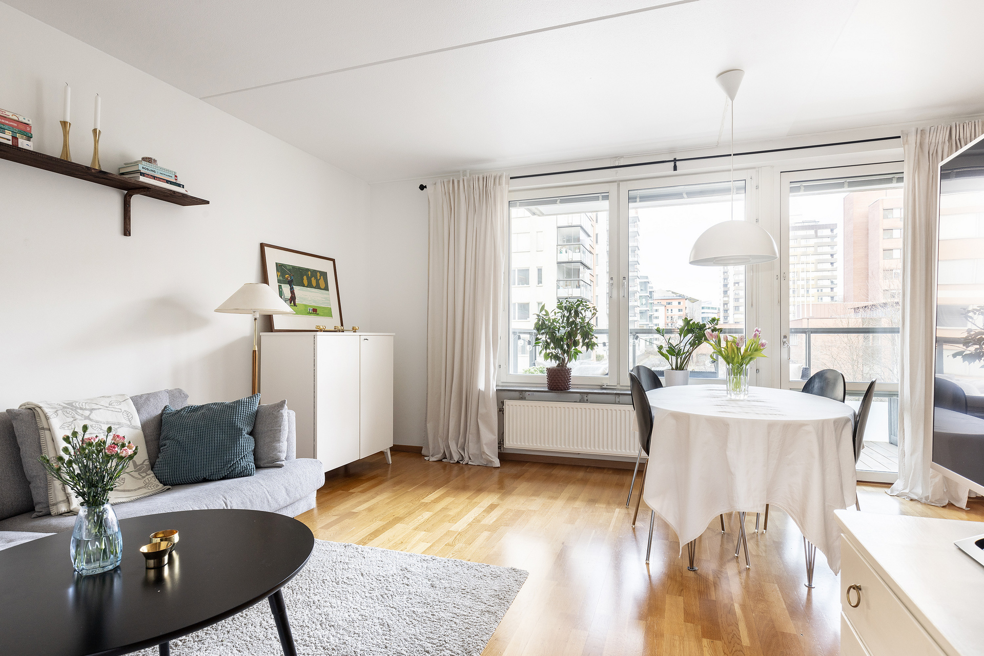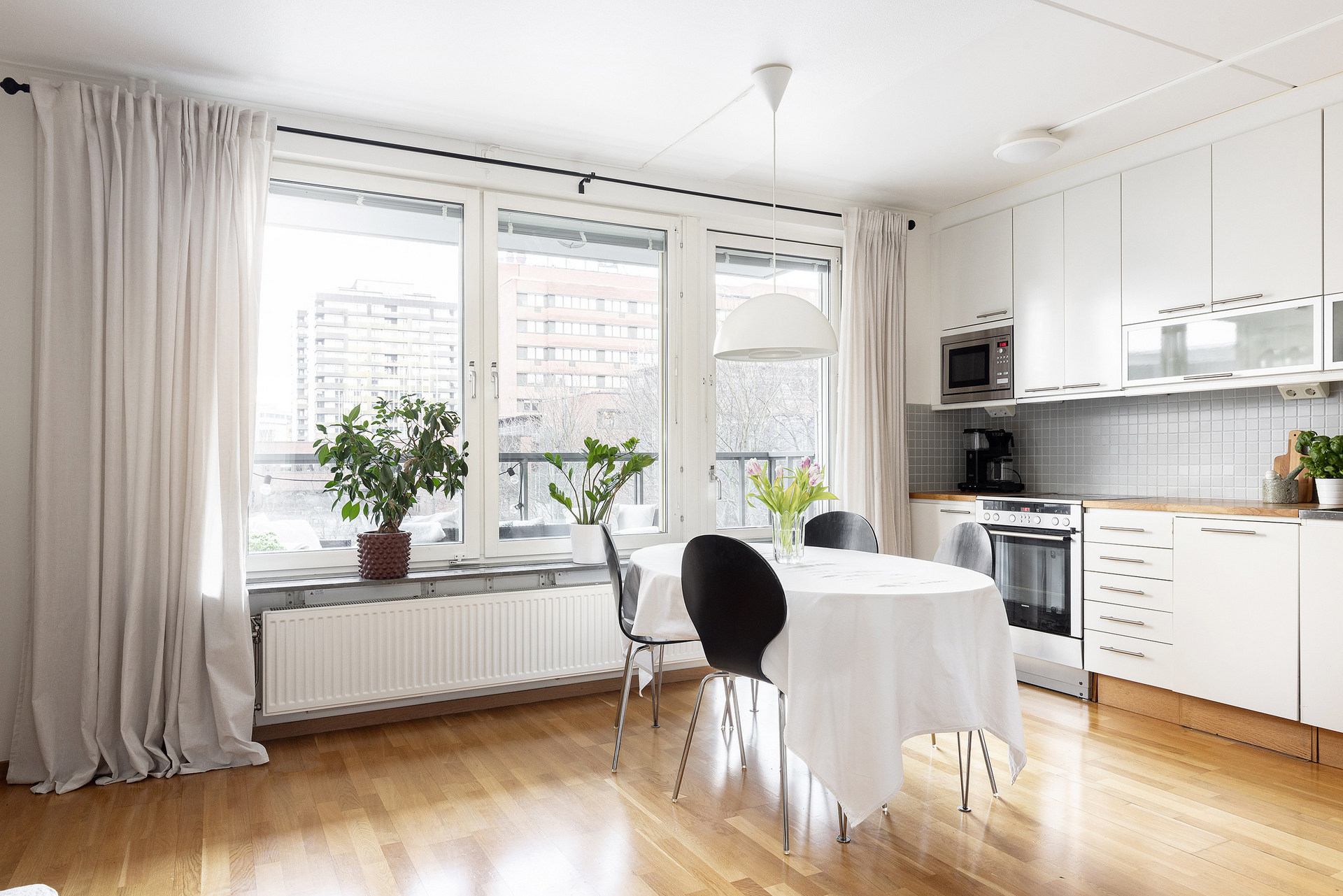 Ett ljust och luftigt vardagsrum som flyter samman med köket i en öppen och social planlösning. De generösa fönsterpartierna skapar ett härligt ljusinsläpp och förstärker känslan av rymd. Här finns gott om plats för en rymlig soffgrupp, soffbord och övrigt möblemang efter behov. Från vardagsrummet leder en helglasad dörr ut till den mysiga balkongen, vilket gör det enkelt att njuta av både inne- och utemiljön.