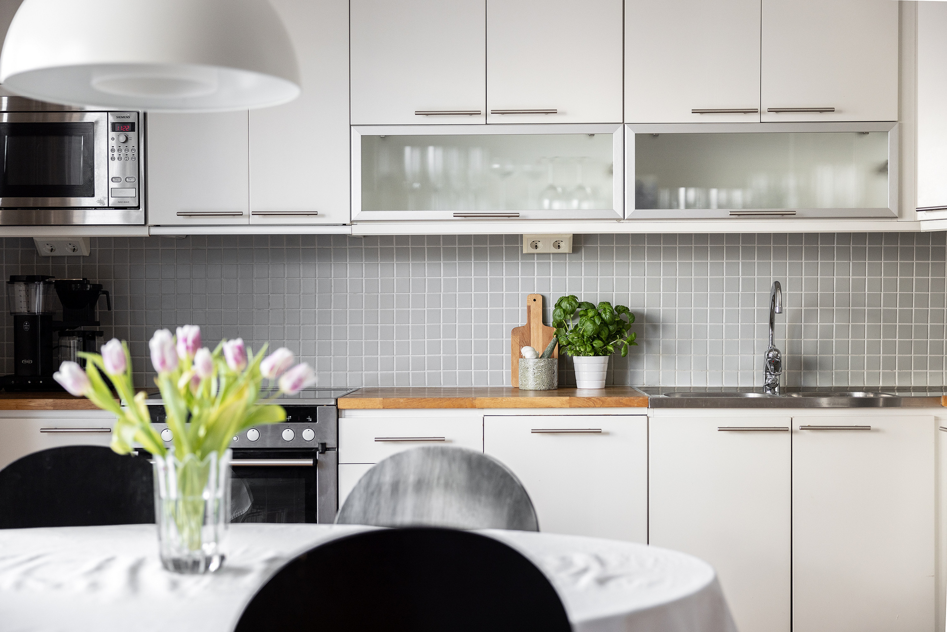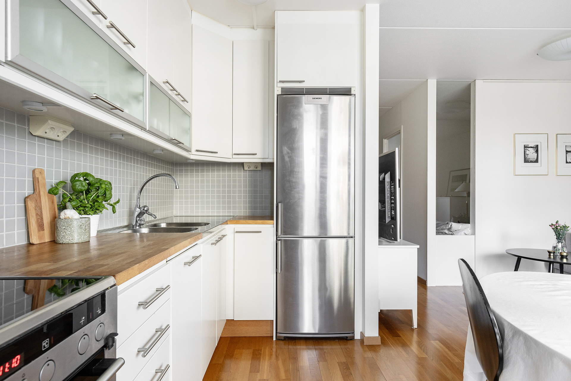 Ett smakfullt och stilrent kök där funktion och design samspelar på bästa sätt. De vita skåpluckorna ger ett tidlöst intryck och erbjuder generöst med förvaring, medan en vacker bänkskiva i ek skapar en varm och inbjudande känsla. Under de infällda spotlightsen får du optimal arbetsbelysning när du lagar mat. Här finns allt man kan önska sig i form av modern utrustning, inklusive integrerad diskmaskin, rostfri kyl och frys, spis med ugn samt mikrovågsugn. Intill fönstret finns plats för ett rymligt matbord där middagar kan avnjutas i en ljus och trevlig miljö.