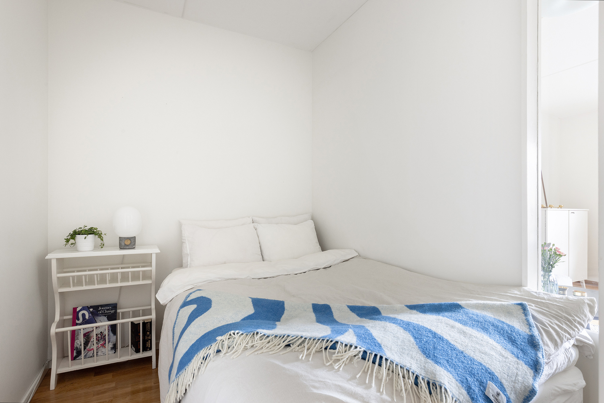 Rofylld och avskild sovalkov med plats för en större säng. Ett stilfullt glasparti släpper in ett behagligt ljus och skapar en luftig känsla samtidigt som sovdelen känns privat och ombonad.