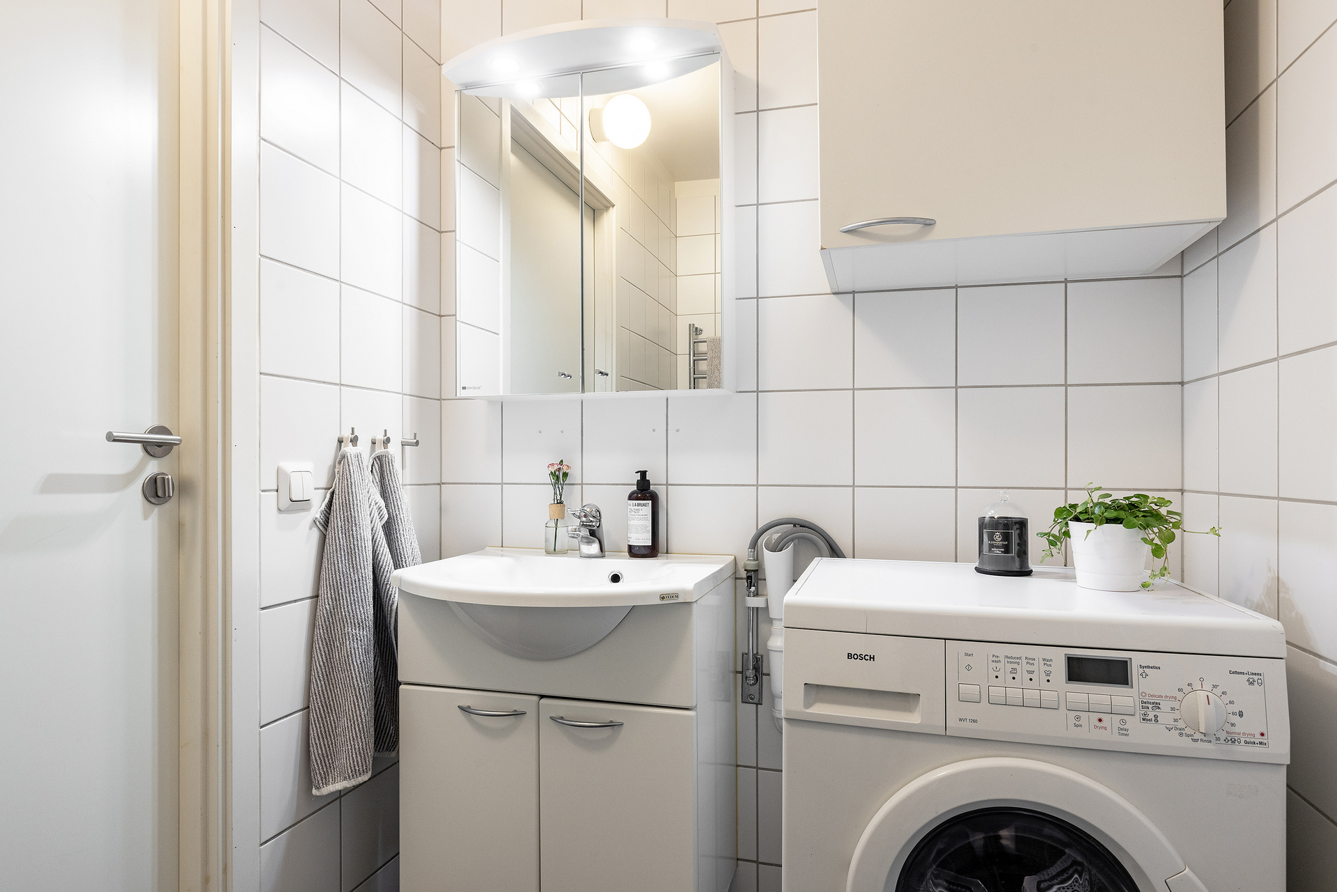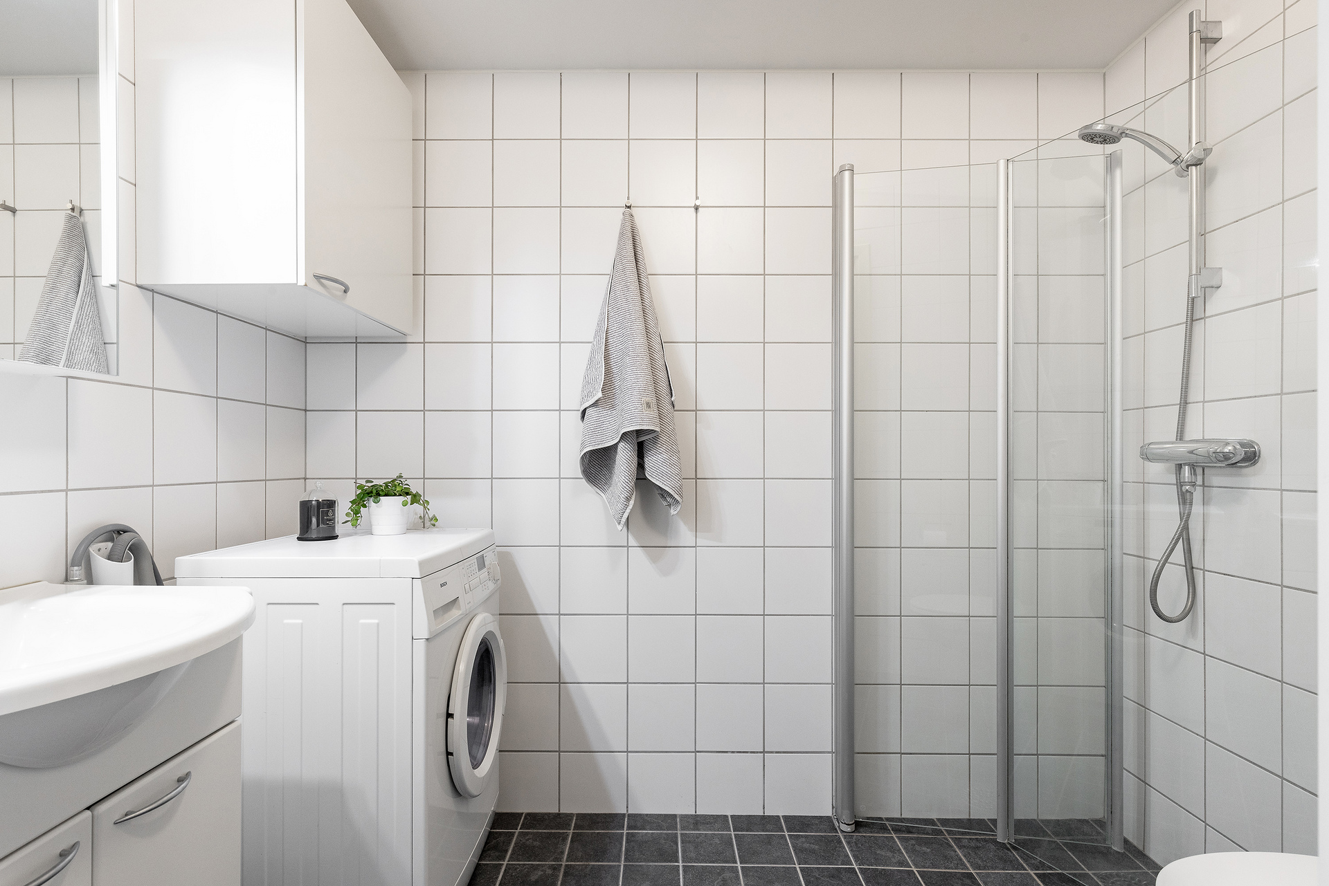 Stilrent och helkaklat badrum med en tidslös färgsättning – vita väggar kombineras med ett mörkt klinkergolv som skapar en elegant kontrast. Här finns alla bekvämligheter du kan önska, inklusive en kombinerad tvättmaskin och torktumlare, vägghängd toalett, duschhörna med glasväggar samt ett handfat med kommod och spegelskåp ovanför. En genomtänkt och funktionell miljö där både vardagsrutiner och avkoppling får ta plats.