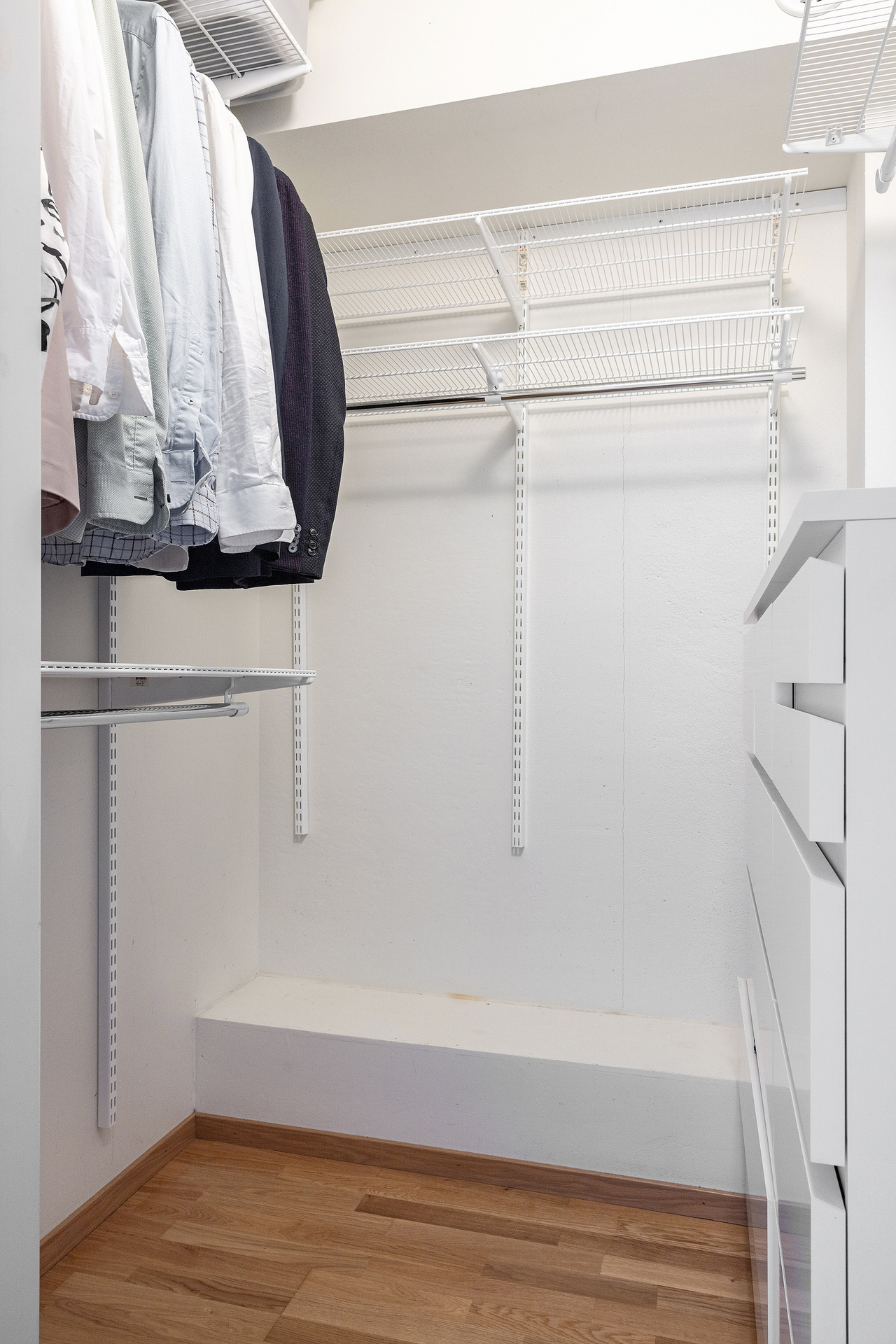 Stor och praktisk klädkammare med gott om plats för kläder, skor och övrig förvaring. Tack vare sin placering mellan hall och sovrum blir den både lättillgänglig och funktionell – en perfekt lösning för den som vill ha ordning och reda i hemmet.