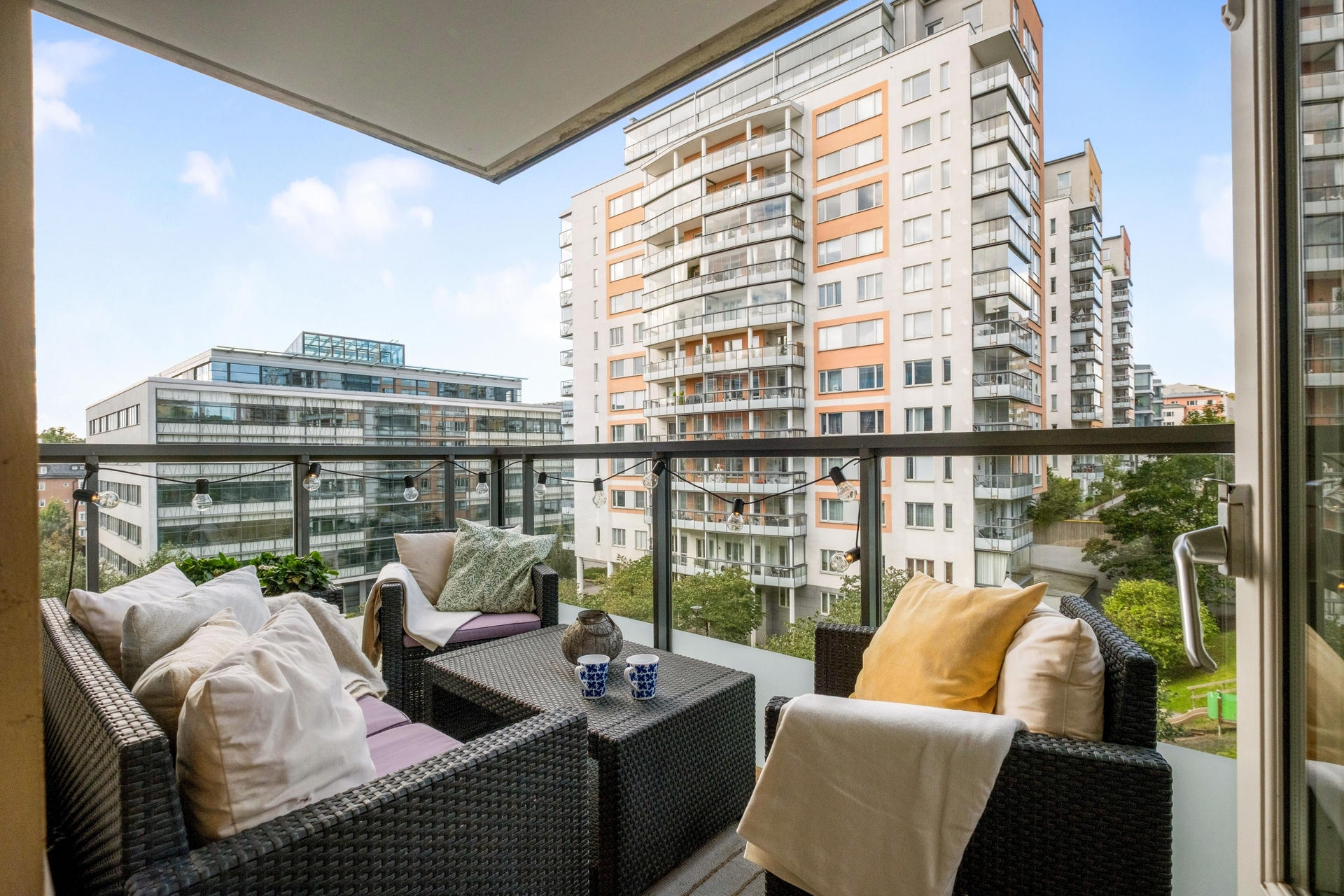 En trivsam balkong med utsikt mot grönska, där du kan skapa din egen lilla oas. Här finns gott om plats för ett caféset eller en skön loungemöbel där du kan njuta av både morgonkaffet och långa sommarkvällar.