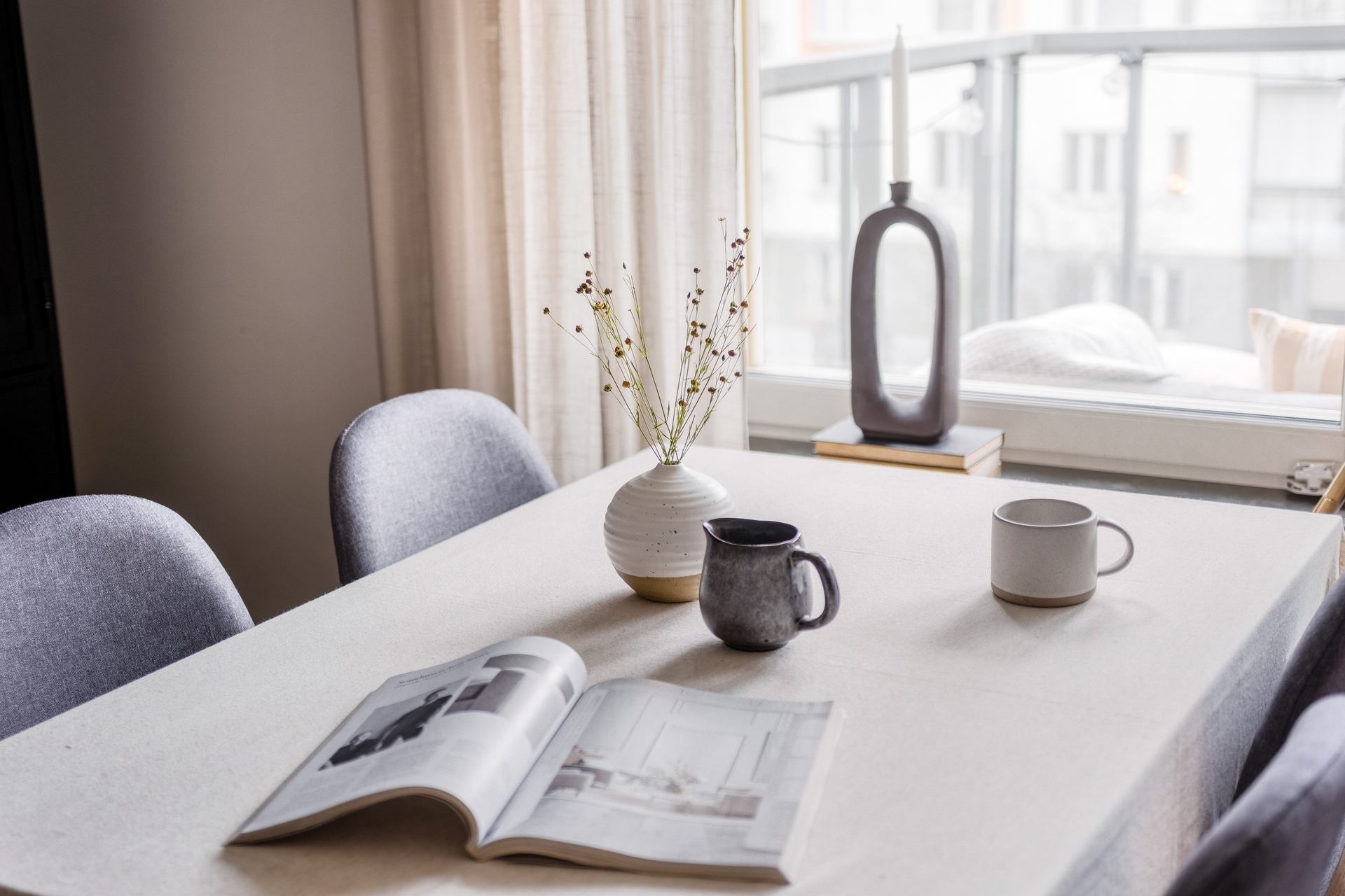 Ljus gaveltrea med insynsskyddat läge och balkong mot gården.