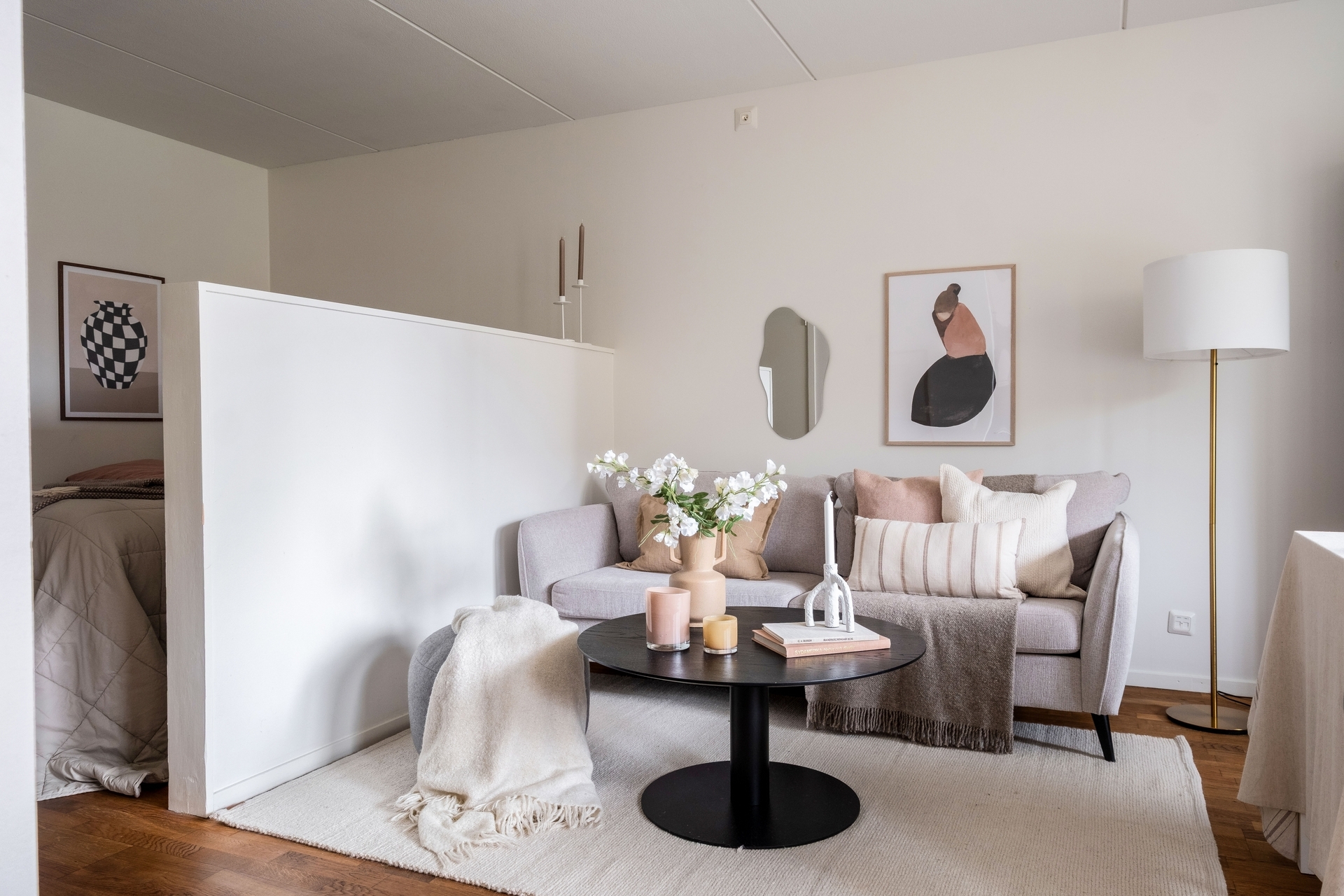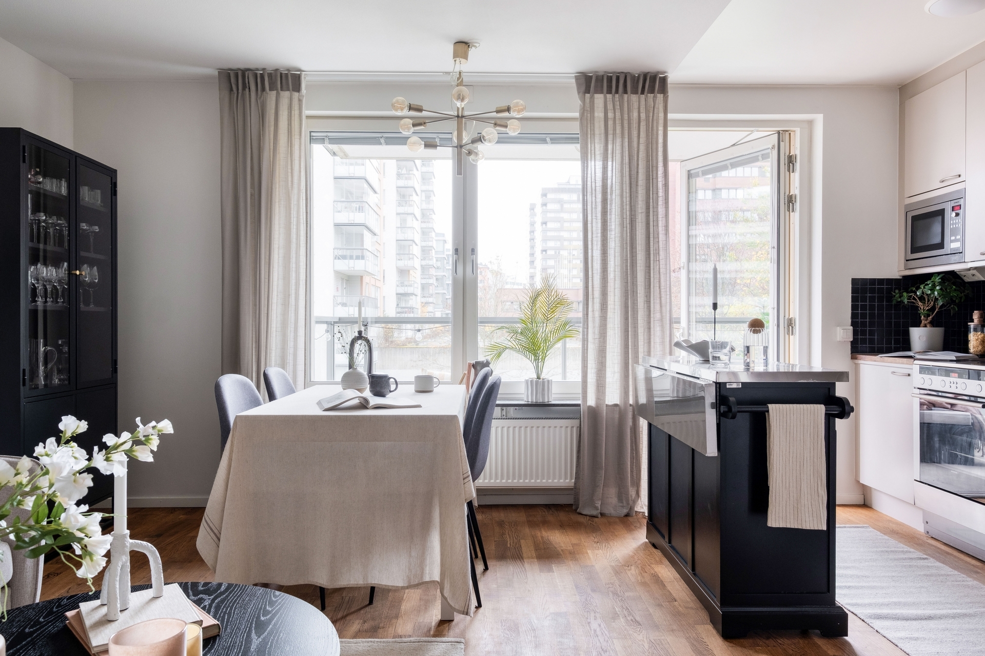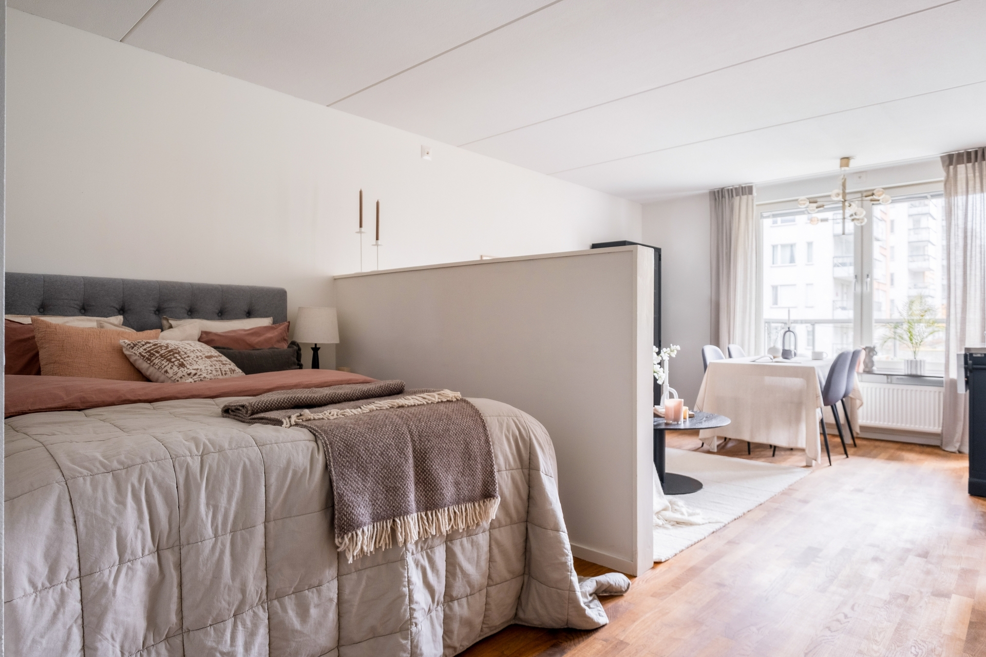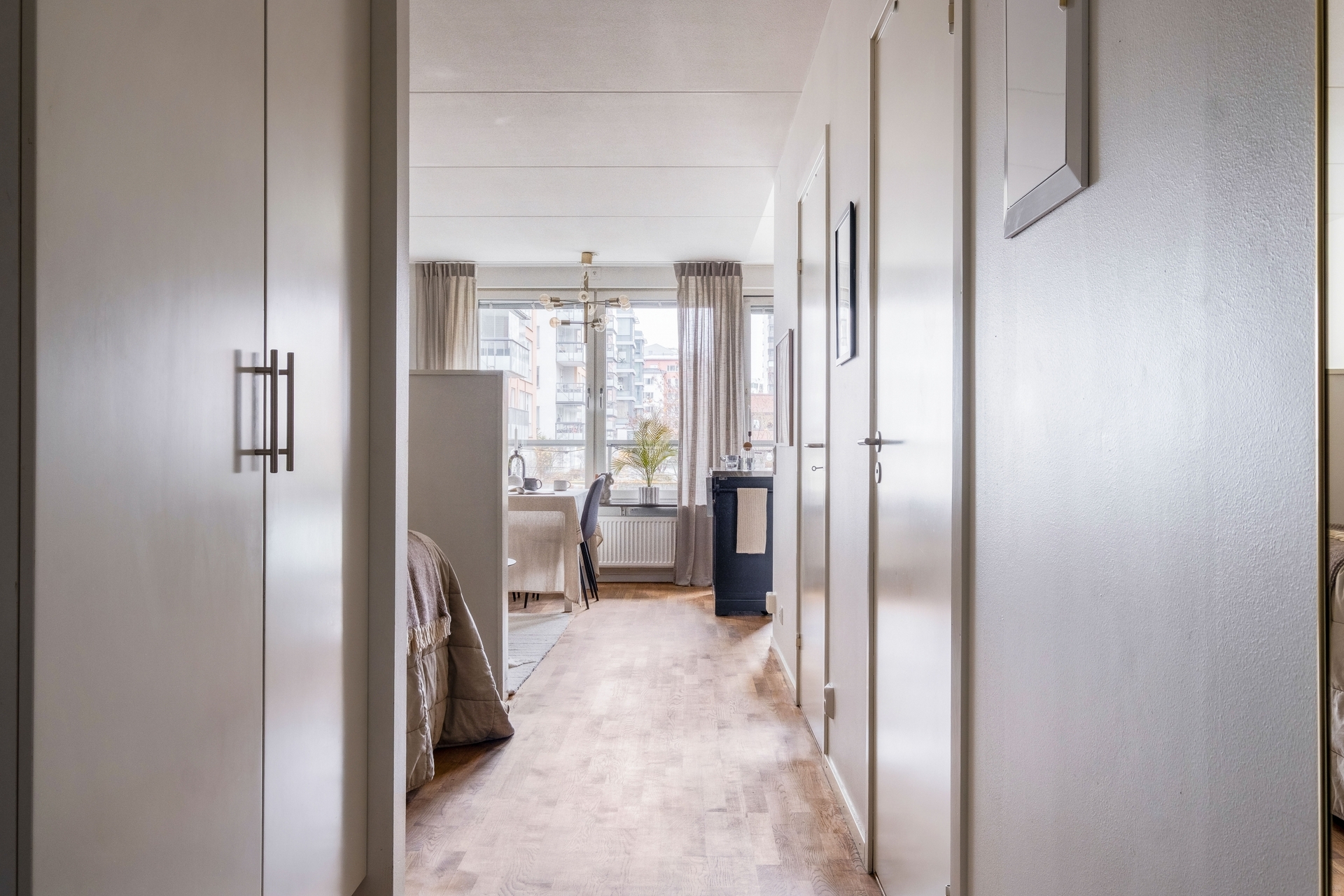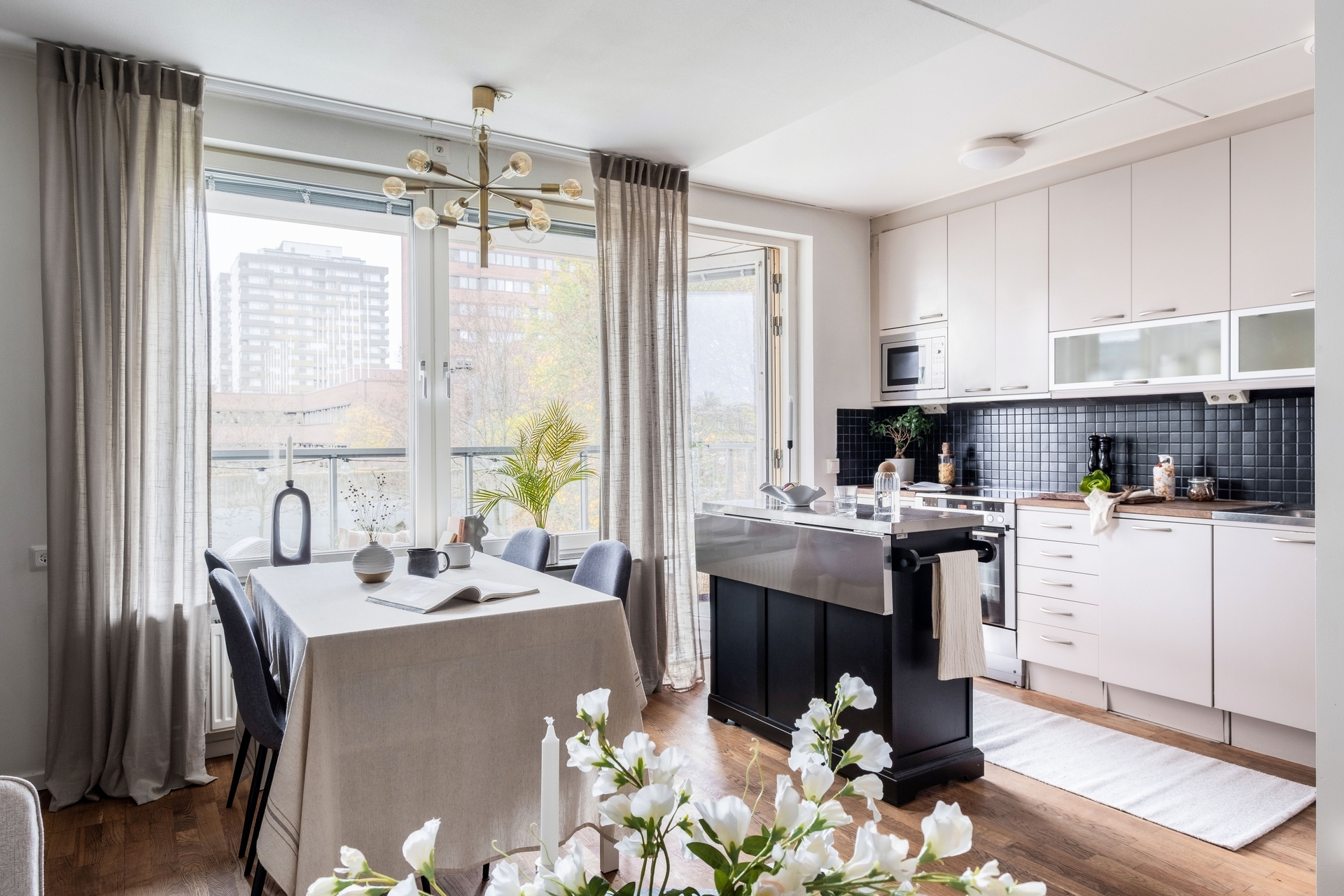 Dubbla balkonger, sjöglimt, 2,60 m i tak och plats för köksö i köket.