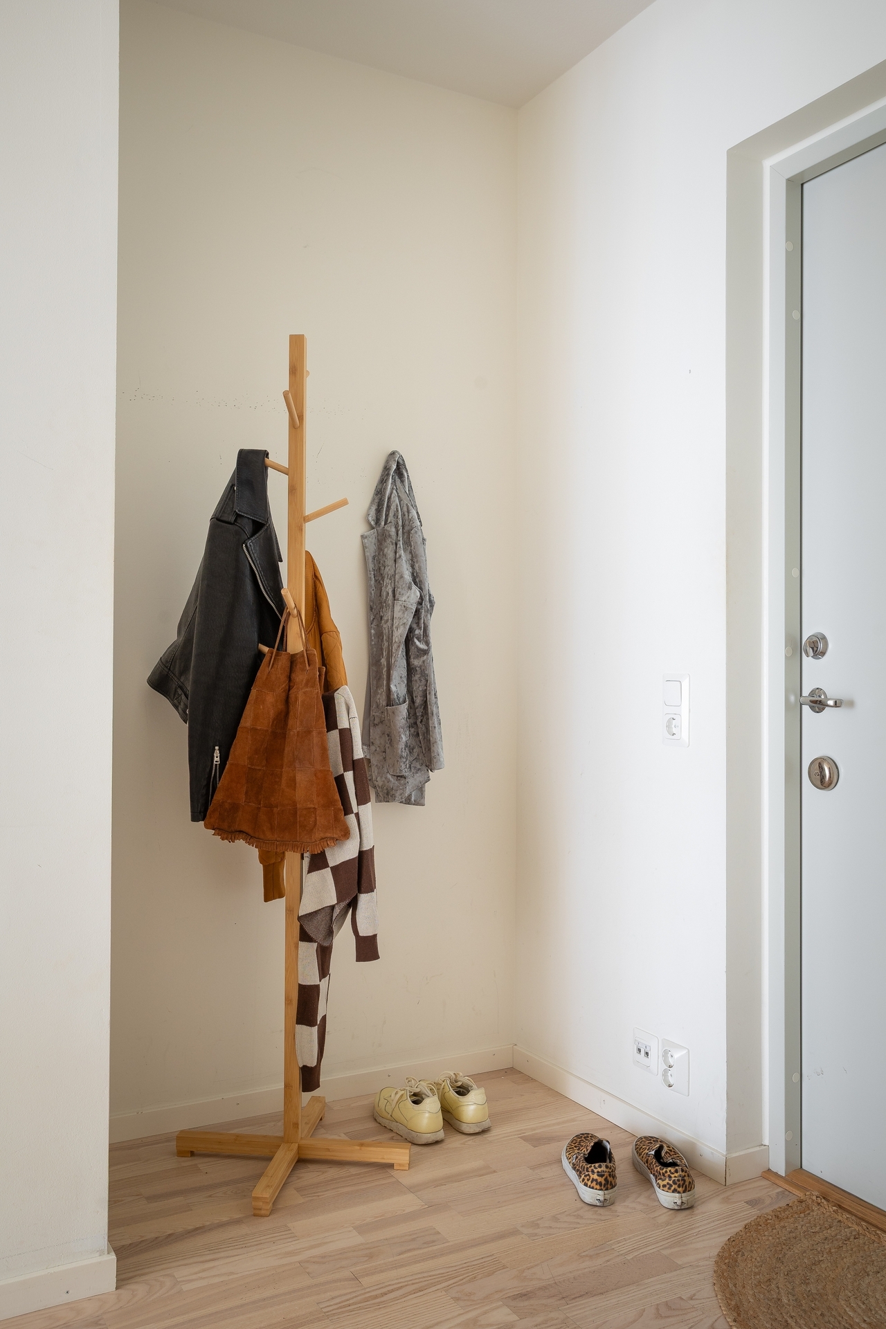 En välkomnande hall som ger en försmak av bostadens ljusa och öppna karaktär. Redan vid entrén möts man av ett härligt ljusinsläpp från vardagsrummets stora panoramafönster. Här finns plats för ytterkläder och skor, samt praktisk förvaring i garderob. Entrédörren är en säkerhetsdörr som bidrar till både trygghet och tystnad.
