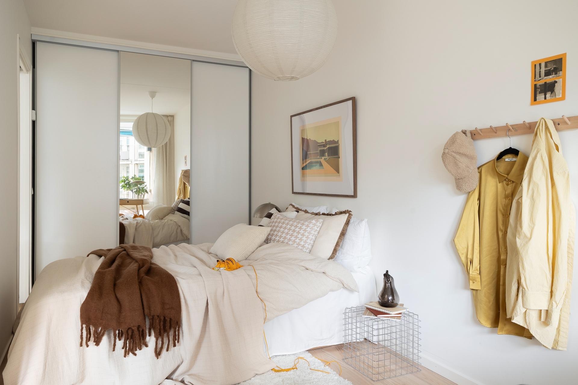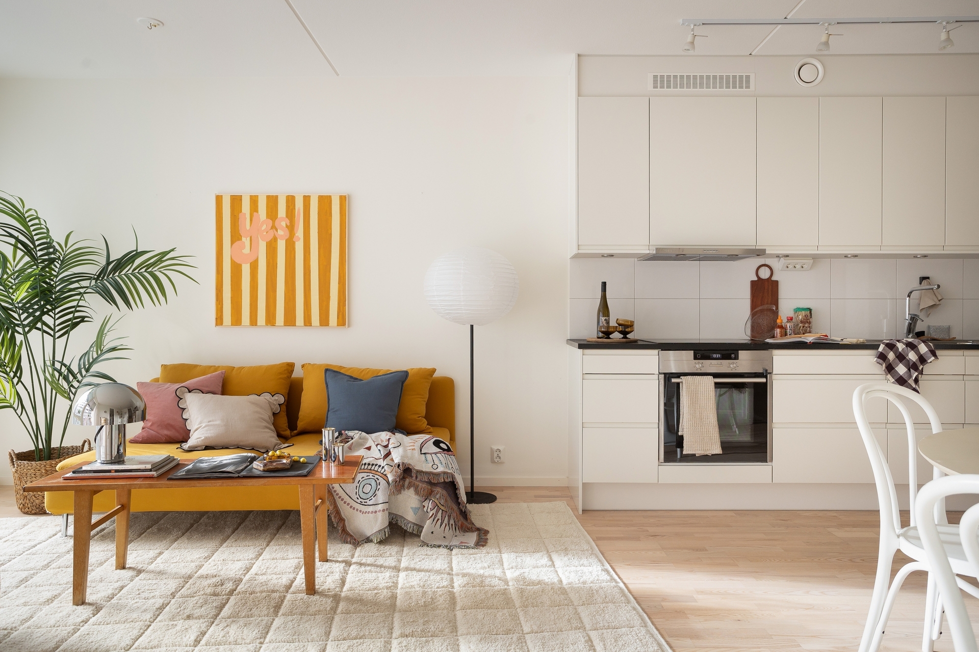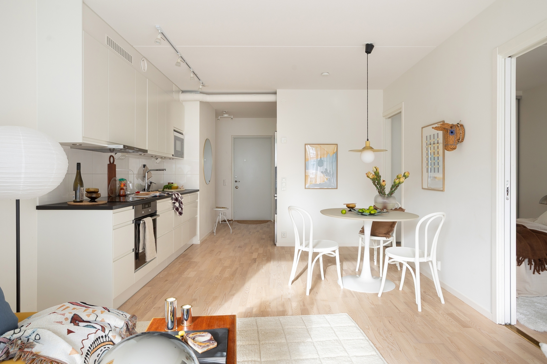 Lägenheten har ett genomgående ljust parkettgolv, vitmålade väggar och vetter mot den lugna gården. Här råder en harmonisk känsla med genomtänkta materialval och en planlösning som utnyttjar varje kvadratmeter på bästa sätt.