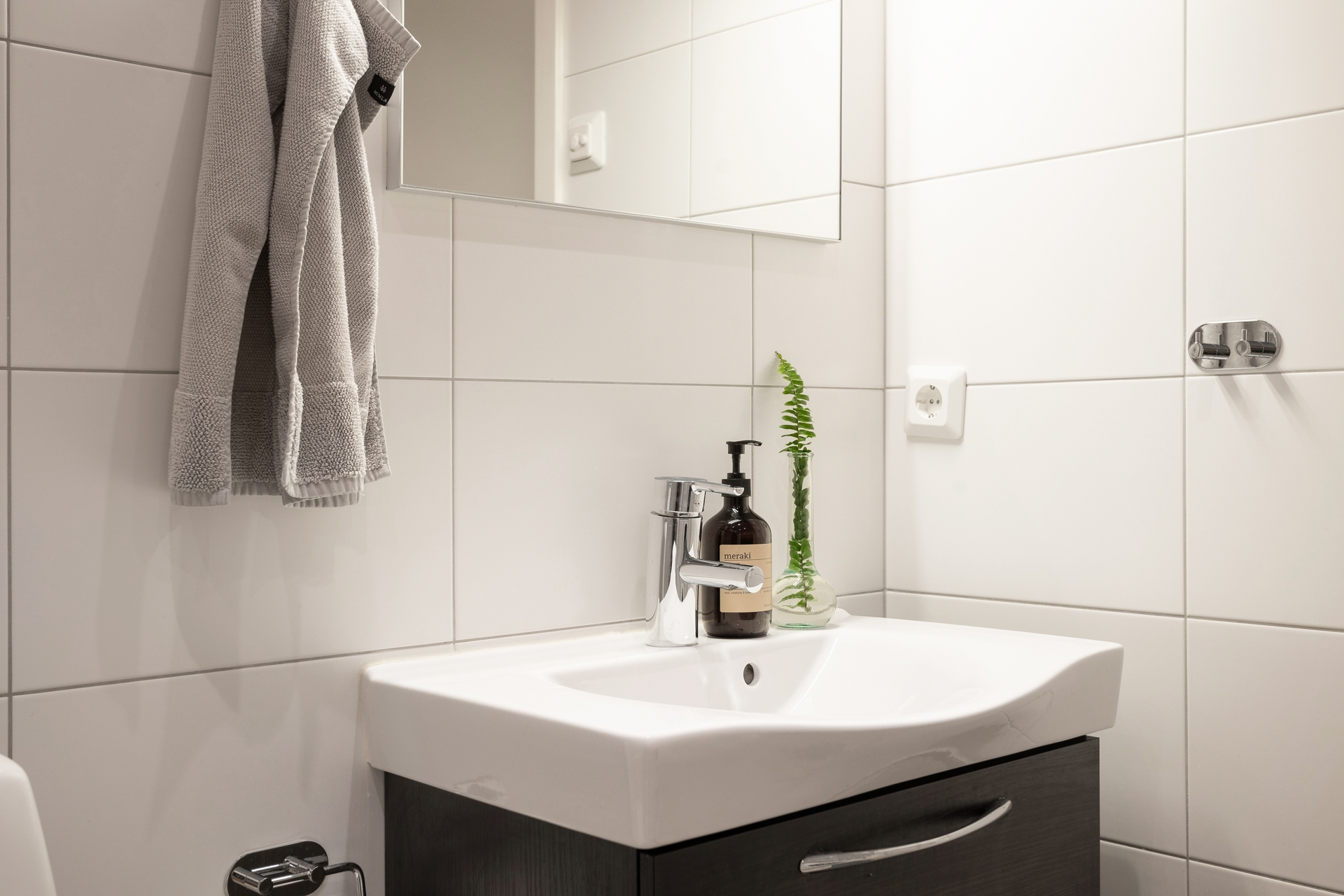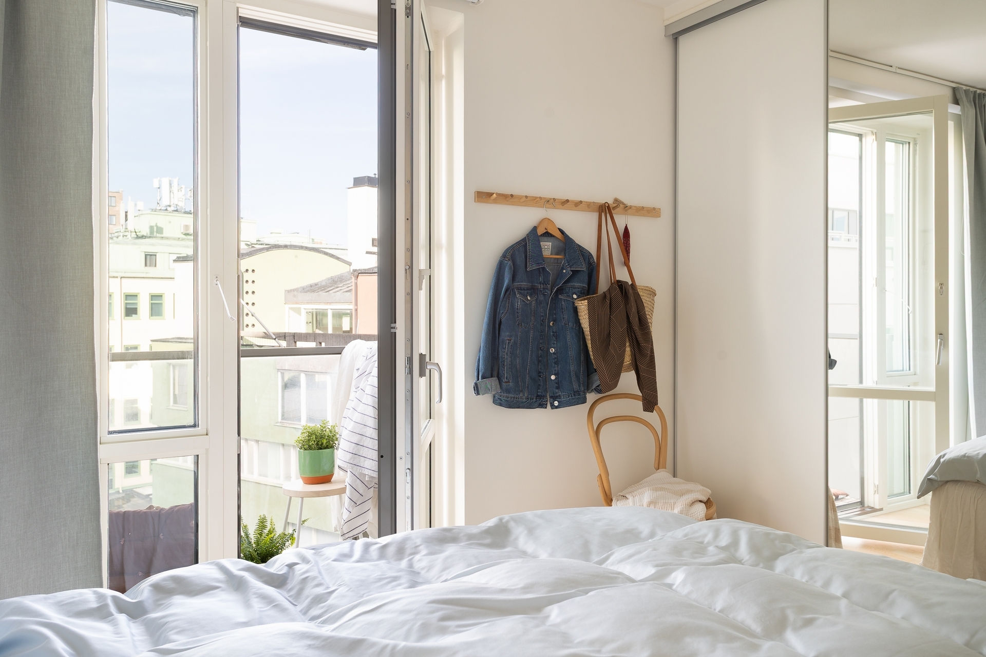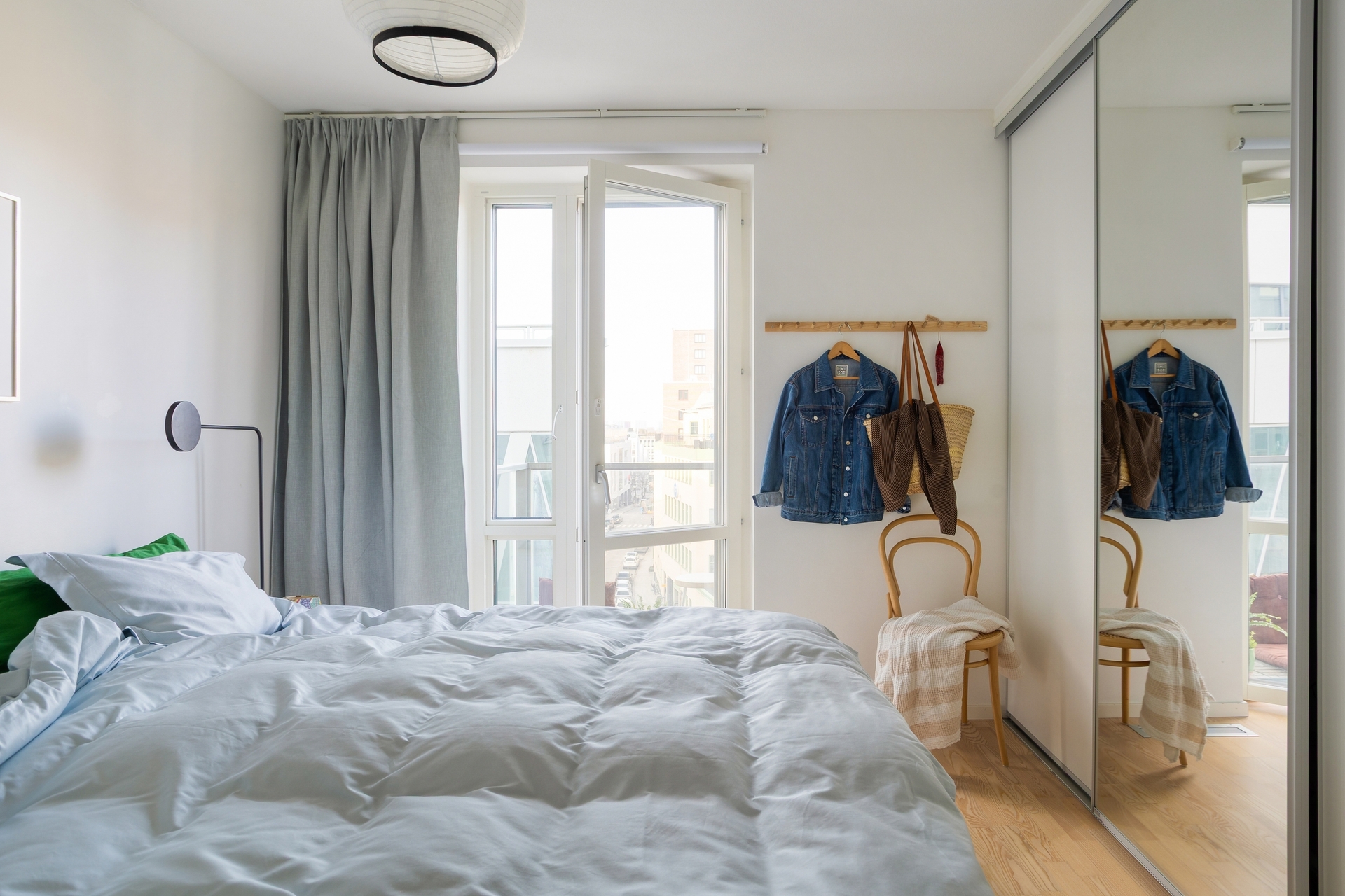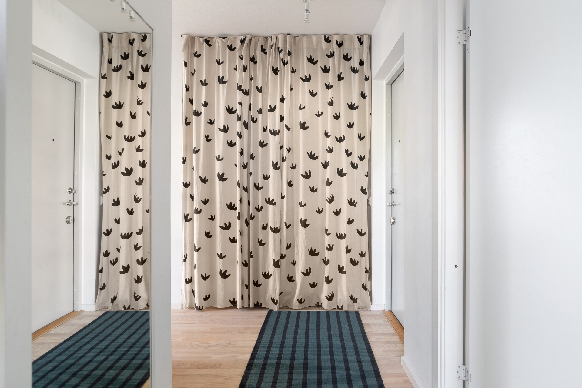 Entrén välkomnar med en rymlig och praktisk hall där det finns gott om plats för avhängning av ytterkläder och skor. Förvaringen kompletteras av garderob och tack vare den franska balkongen möts man redan här av bostadens ljusa karaktär och öppna känsla.