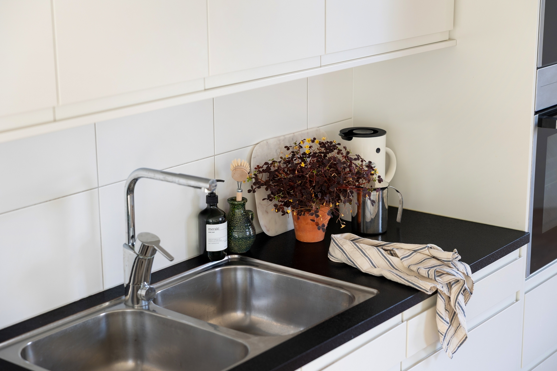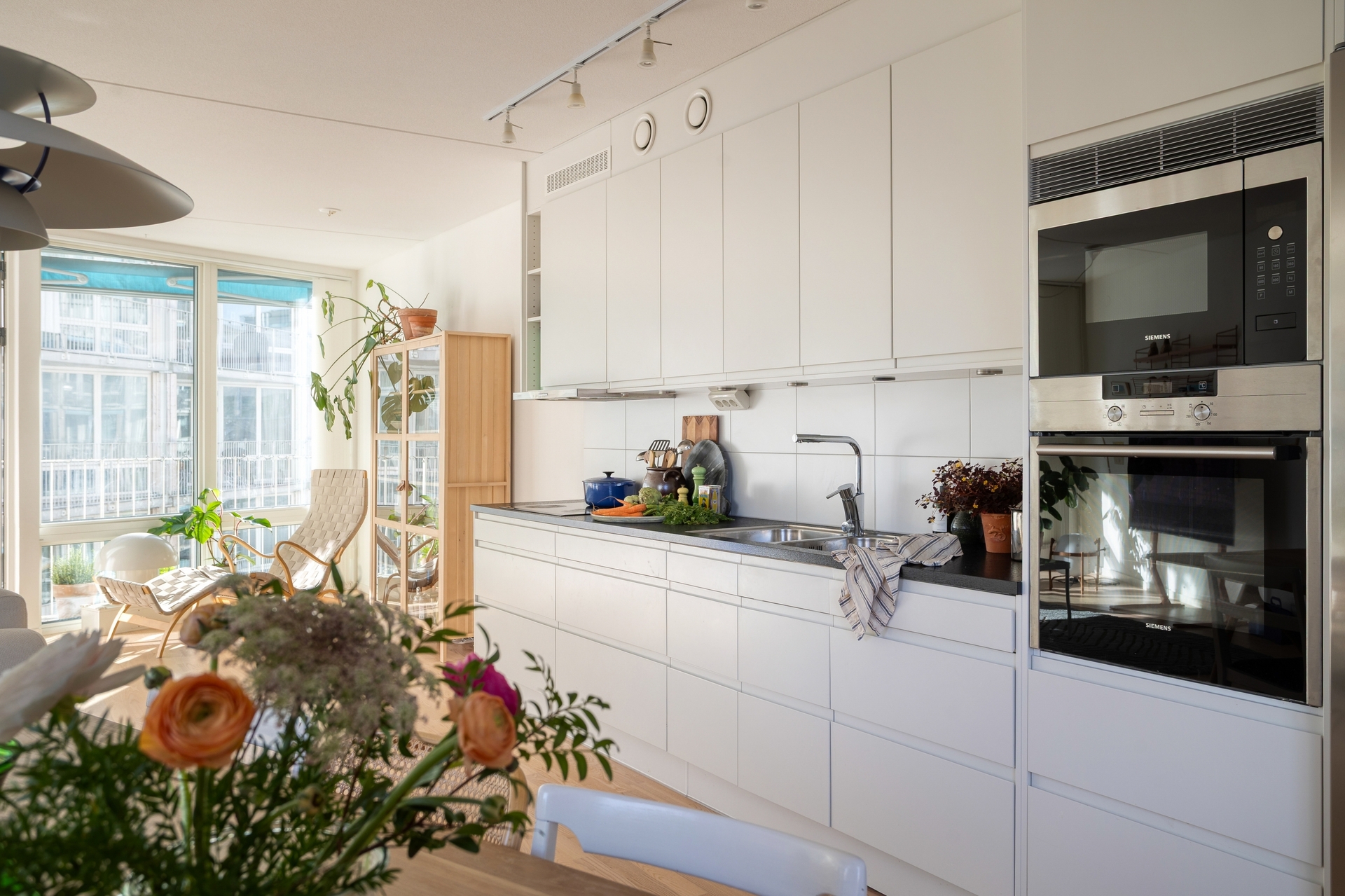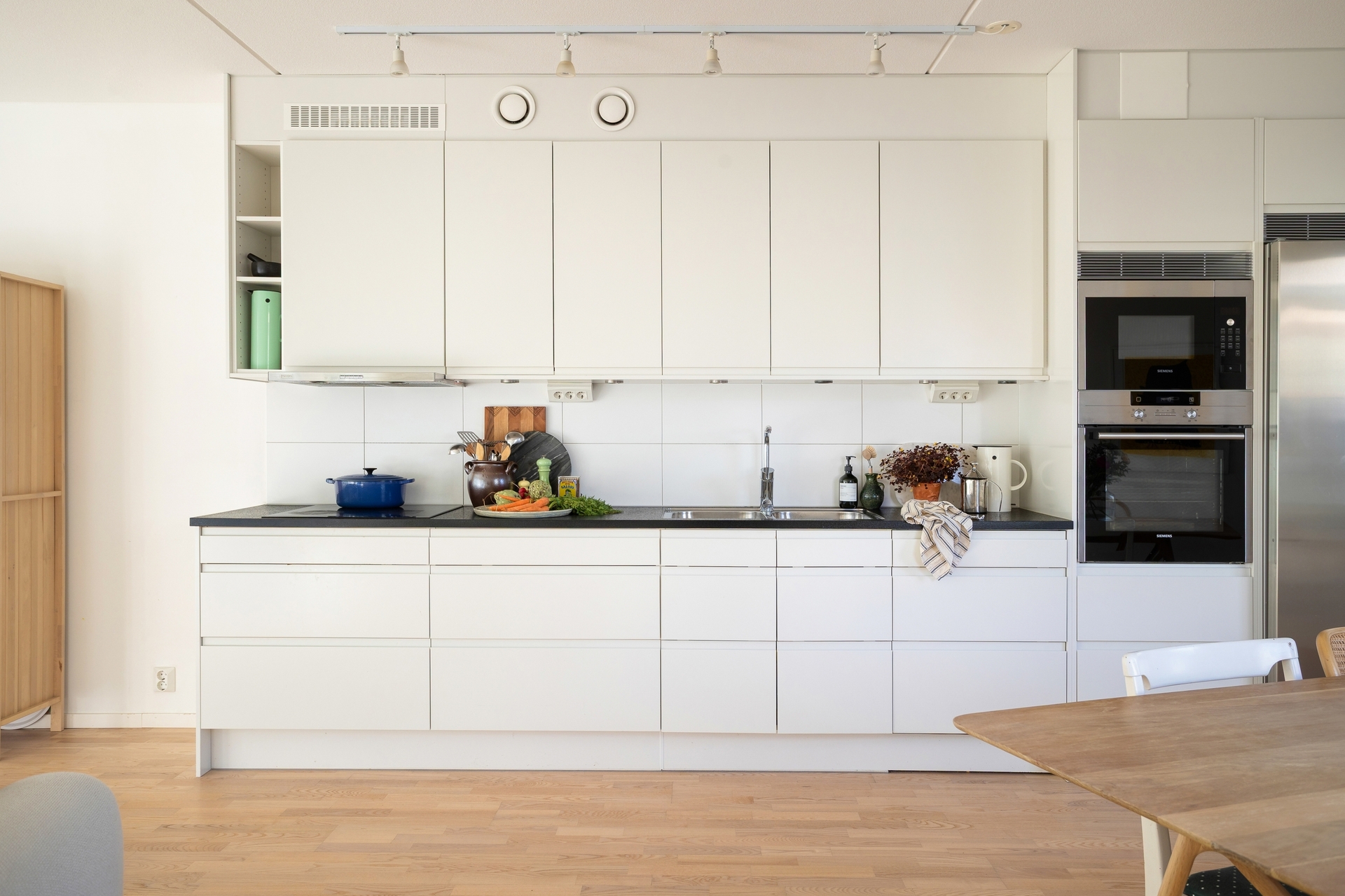 Smakfullt kök från Myresjö med stilren design och god funktion. Förvaringen är väl tilltagen bakom vita, handtagslösa luckor och arbetsytorna är generösa. Belysning under överskåpen ger både bra arbetsljus och en modern känsla. Köket är utrustat med induktionshäll, ugn, mikro, kyl/frys samt integrerad diskmaskin.