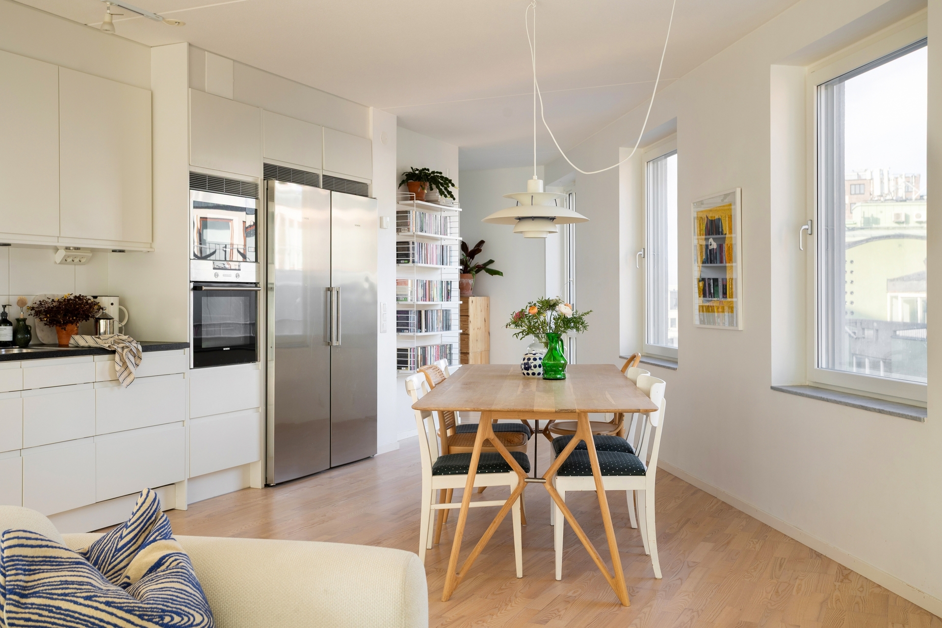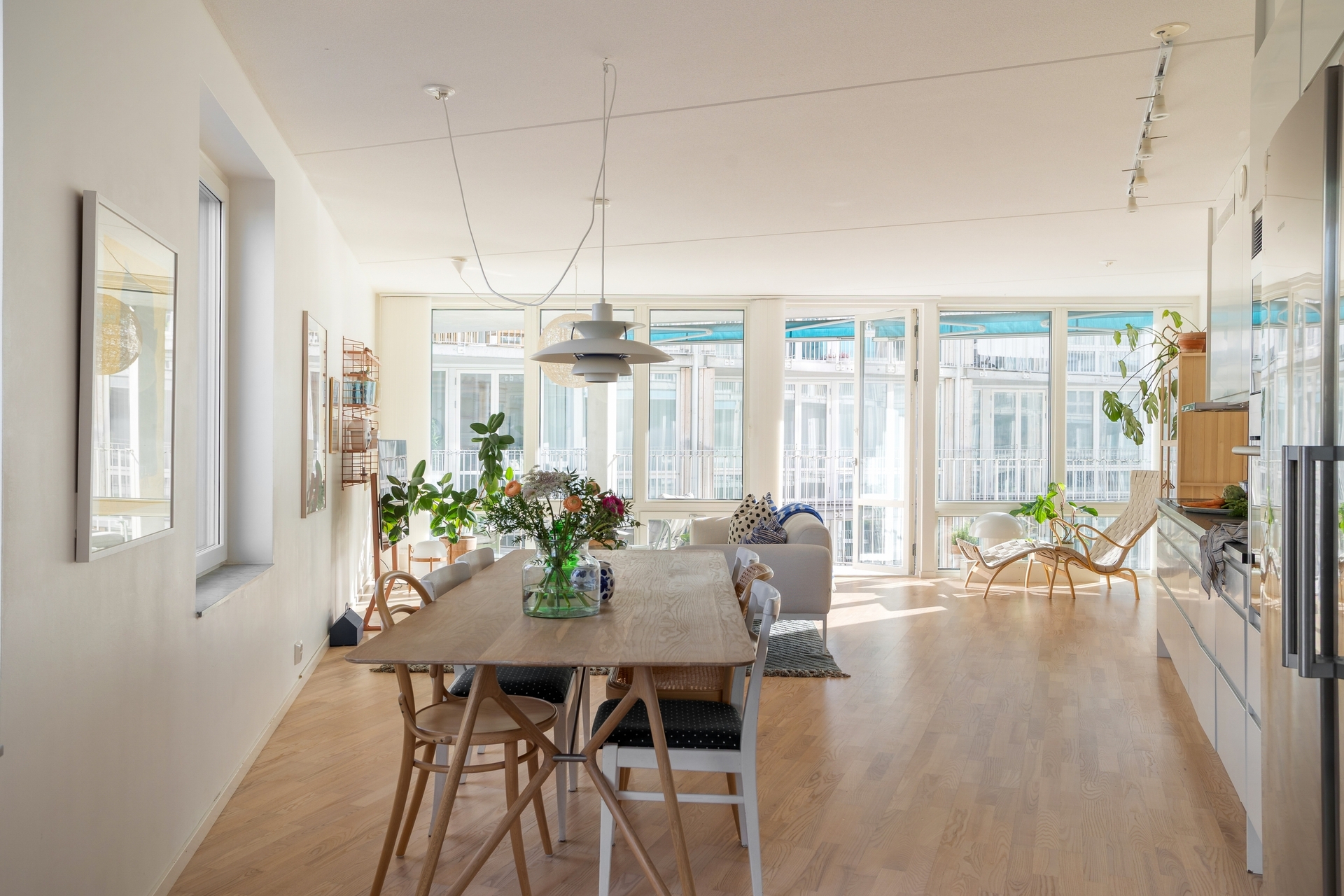Ett generöst vardagsrum med härligt ljusinsläpp från två håll och stora panoramafönster som sträcker sig från golv till tak. Den öppna planlösningen mot köket skapar en social och inbjudande miljö med gott om plats för soffgrupp, mediamöbel, bokhyllor och en rymlig matplats för större middagar.