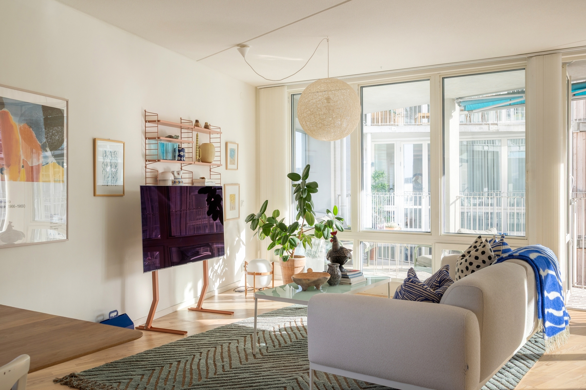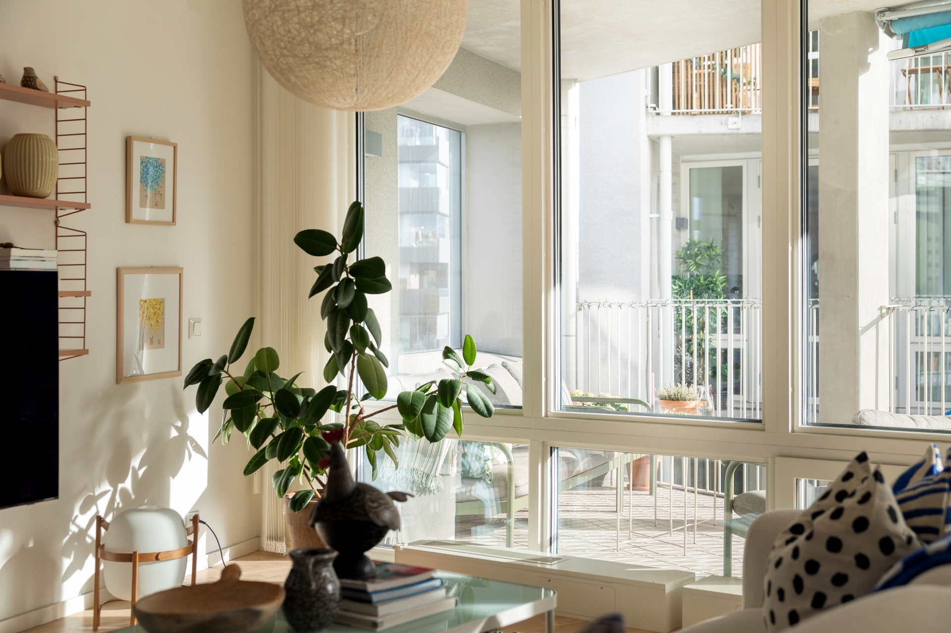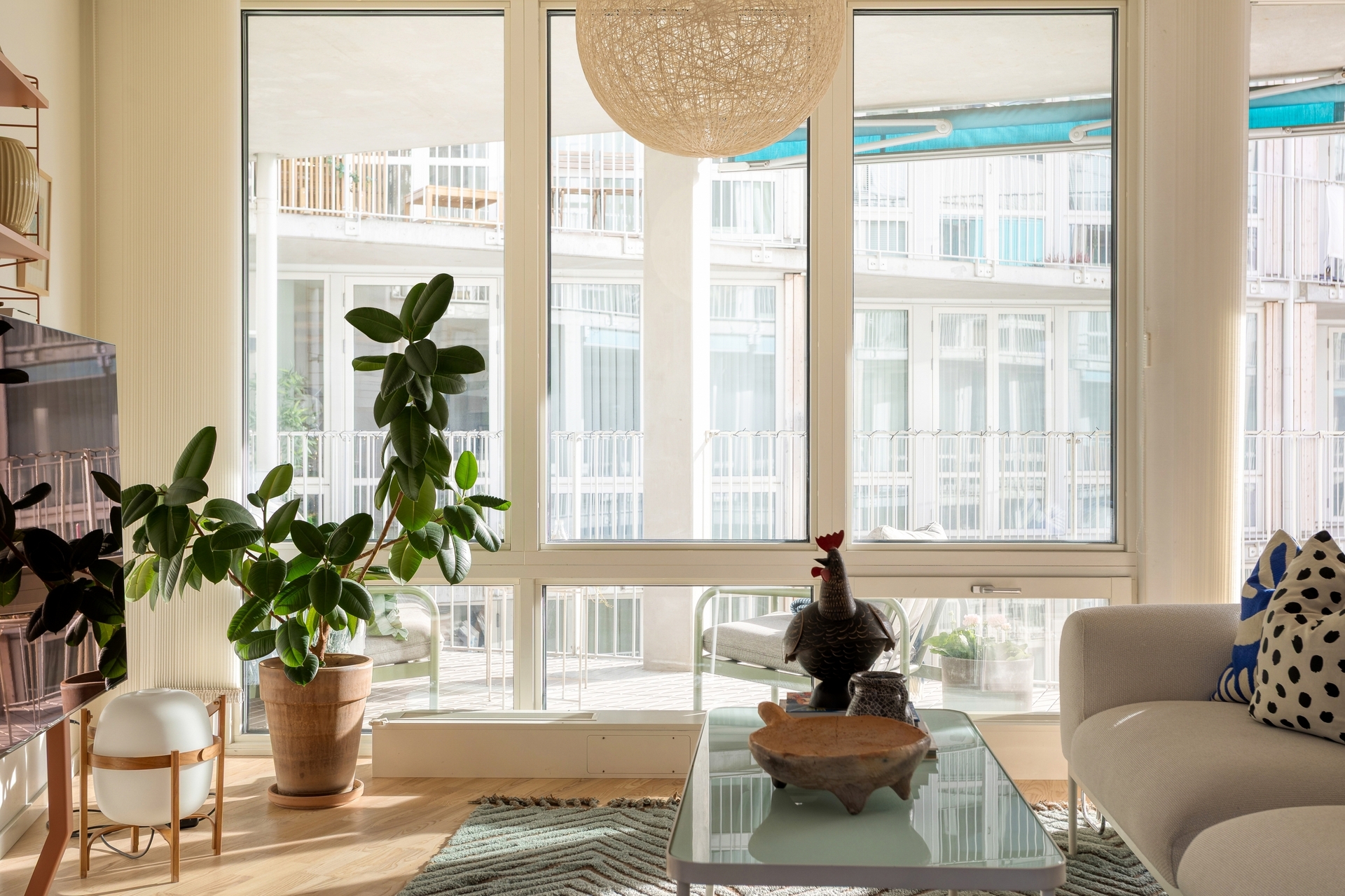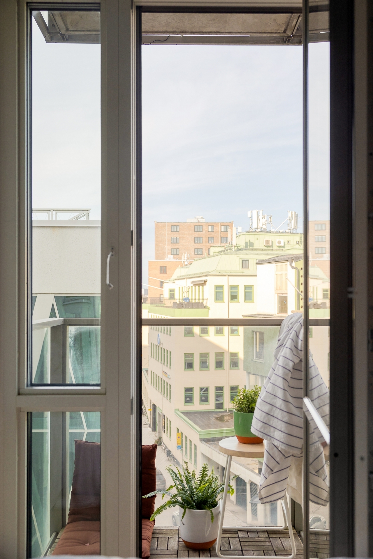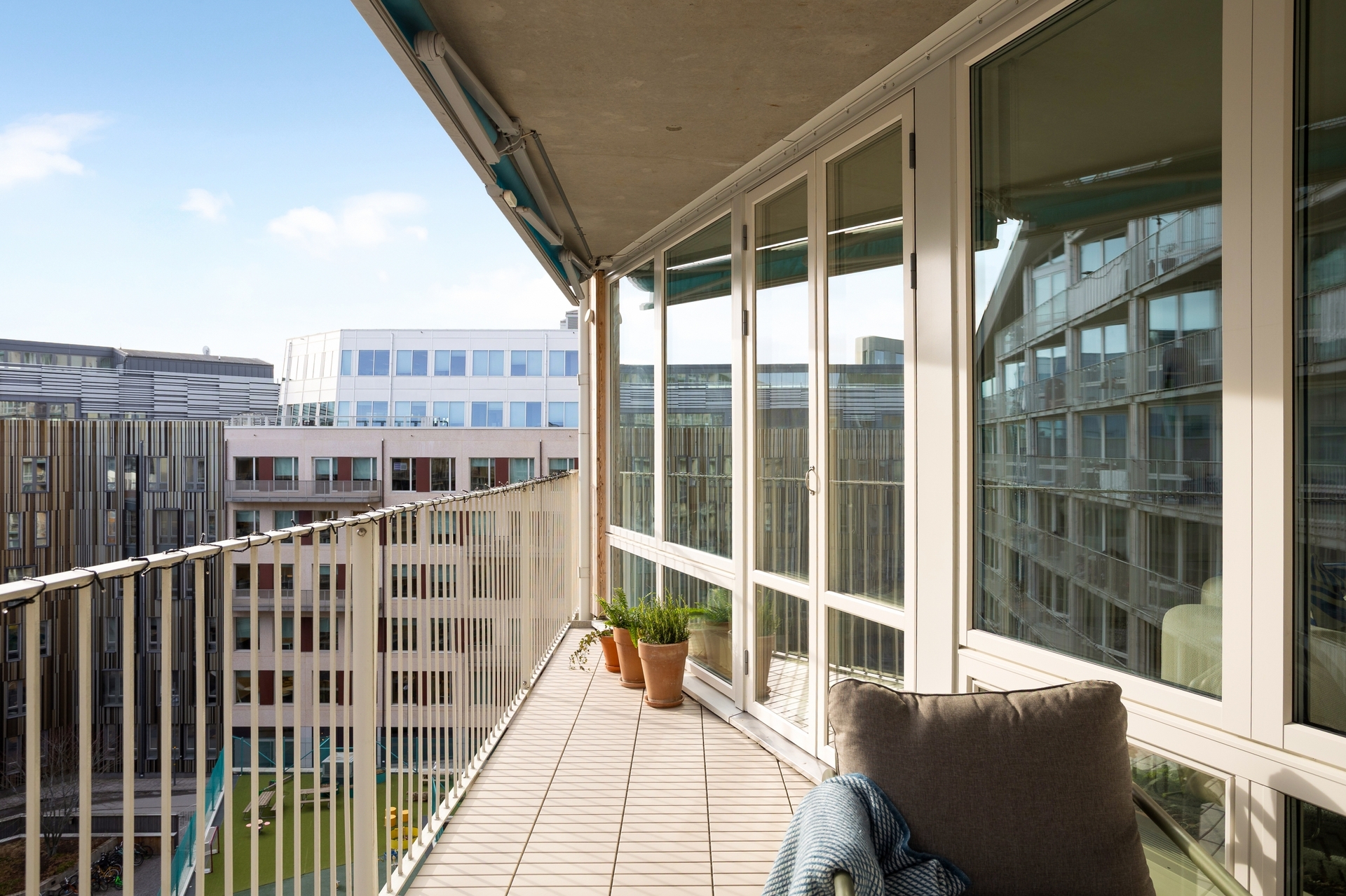Från vardagsrummet nås den rymliga södervända balkongen om 13 kvm med utsikt mot innergården. Här finns markiser som ger välbehövlig skugga under sommarmånaderna samt gott om plats för loungemöbler, matgrupp, odlingar och grill – en naturlig förlängning av bostaden under sommarhalvåret.