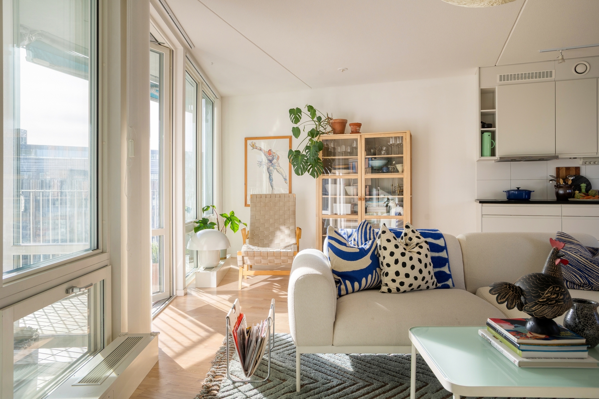 Välkommen till denna välplanerade och stilrena hörnlägenhet med generöst ljusinsläpp och stor balkong om 13 kvm mot rofylld innergård högt upp i huset. De helglasade pardörrarna suddar ut gränsen mellan ute och inne och skapar en naturlig förlängning av vardagsrummet under årets varmare månader. Bostaden erbjuder en flexibel planlösning med sociala ytor och möjlighet att disponera om till fyra rum för den som har behov av ytterligare sovrum eller arbetsrum. De stora fönsterpartierna i kombination med ljusa ytskikt och genomgående ljusa golv ger hemmet en modern och luftig känsla. Här finns två rymliga sovrum, där det större har egen vädringsbalkong. Badrummet är utrustat med en praktisk tvättdel som förenklar vardagen. Förvaringsmöjligheterna är goda och till lägenheten hör även ett källarförråd. Föreningen är stabil och omtyckt med god ekonomi och en grön innergård som rymmer både pergola, förskola och lekplats. Garage finns i huset och nås bekvämt via hiss, lediga platser finns. Fastigheten är energieffektiv, föreningen äger marken och arbetar aktivt med hållbarhetsfrågor, vilket ger möjlighet till grönt bolån med ränterabatt.