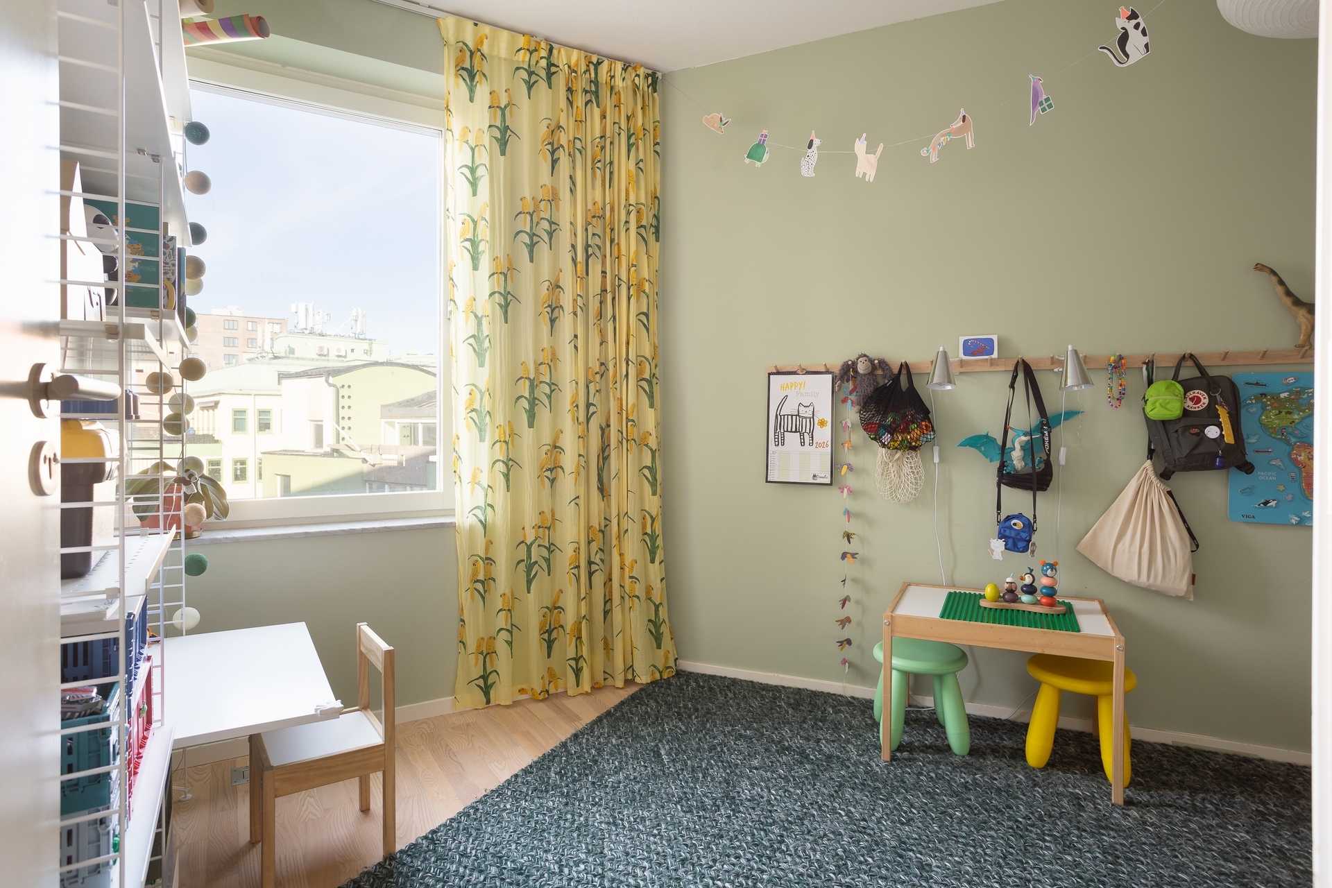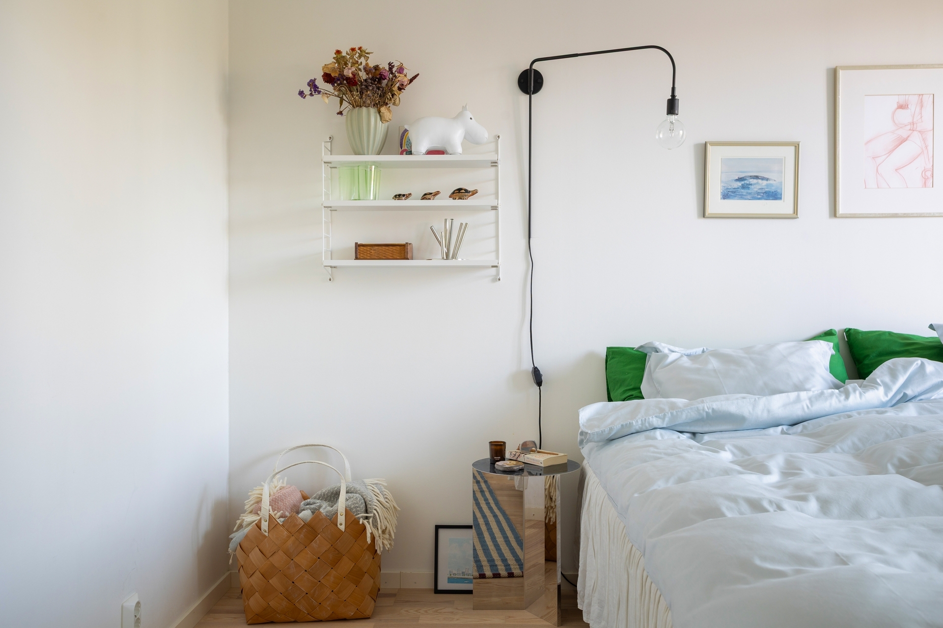 Genomgående vitpigmenterade trägolv samt väggar målade i ljusa nynaser.