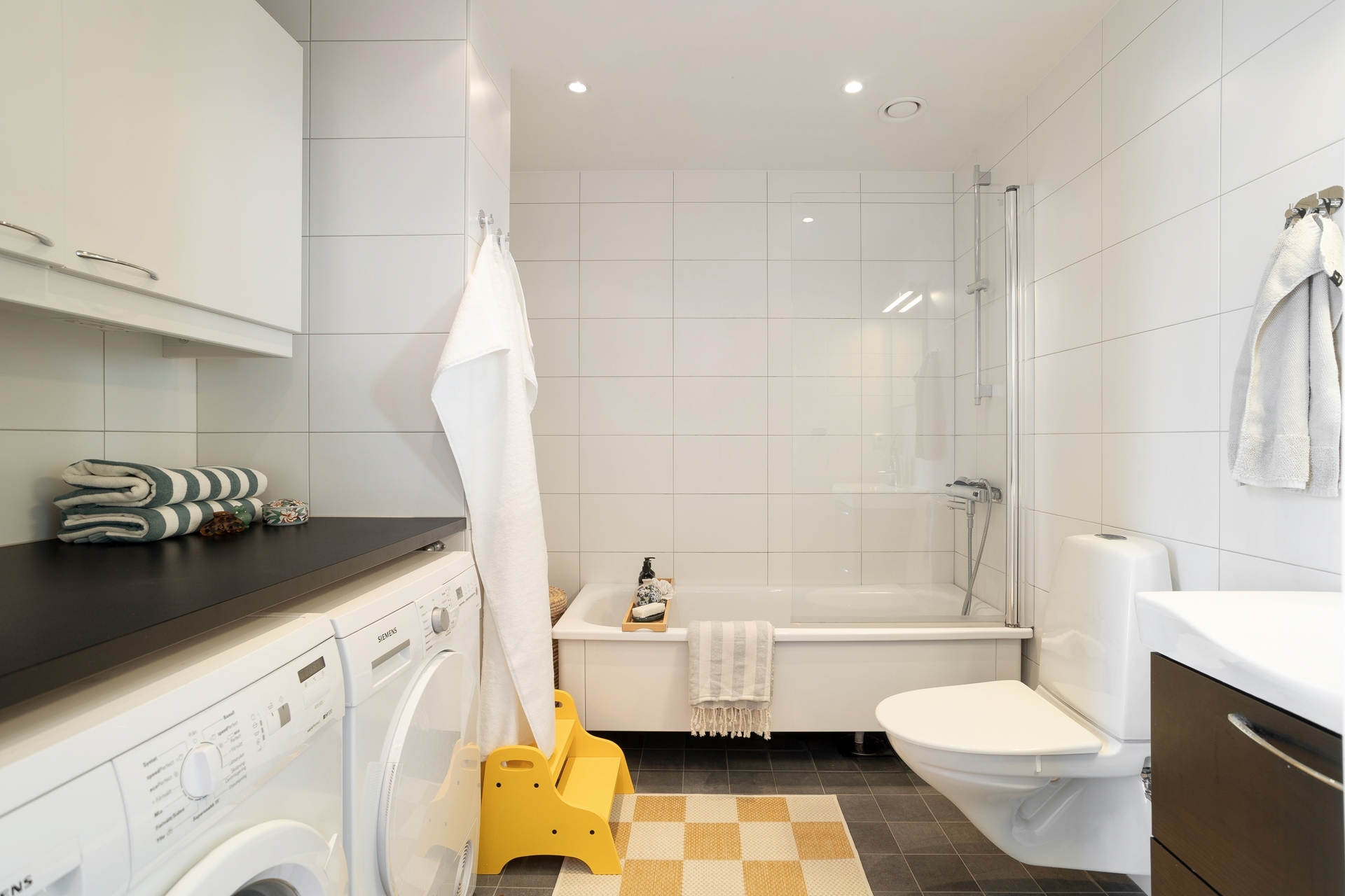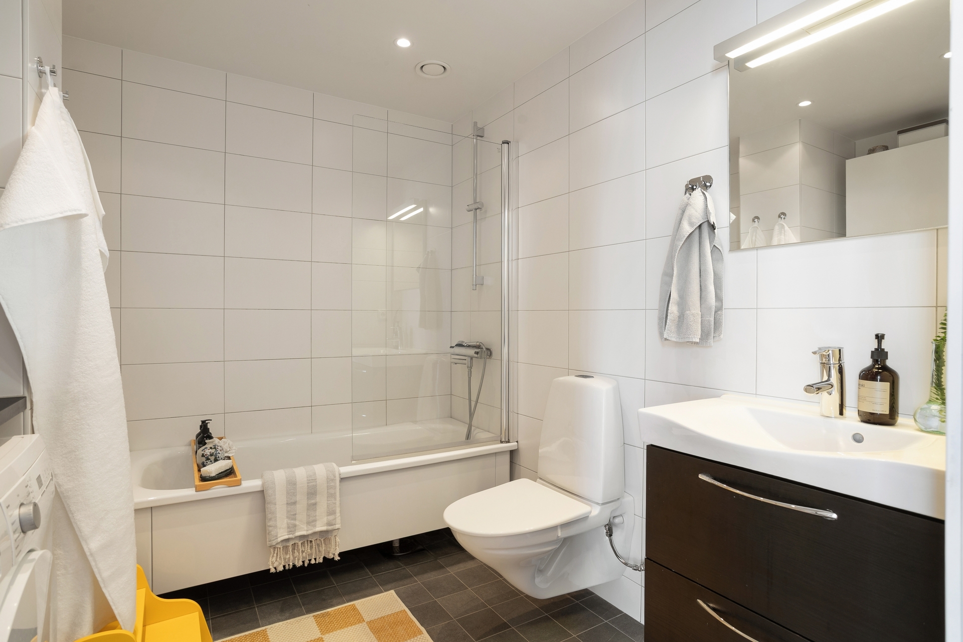 Modernt och stilrent badrum med vita kaklade väggar, vit fondvägg och grått klinkergolv med komfortvärme. Utrustningen består av badkar, vägghängd WC, handfat med kommod samt spegelskåp. Här finns även en praktisk tvättavdelning med tvättmaskin, torktumlare, arbetsbänk och överskåp. Infällda spotlights i tak bidrar till en exklusiv känsla.