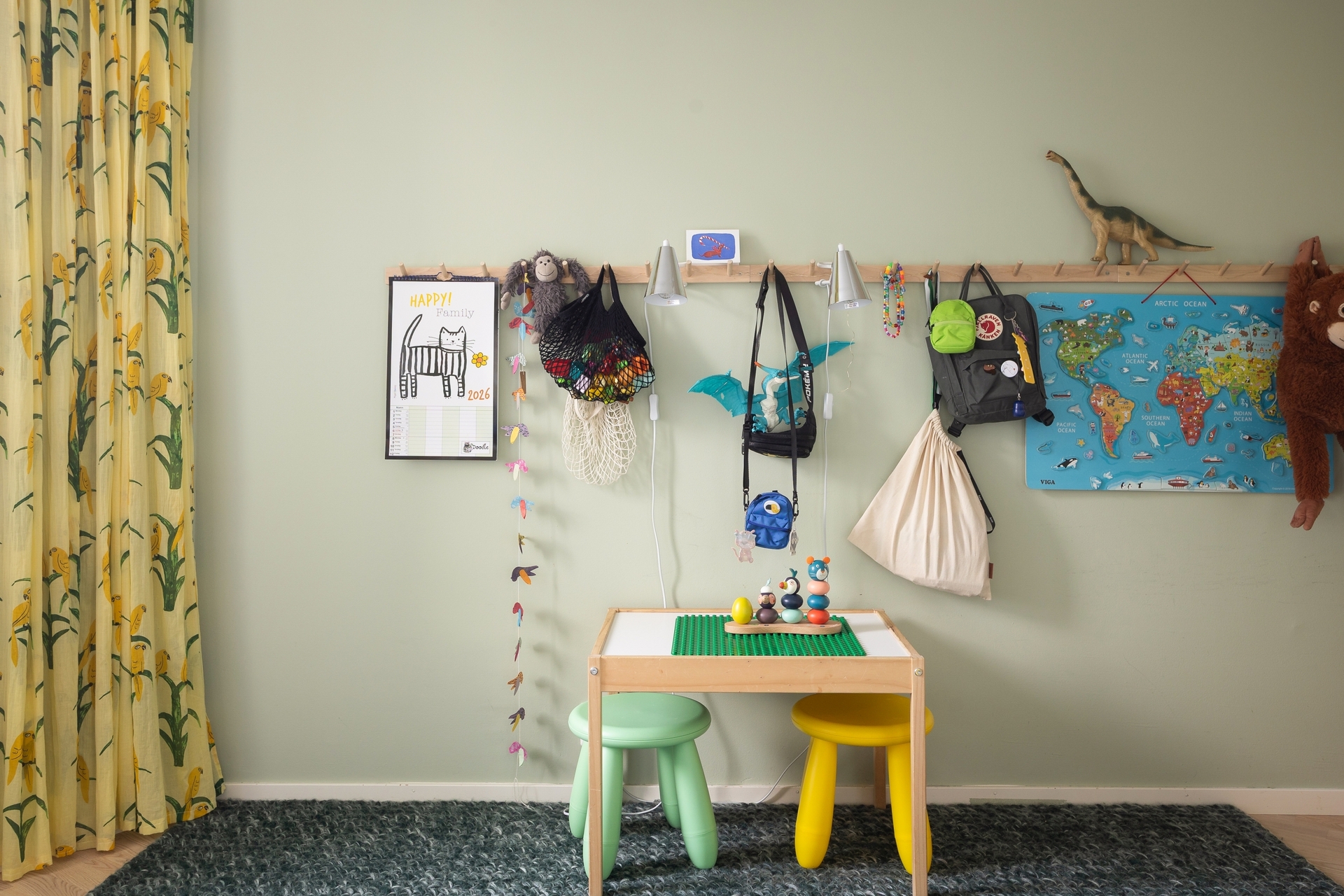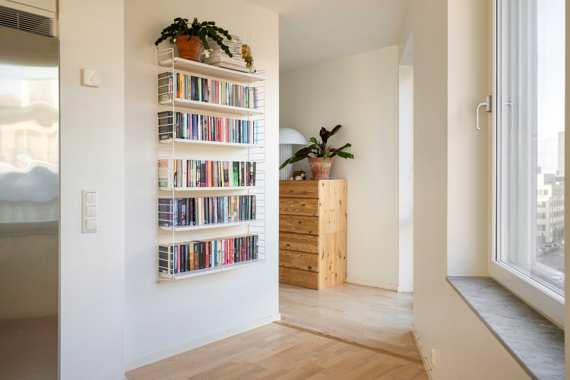 Den inre delen av hallen erbjuder flexibla ytor som med fördel kan användas som läshörna, extra förvaring eller arbetsplats – en smart lösning för den som behöver ett hemmakontor.