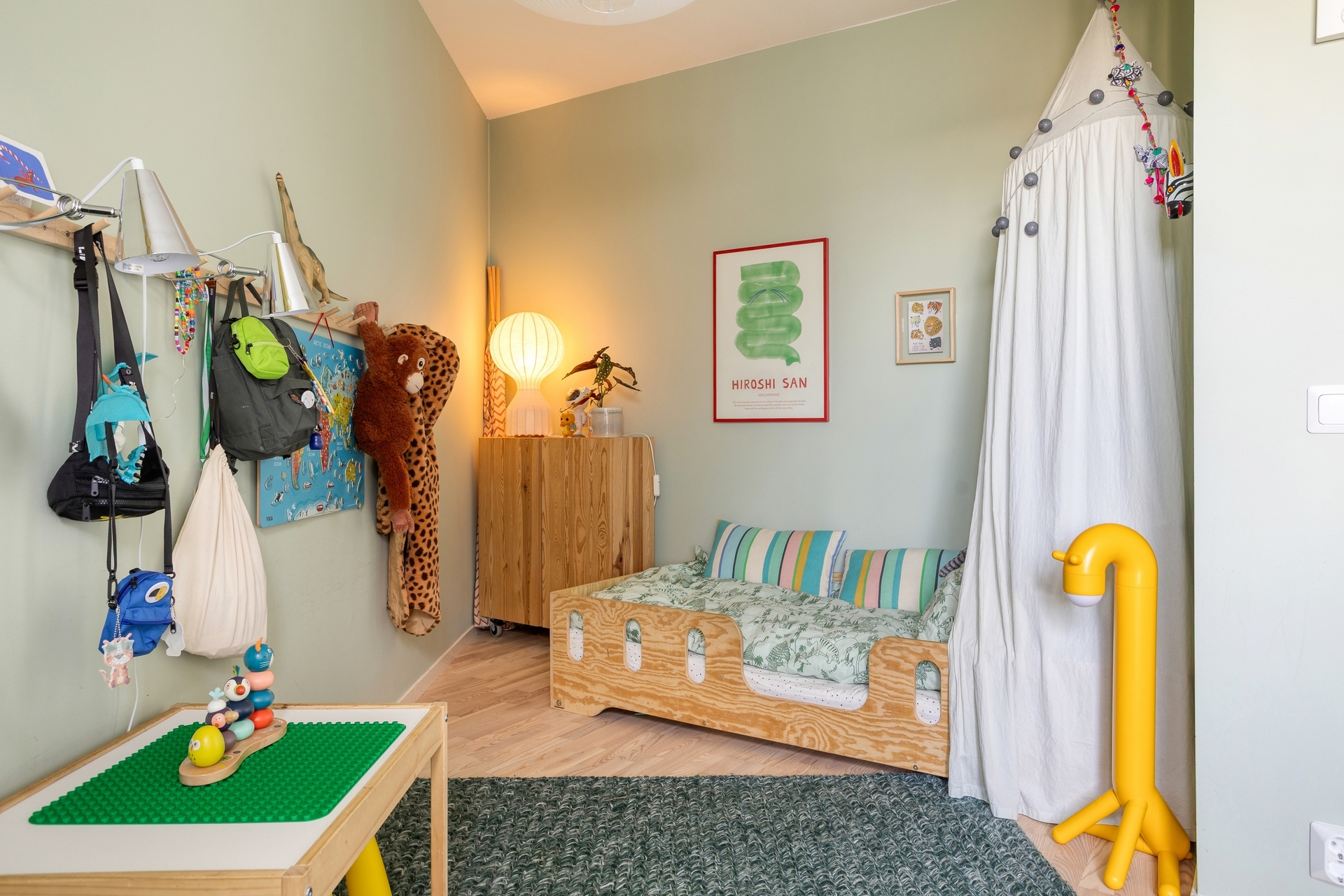 Trivsamt sovrum i rogivande grön kulör med utrymme för större säng. Här finns även möjlighet att komplettera med garderober eller annan förvaring efter behov.